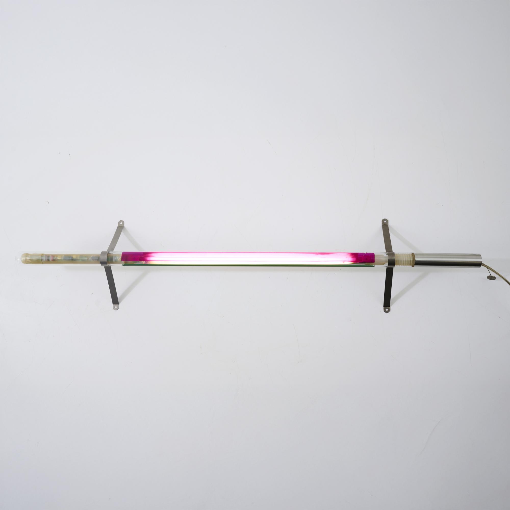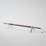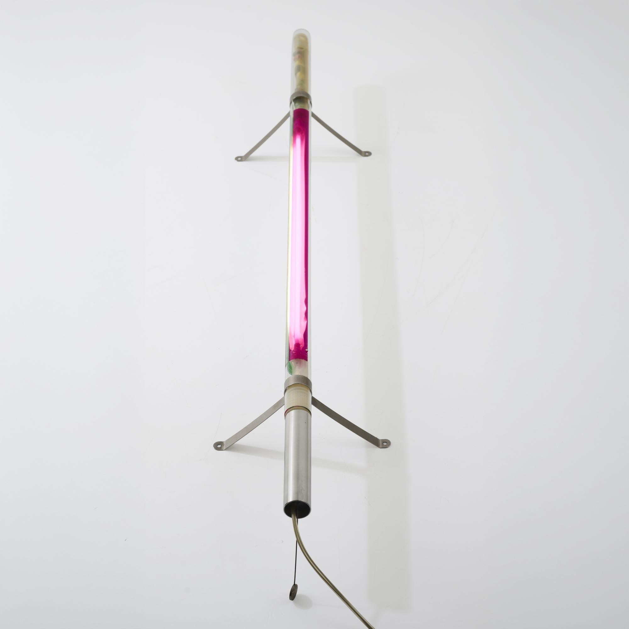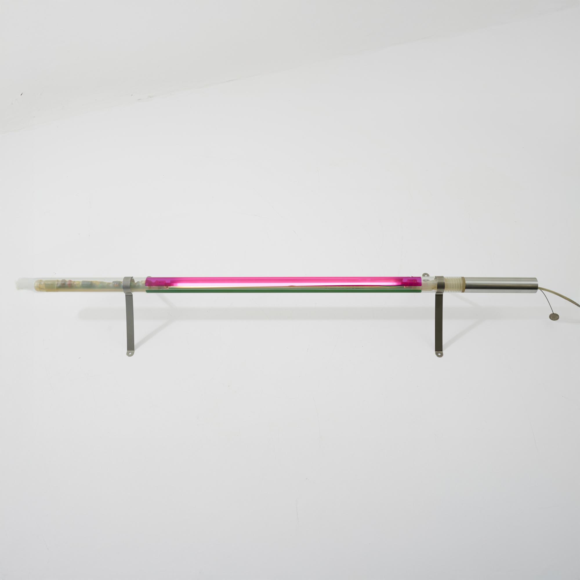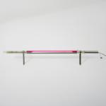 Sheet metal, metal tube, borosilicate glass tube, pink and green.