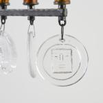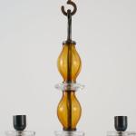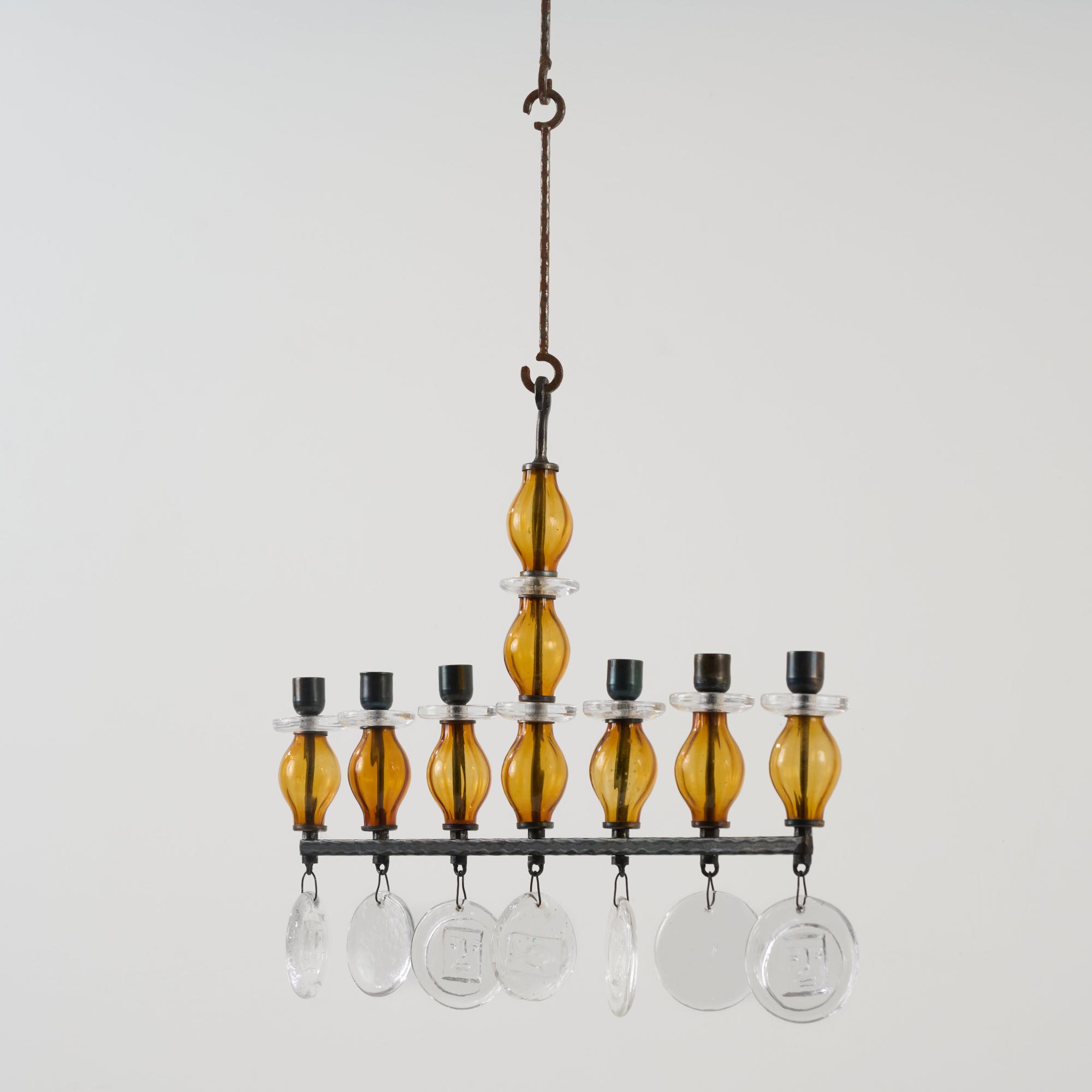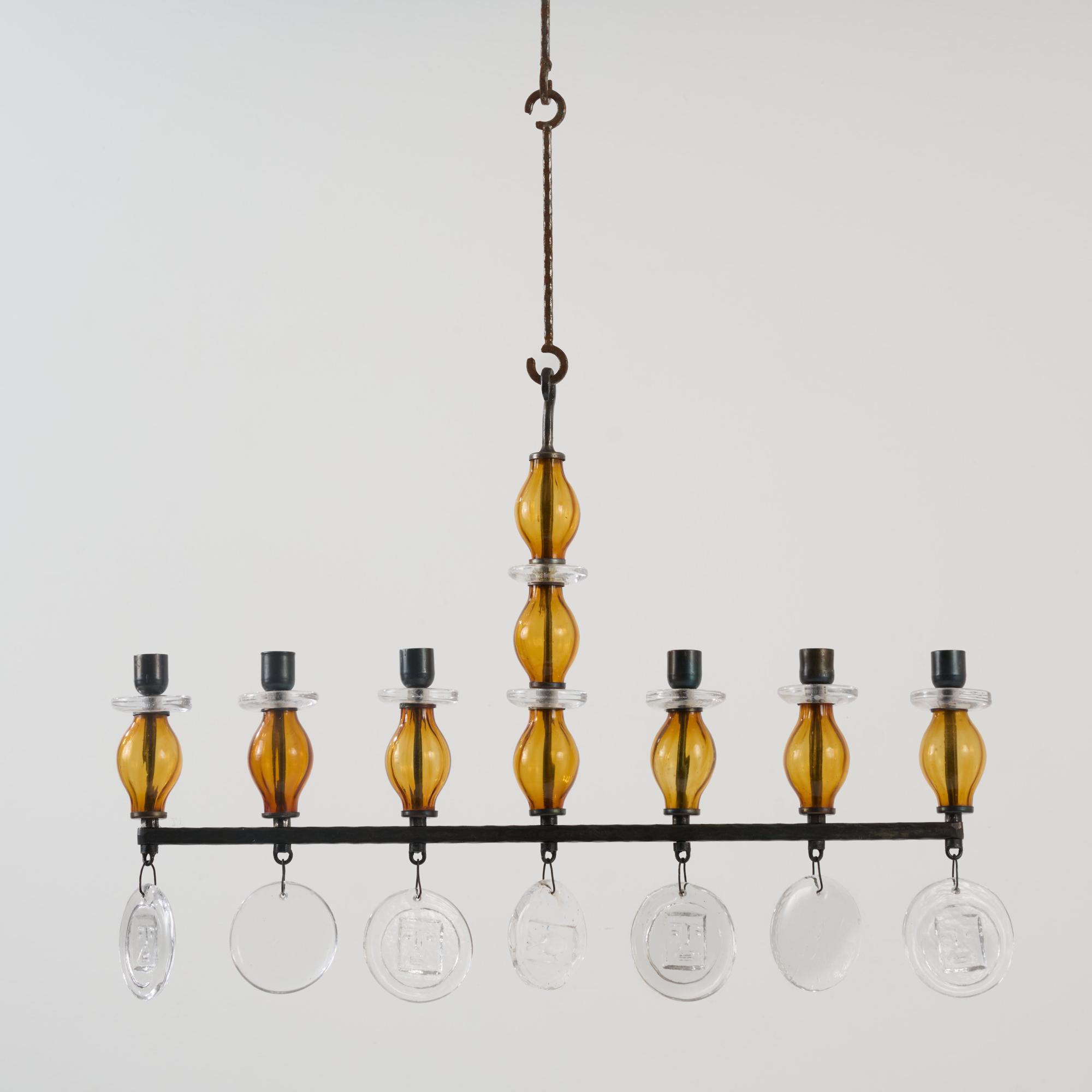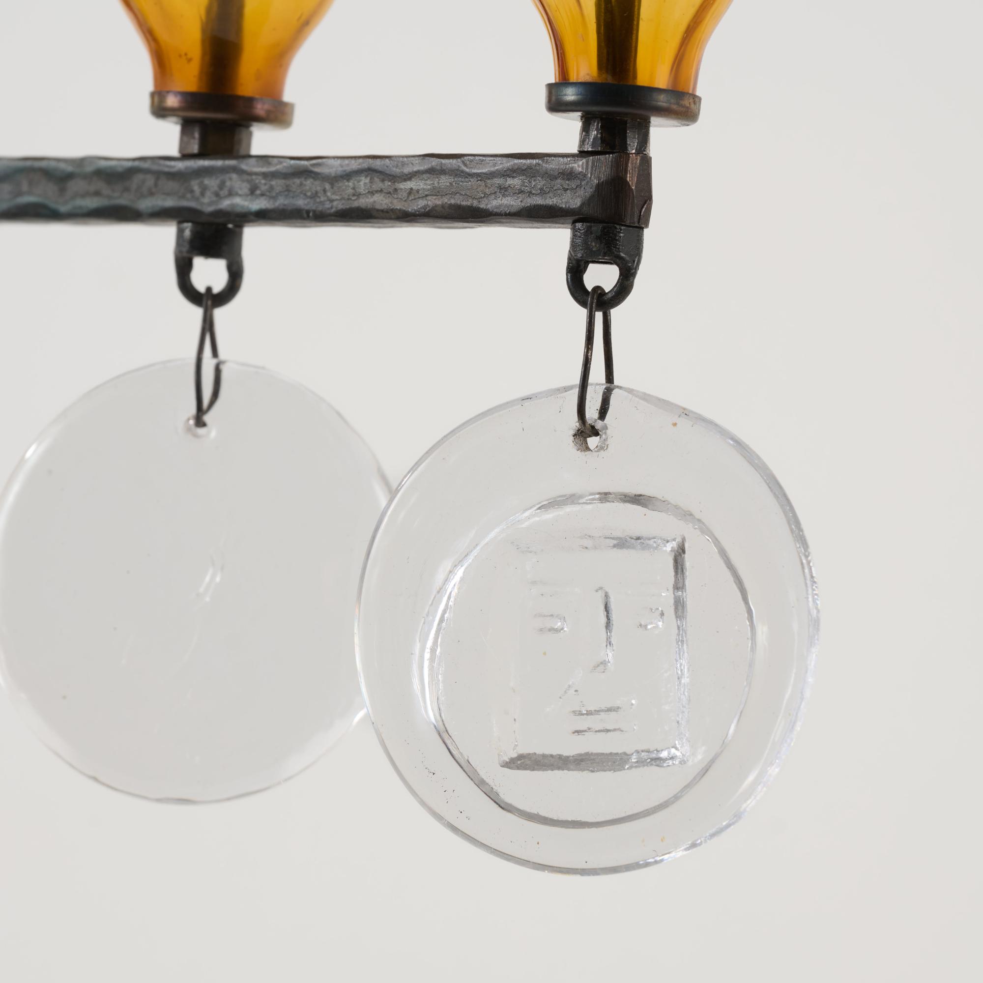 Forged metal, blackened, sheet metal, colorless and amber glass.
