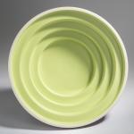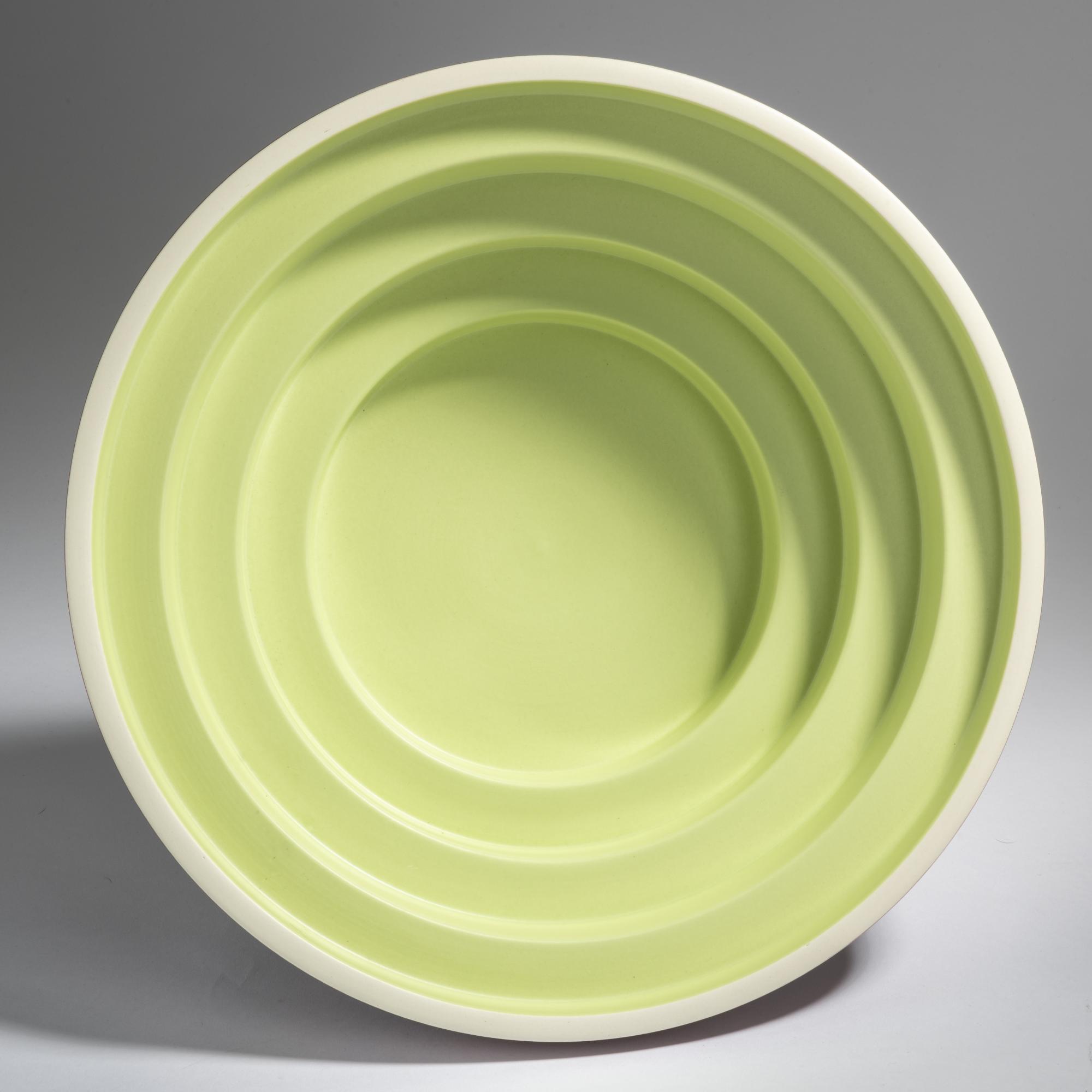 Earthenware, glazed in lime green, raspberry red, white and metallic gray.