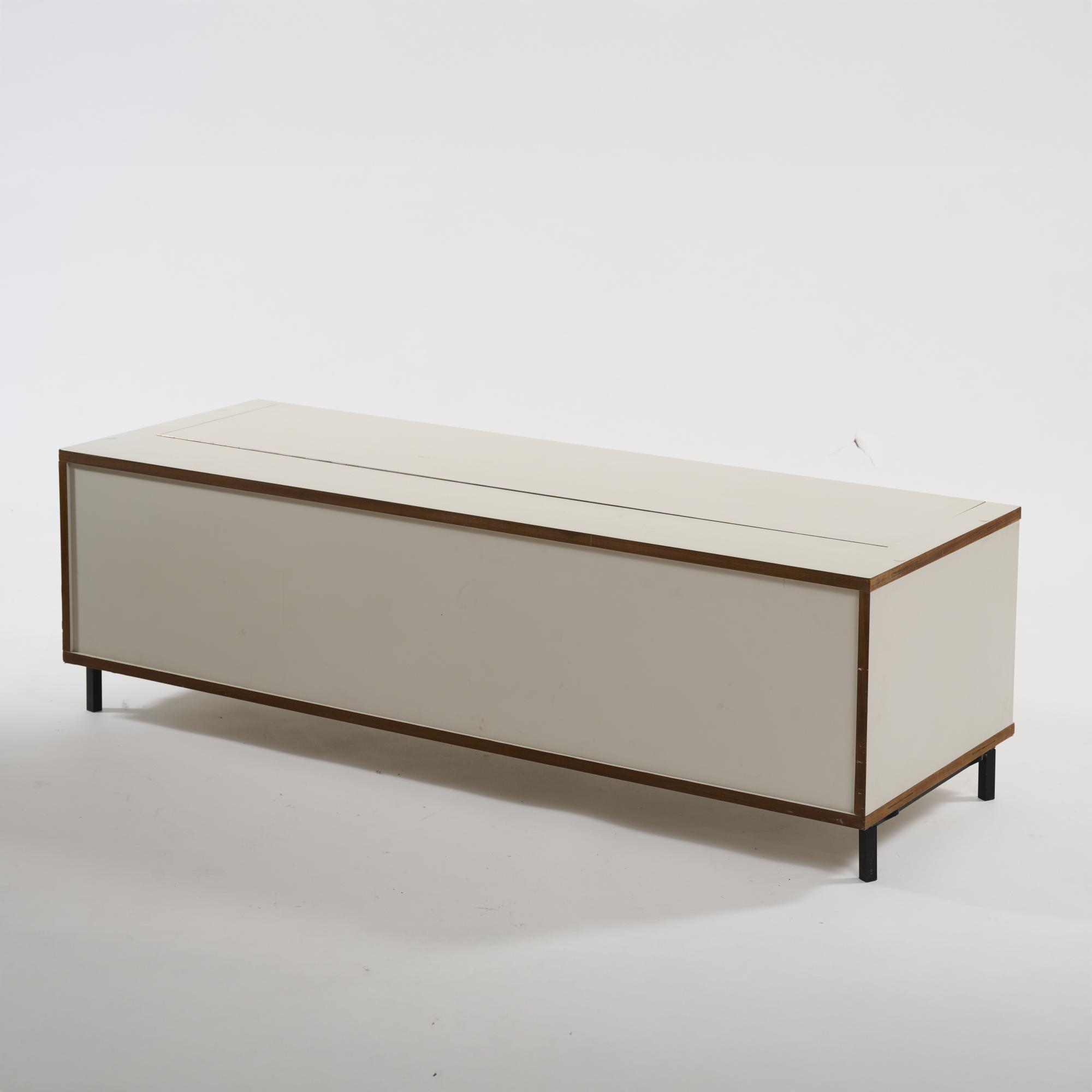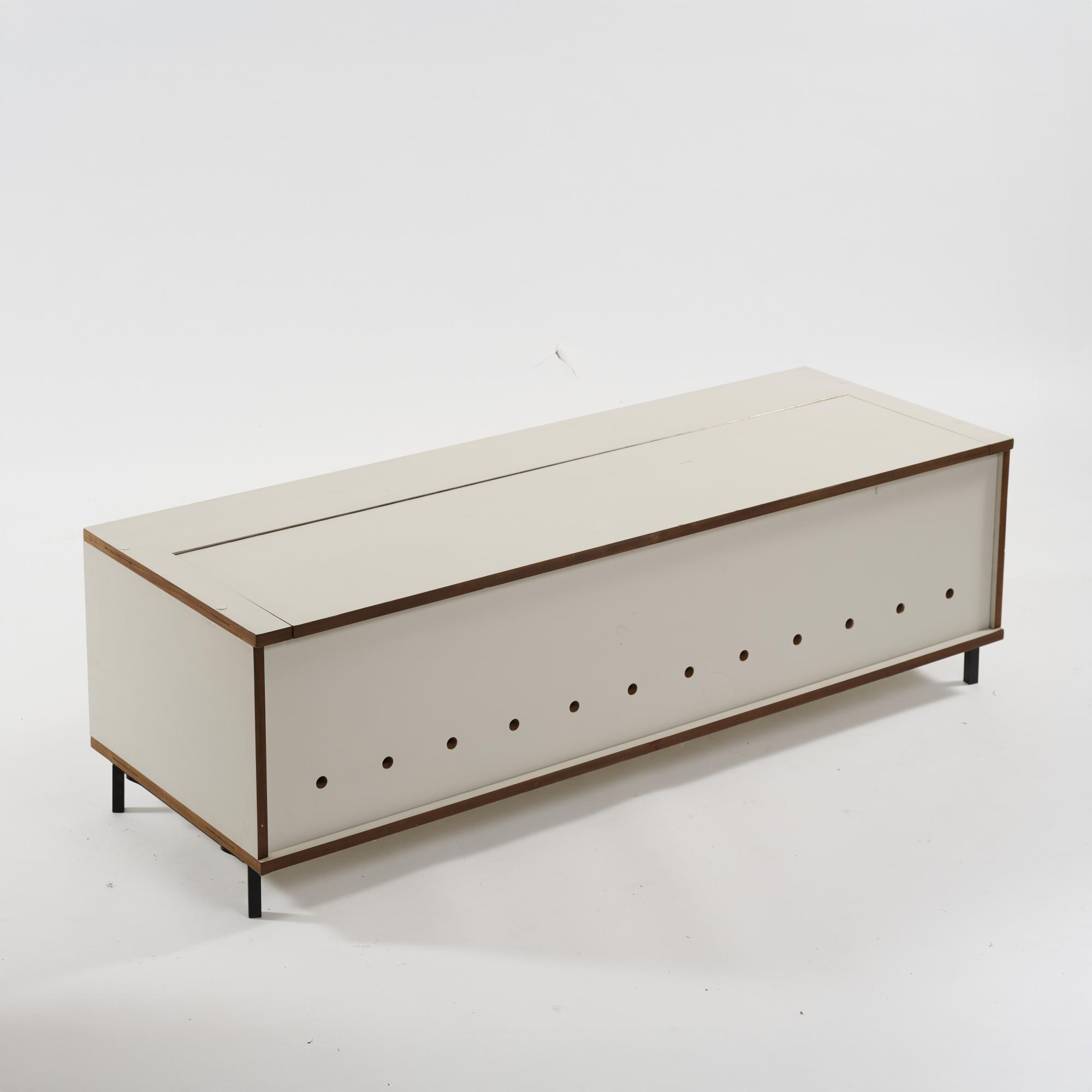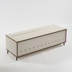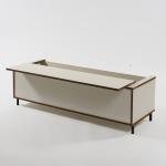 Wooden box construction, chipboard, white laminate, steel tube, lacquered black.