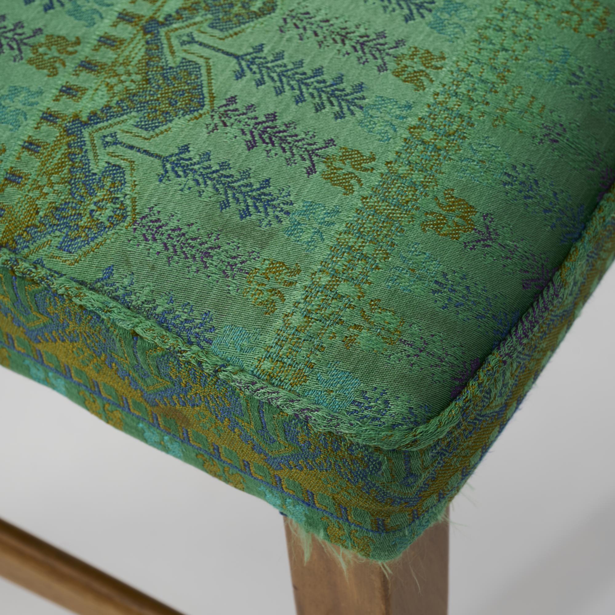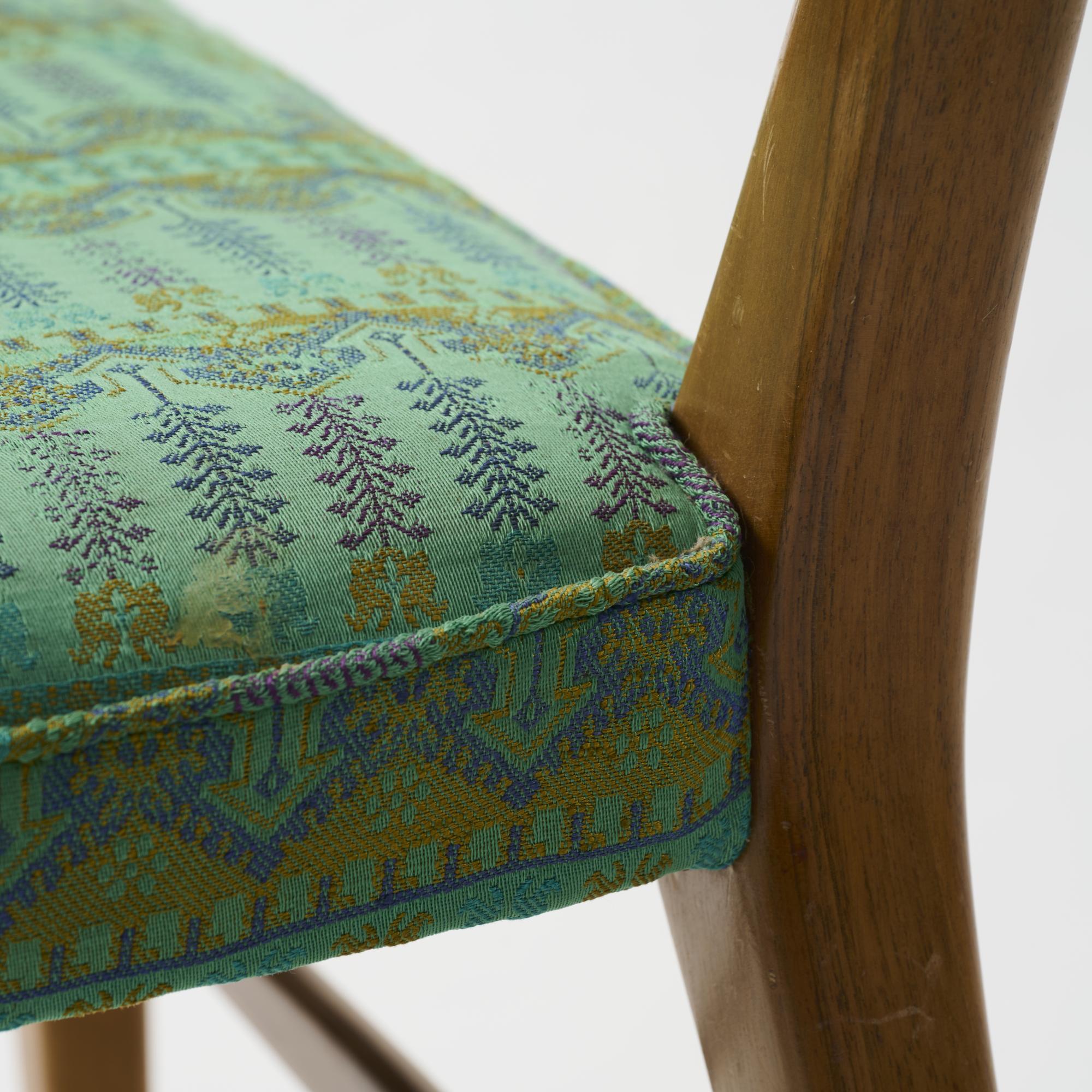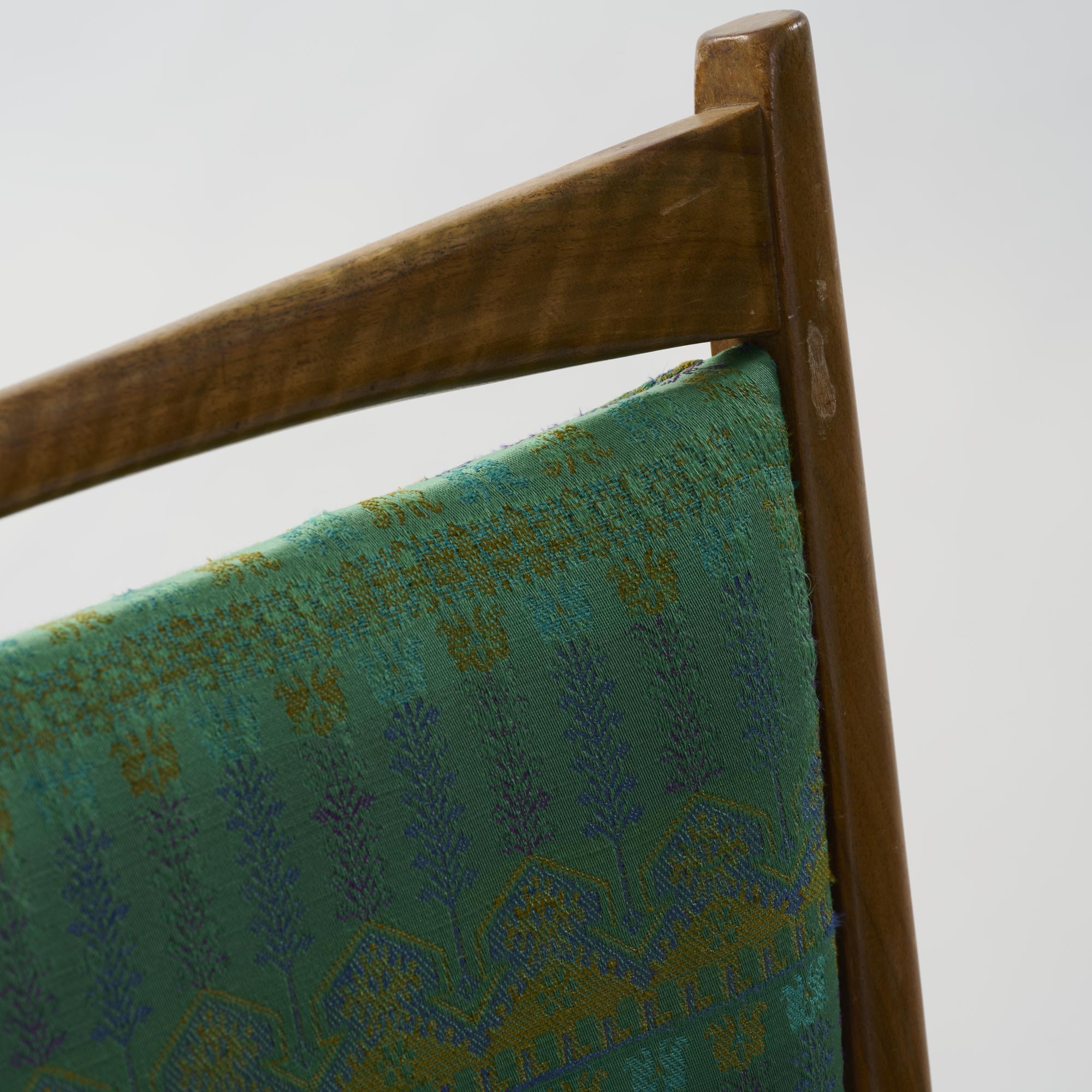 Walnut, dark varnish, green textile cover.