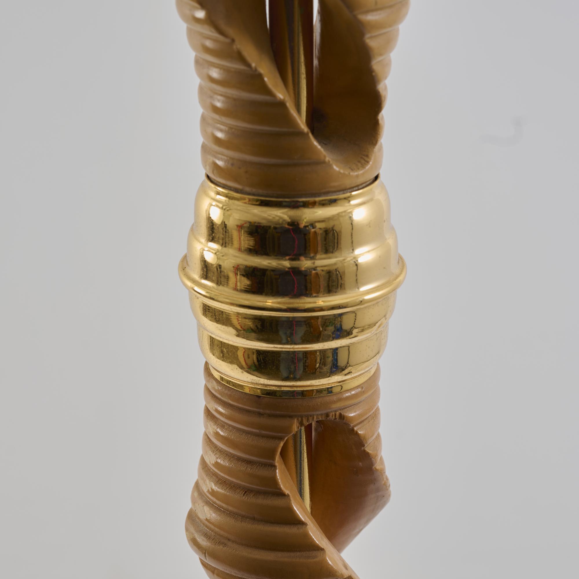 Elm wood, turned, brass sheet, beige fabric shade with floral embroidery and gold-colored border.