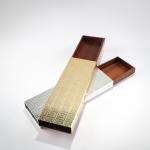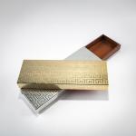 Pressed metal sheet with meander decoration, silver and gold colored, mahogany.