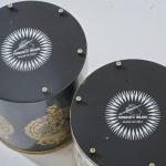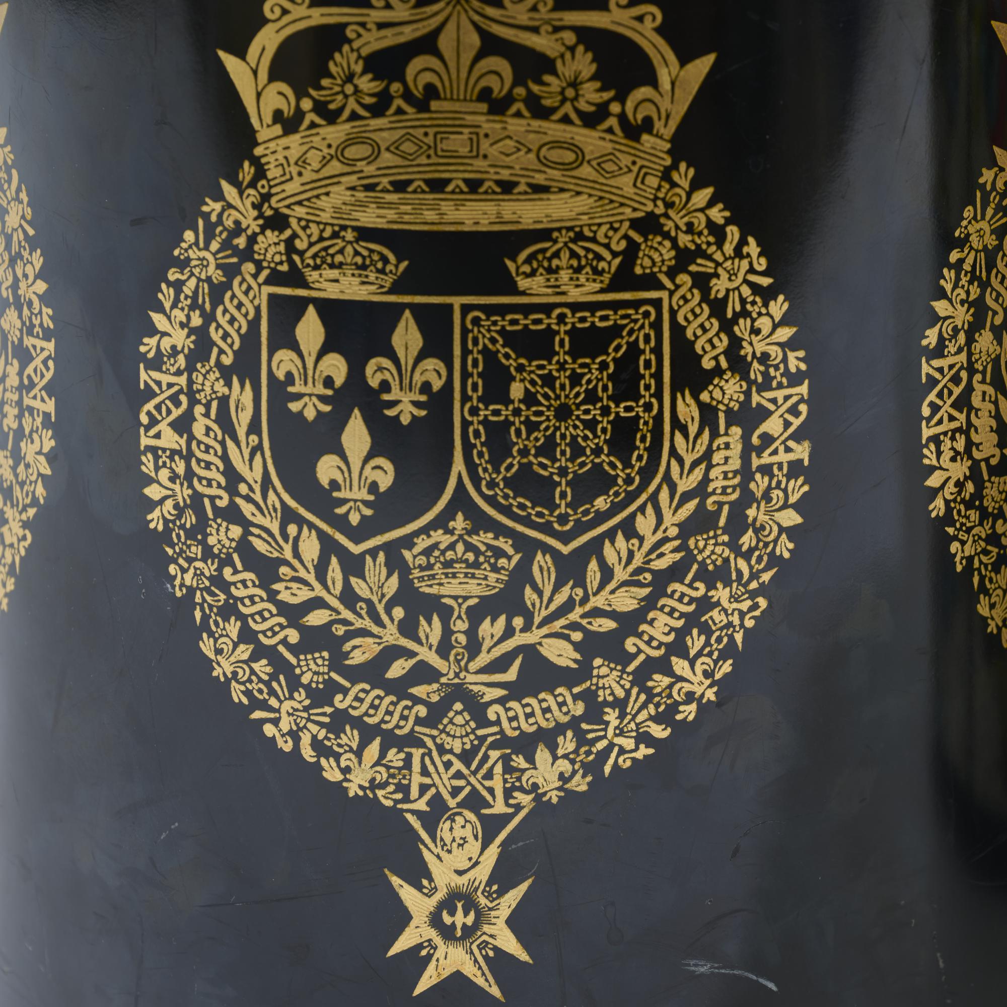 Black lacquered sheet metal with gold lithographic decoration on brass sheet.