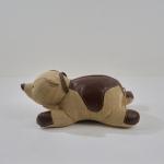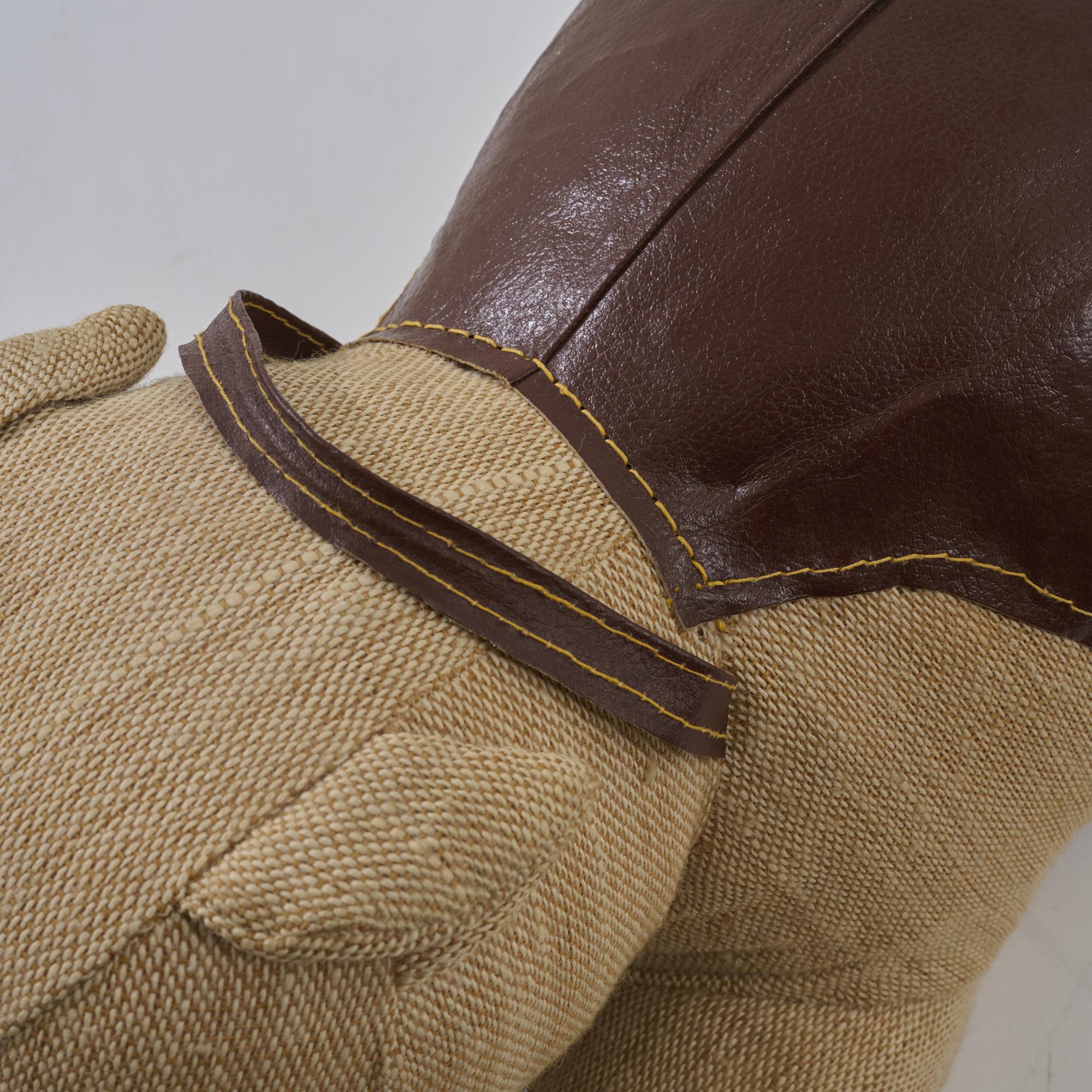 Burlap, leather, brown, black plastic eyes.