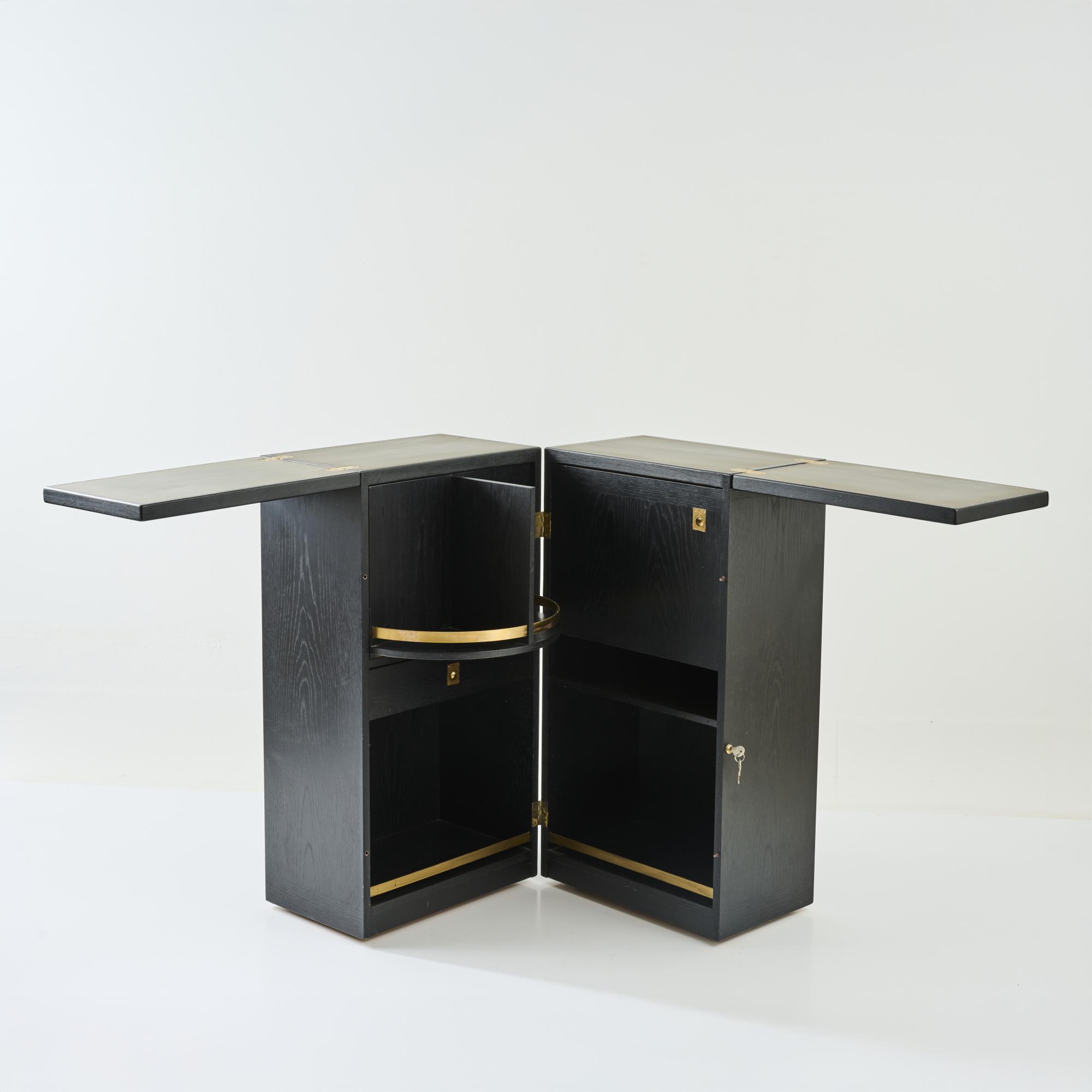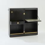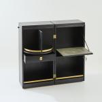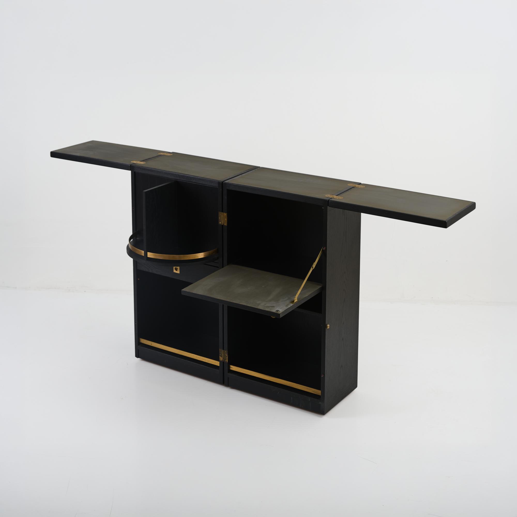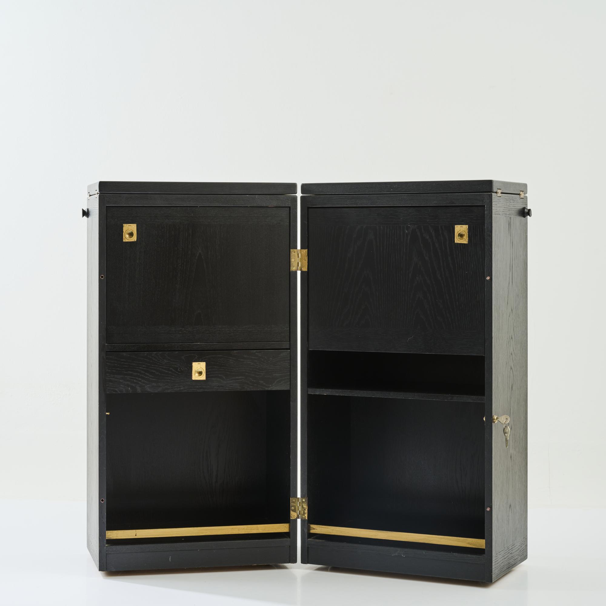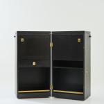 Ash wood, plywood with ash veneer, black painted, partially grey lacquered, brass fittings.