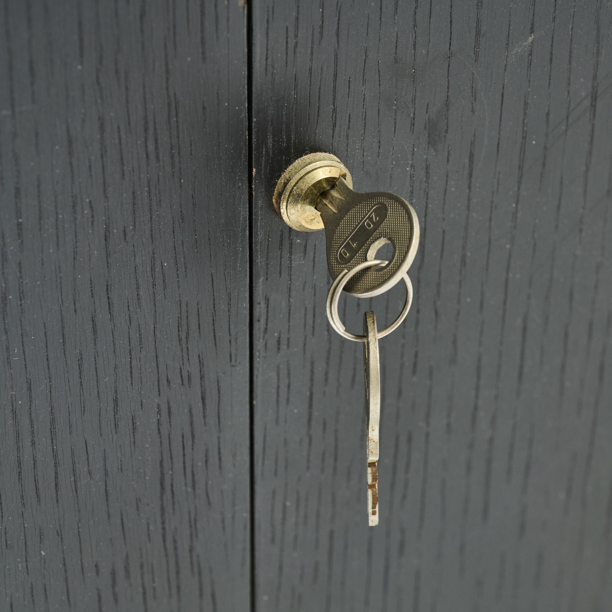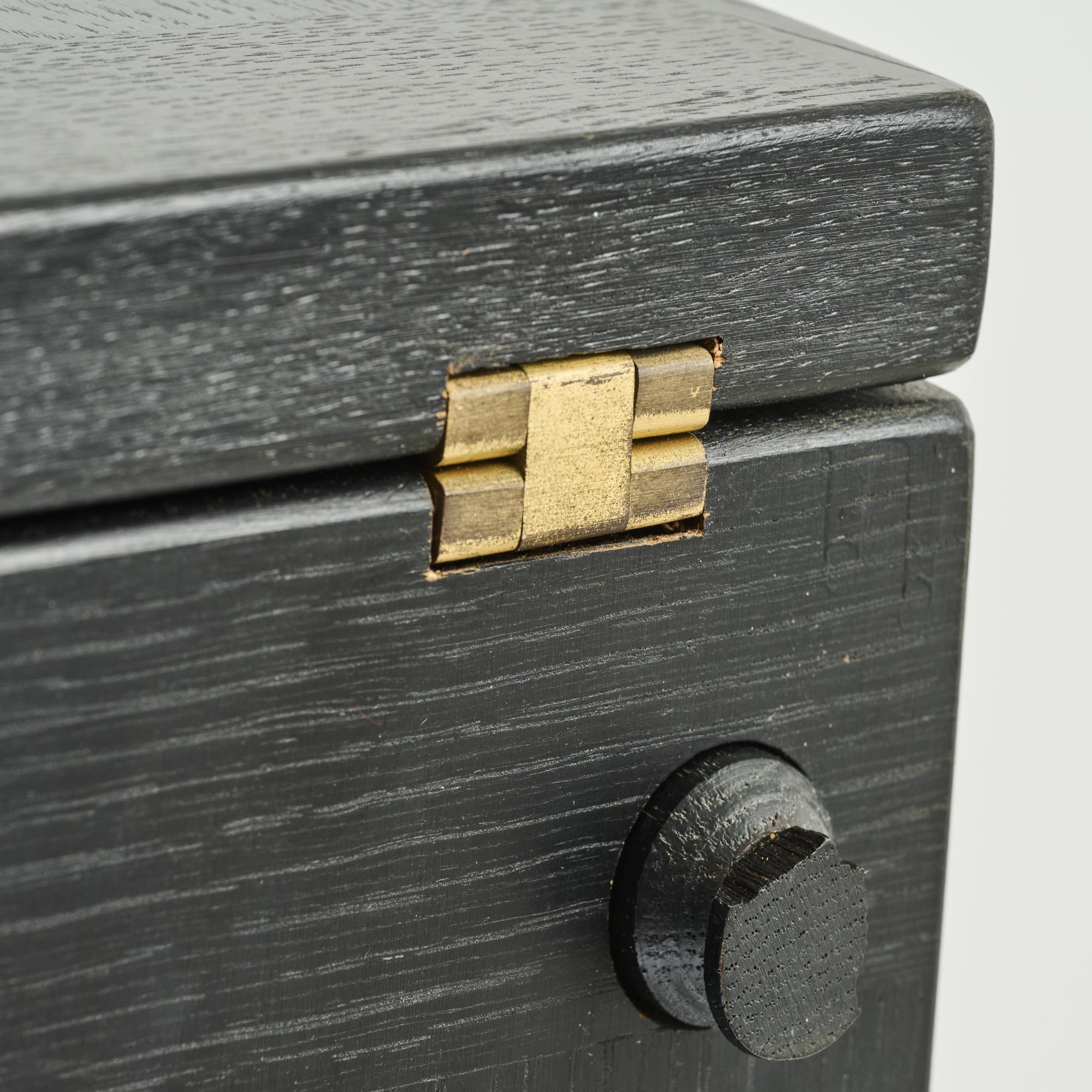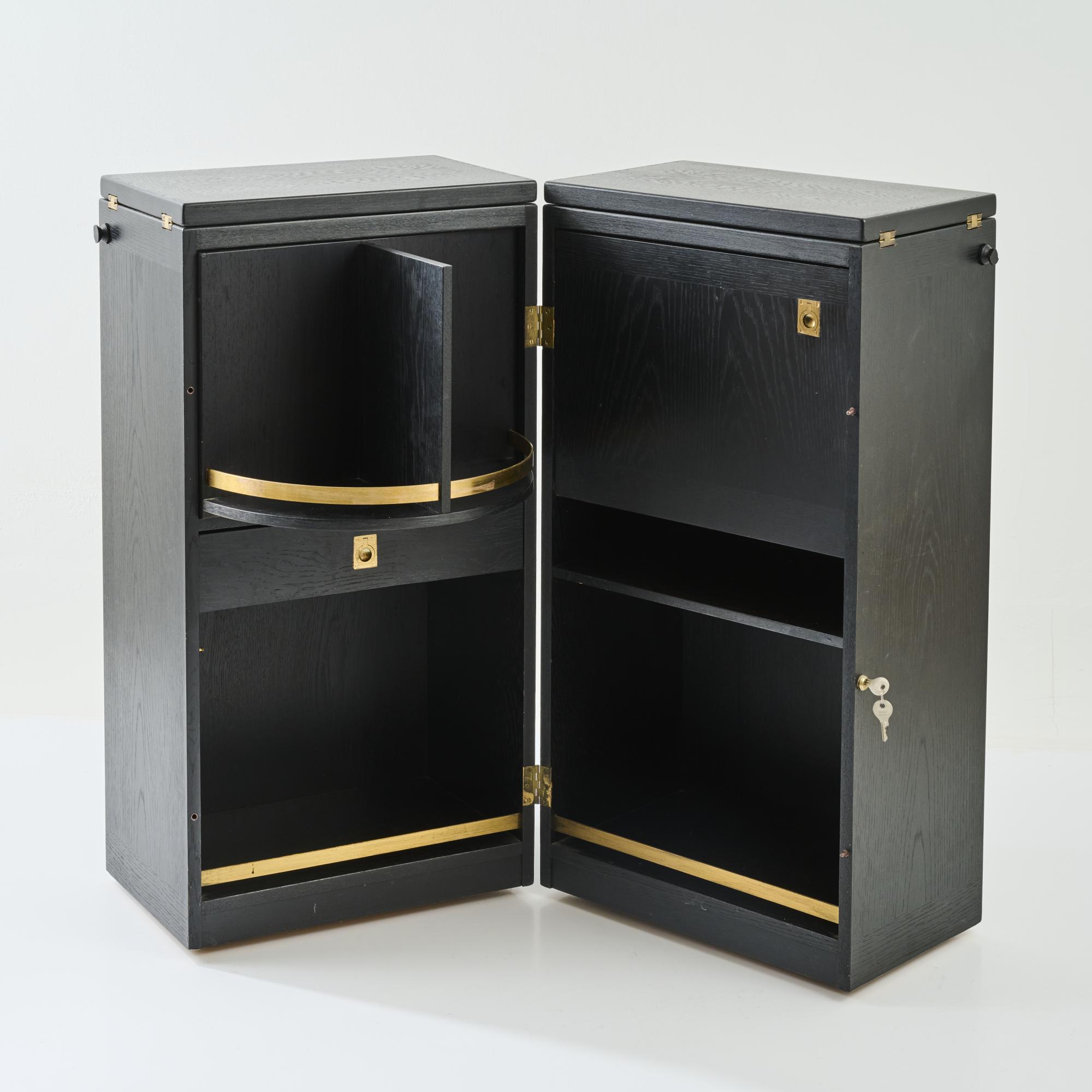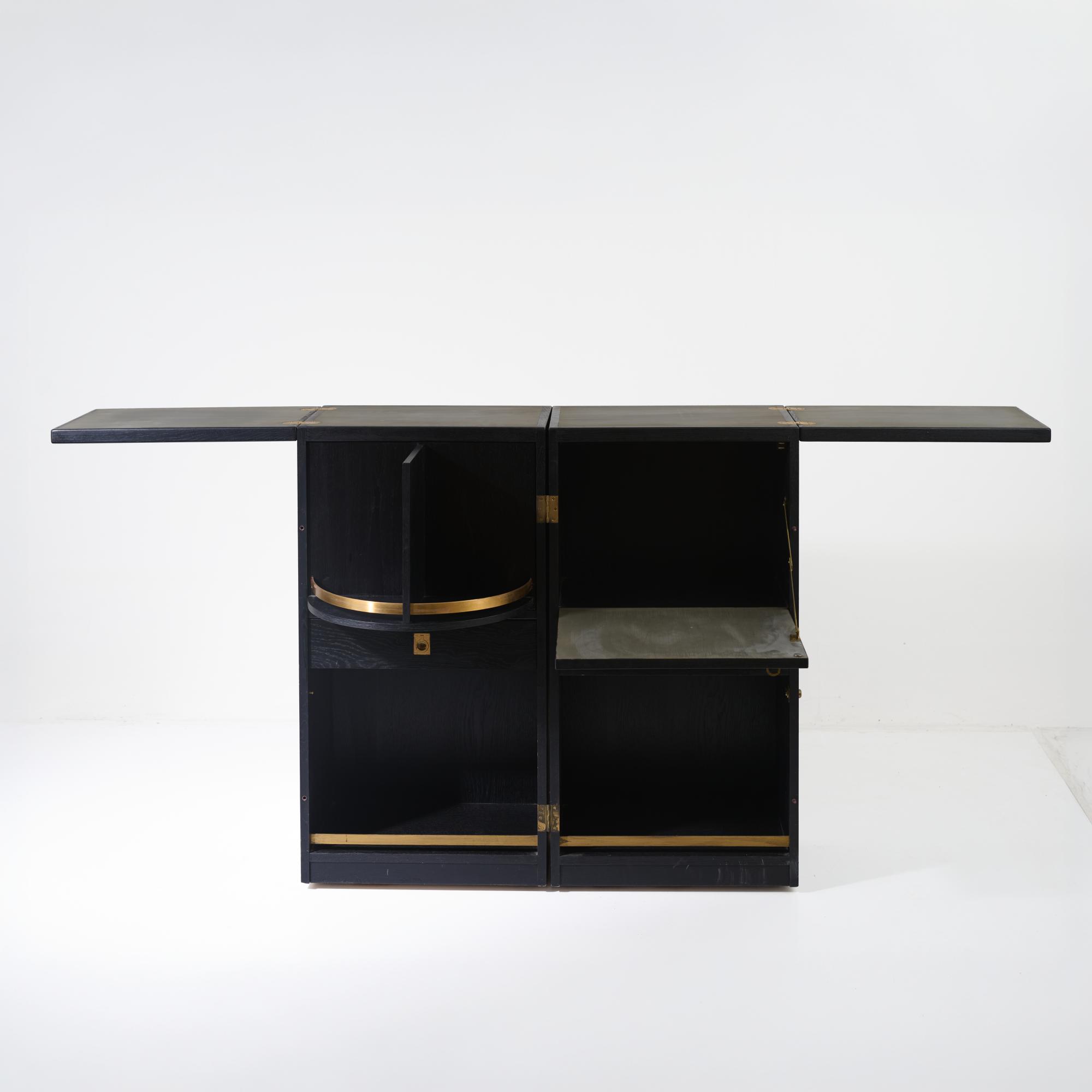 Ash wood, plywood with ash veneer, black painted, partially grey lacquered, brass fittings.