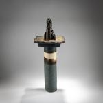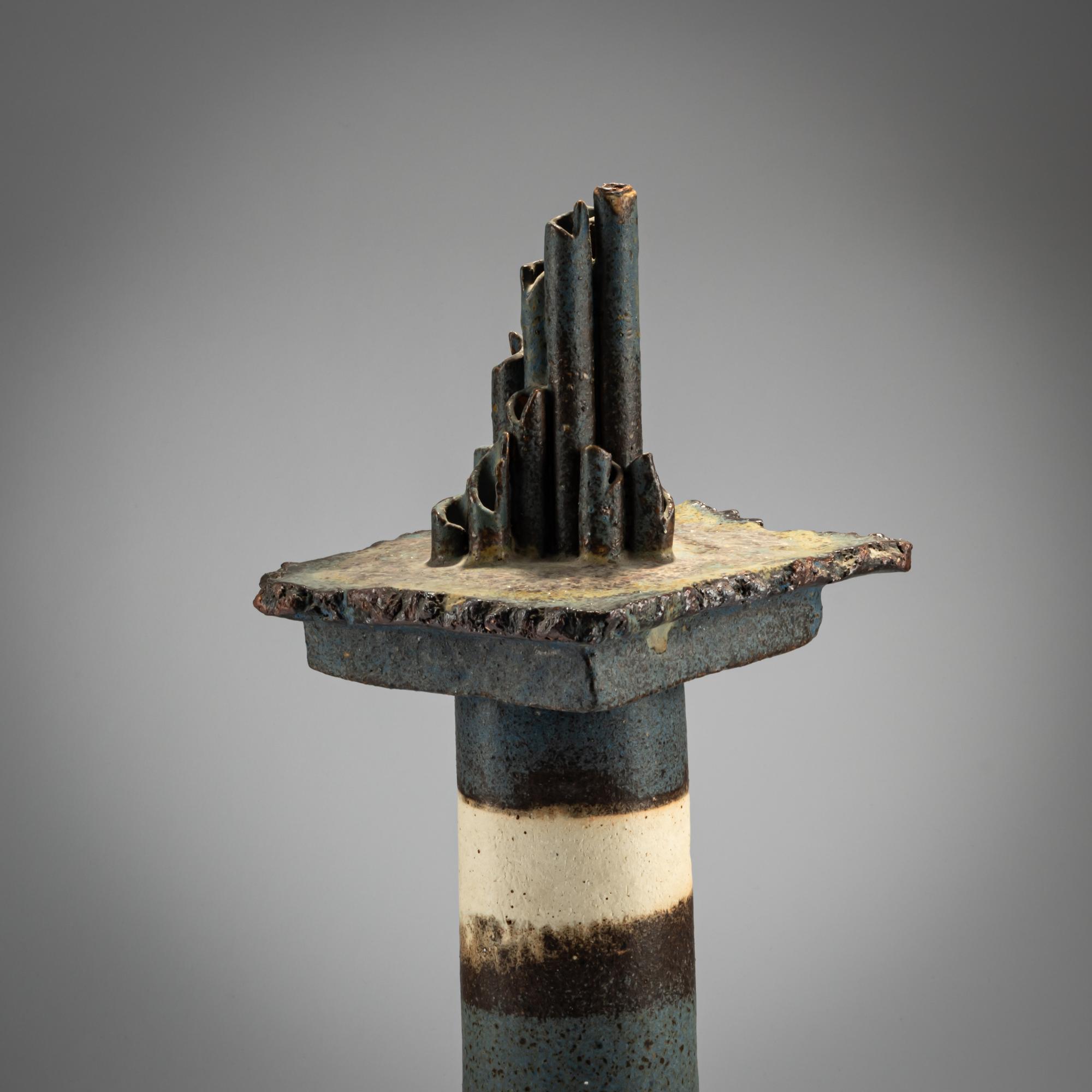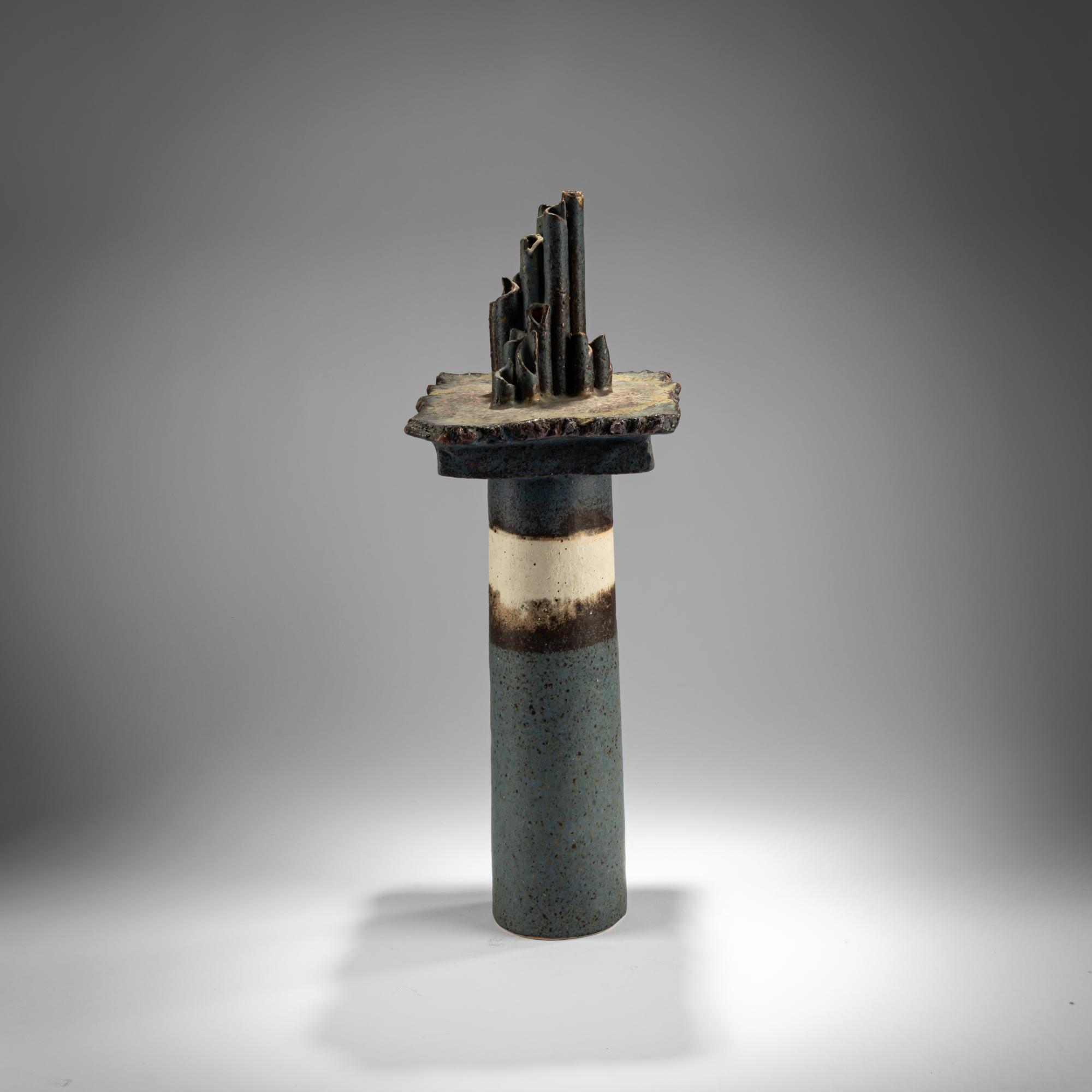 Stoneware, dark brown and light blue iron oxide glaze over white.