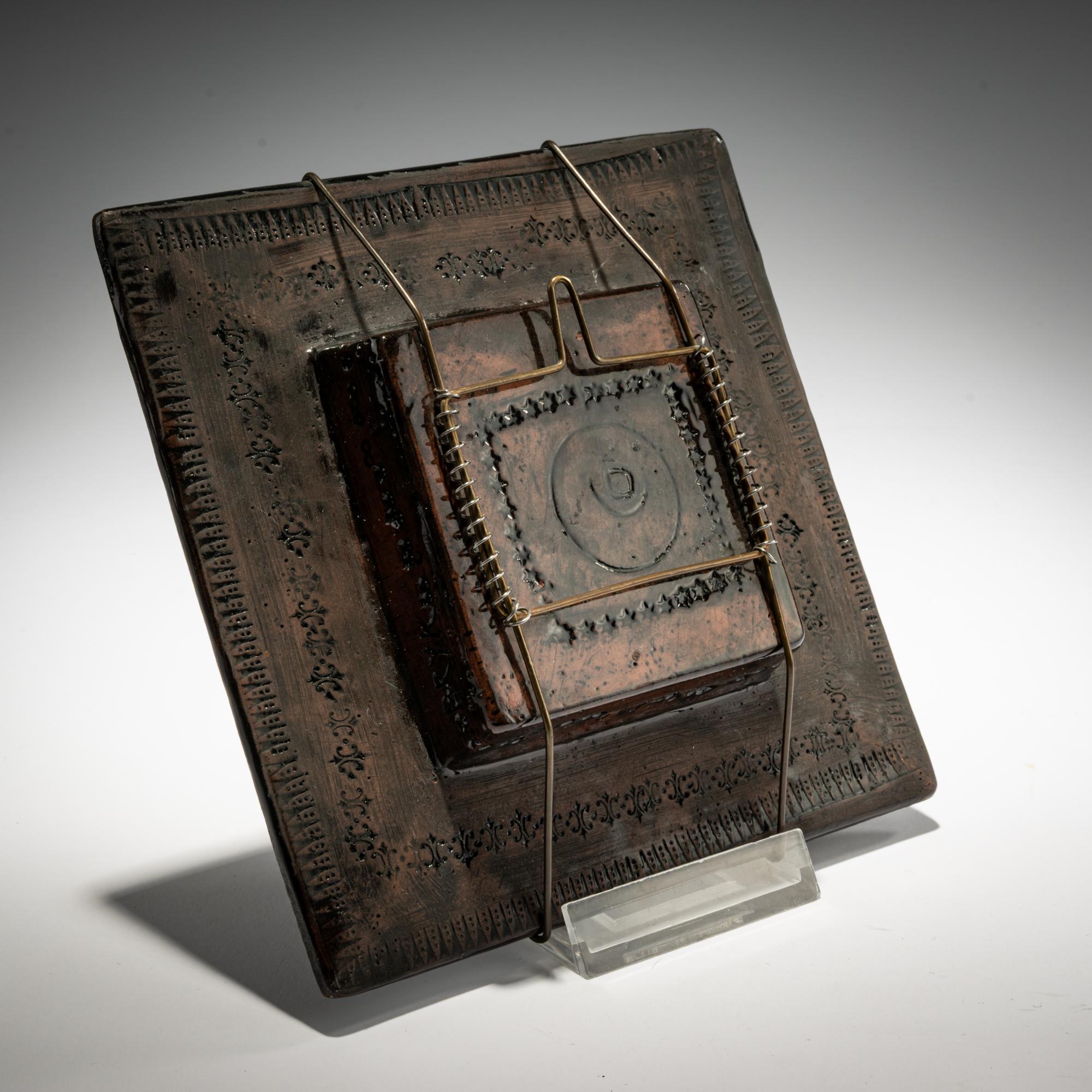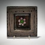 Dark faience, incised, polychrome overglaze.