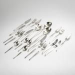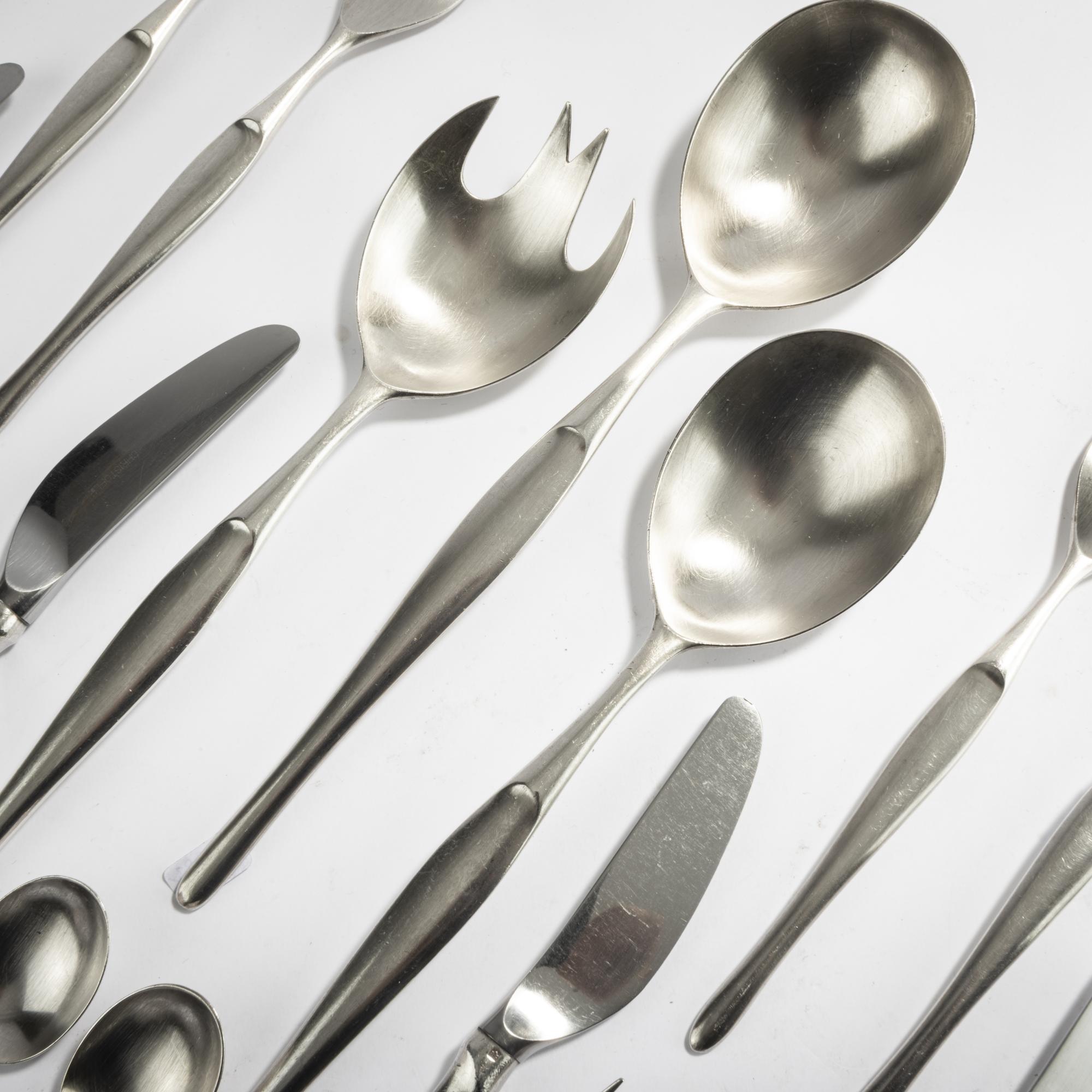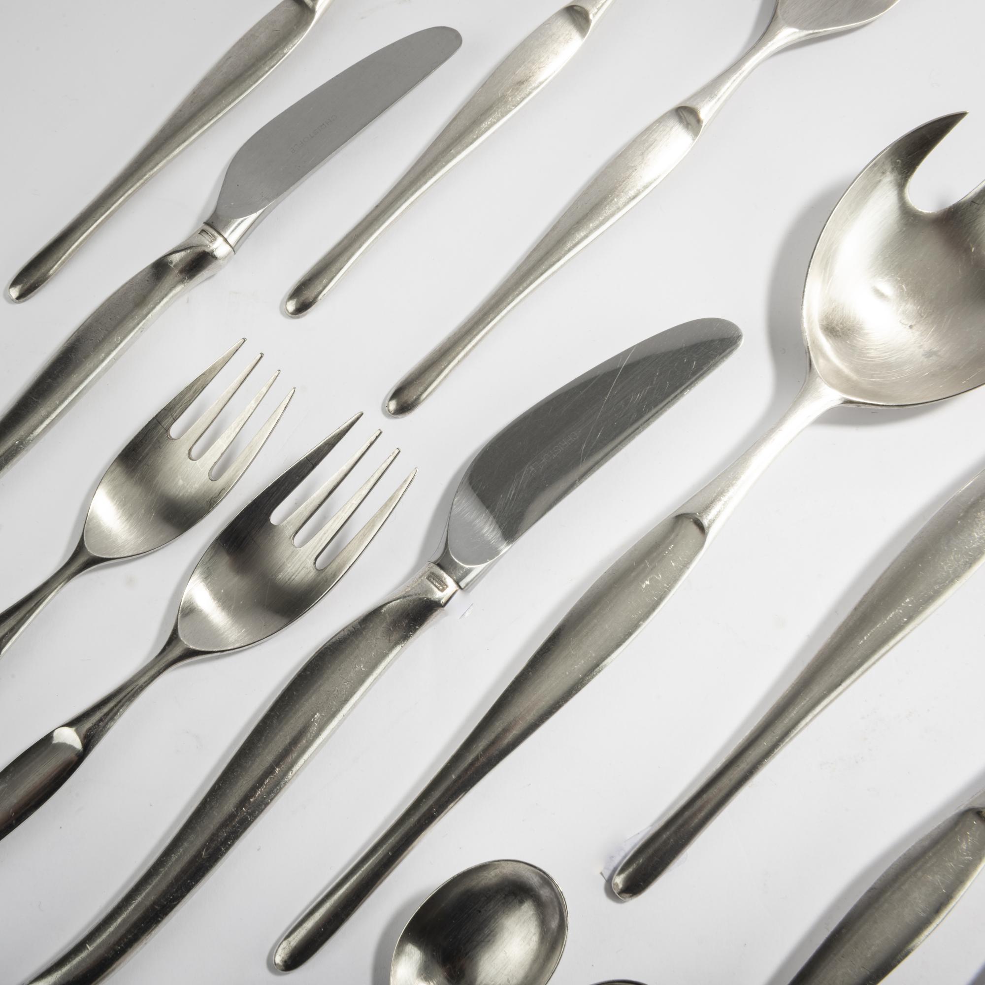 57 pieces: Three serving spoons: L. 24.8 cm; 14 table forks: L. 19 cm, four forks: L. 19 cm, twelve table knives: L. 21 cm, five fish knives: L. 21.5 cm, eleven butter knives: L. 18 cm, eight dessert spoons: L. 13.5 cm. Made by Christofle, Paris. Nickel silver, silver plated. Marked: CHRISTOFLE FRANCE.