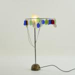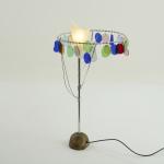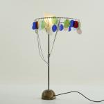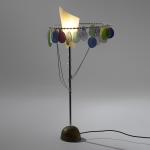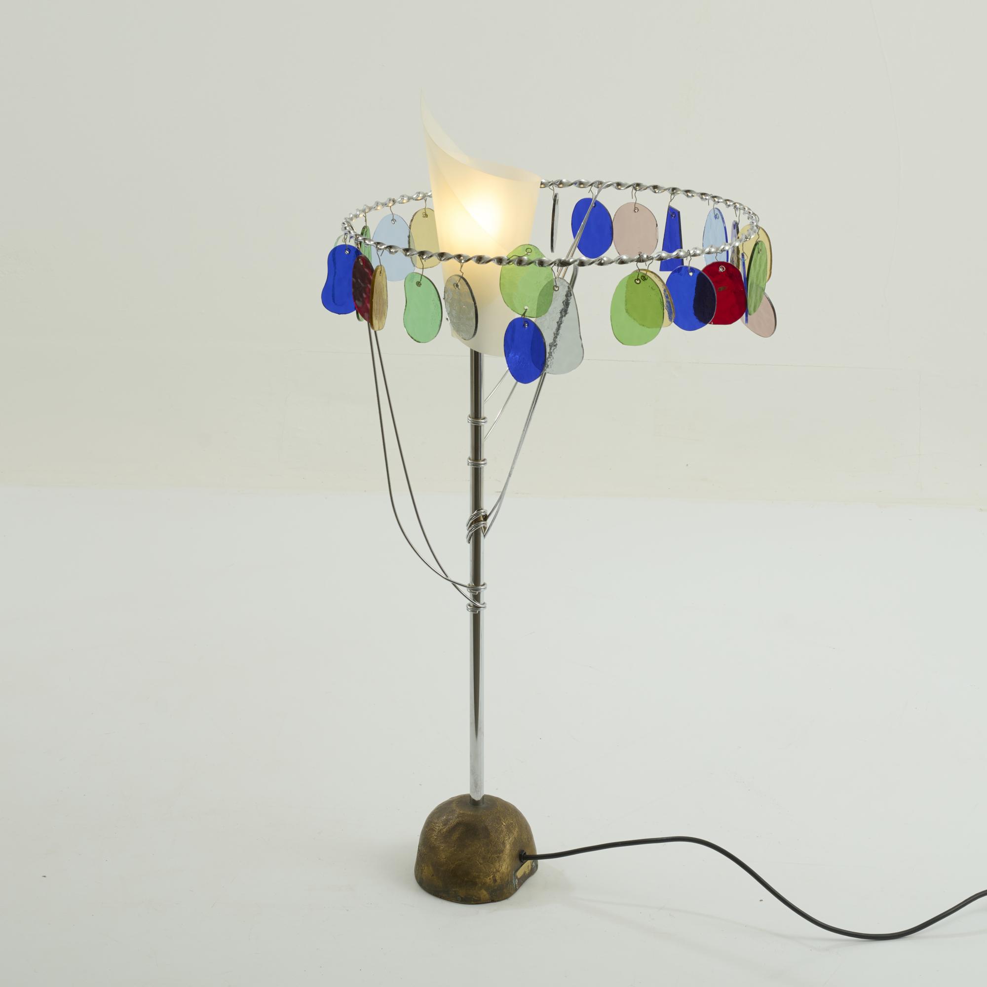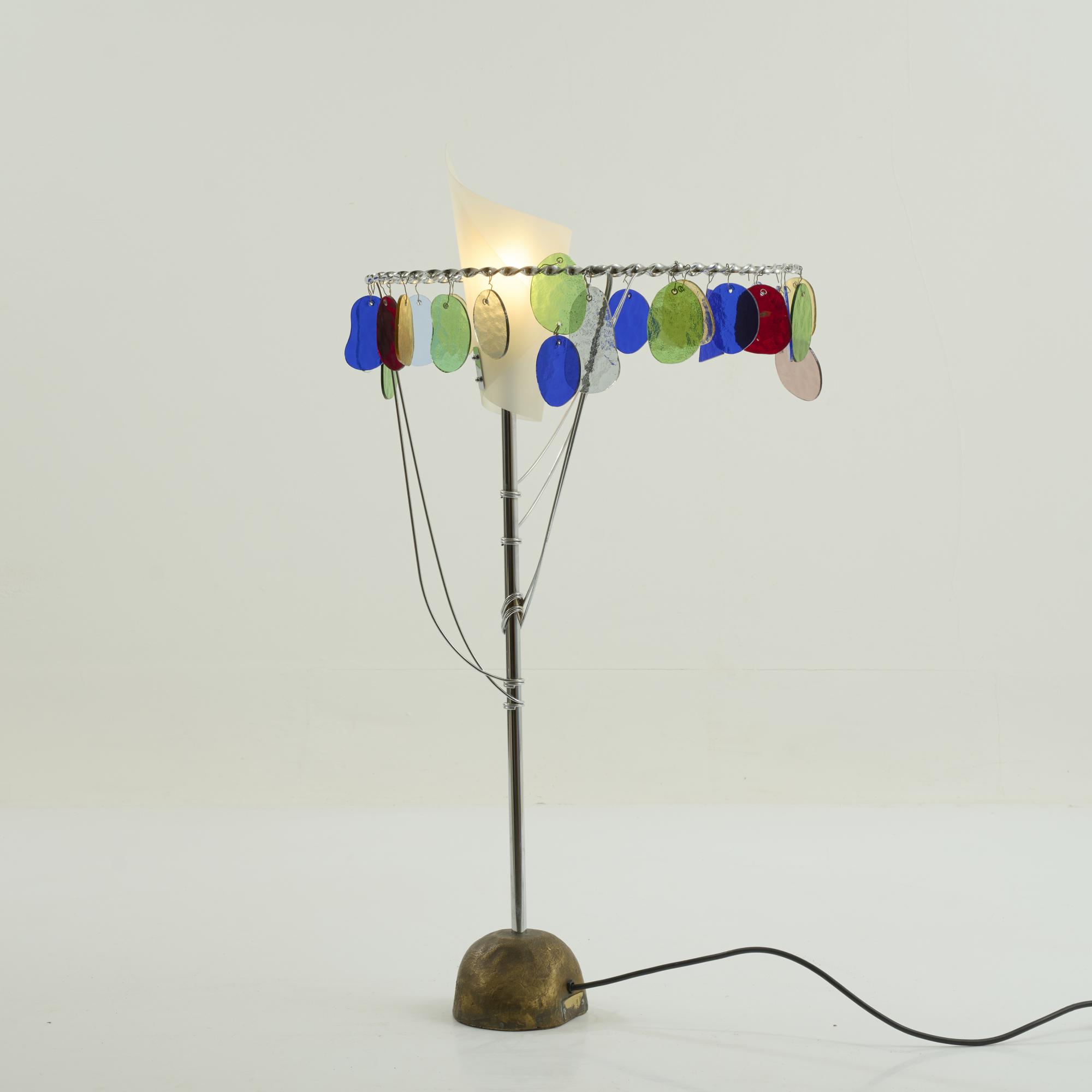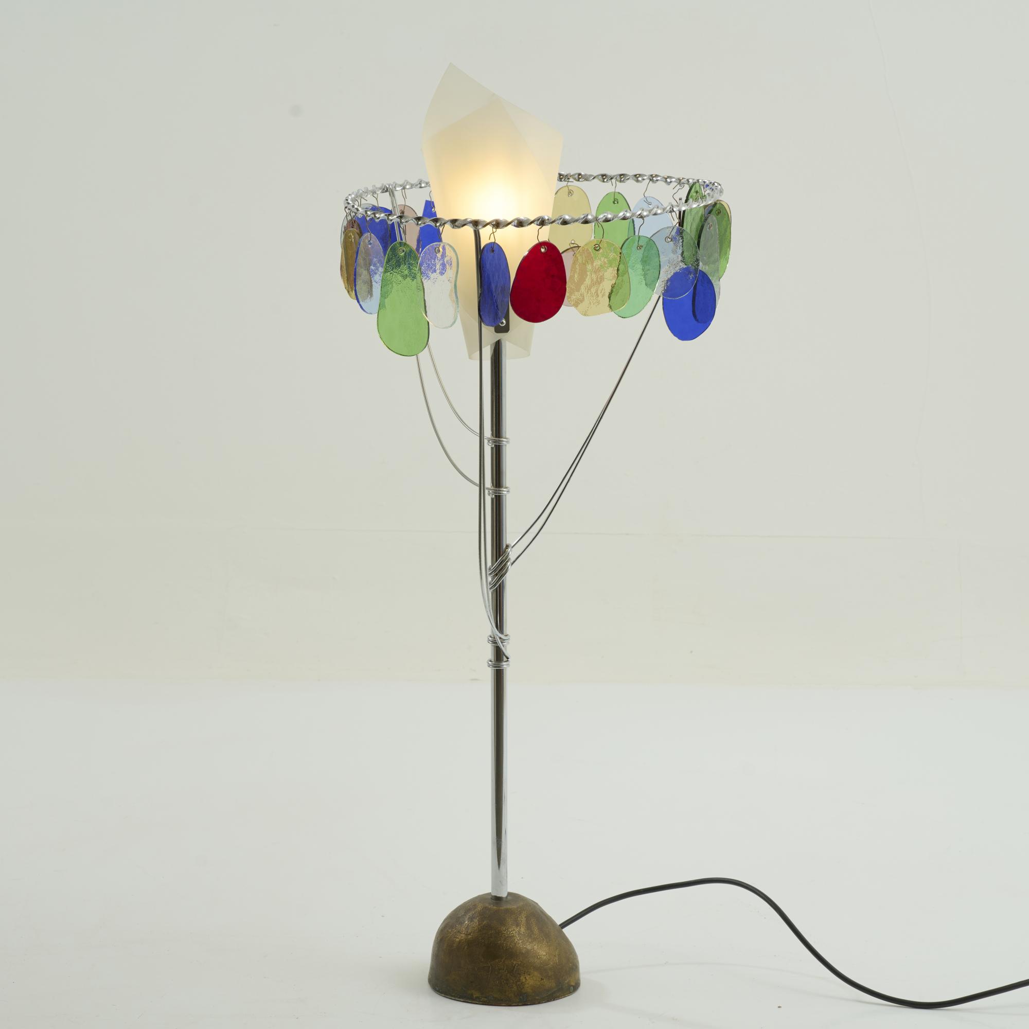 Metal tube, metal rods, chrome-plated, polychrome glass, bronze base, cream-white plastic.
