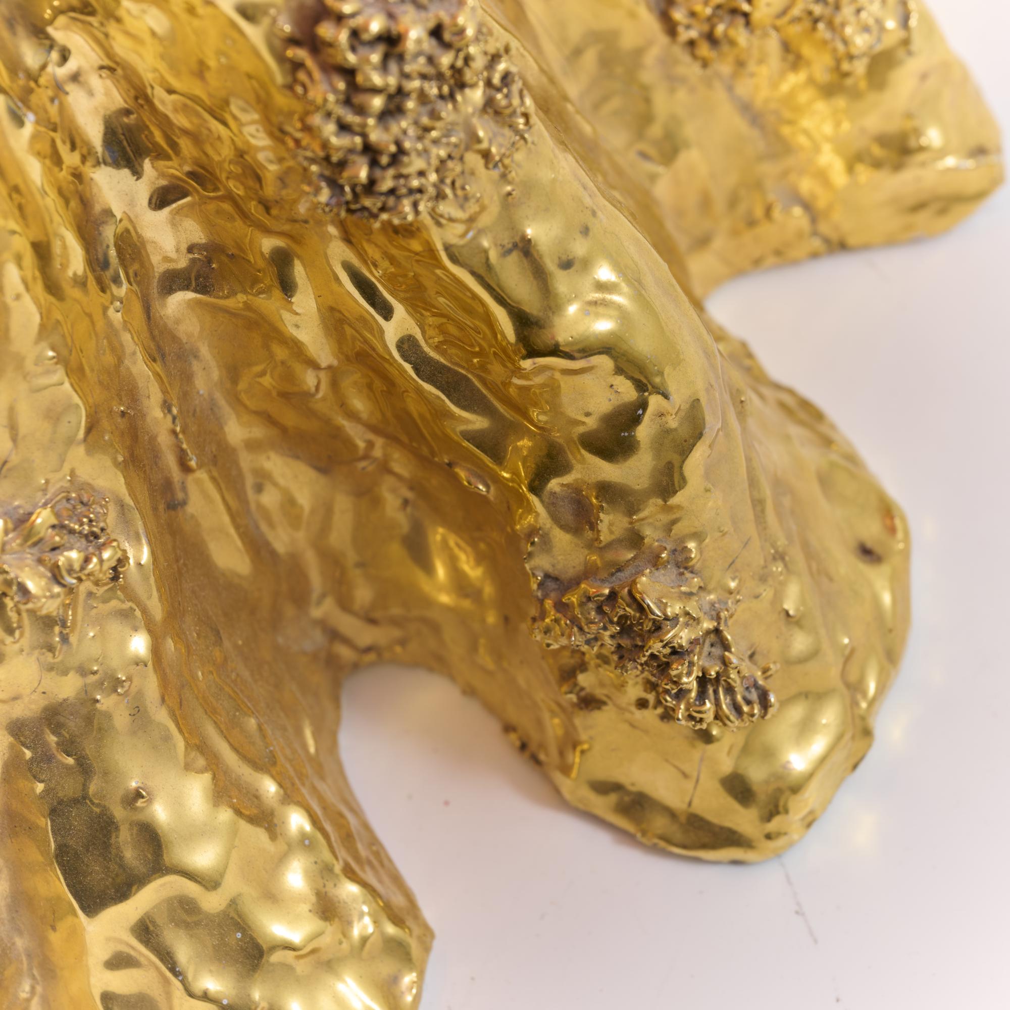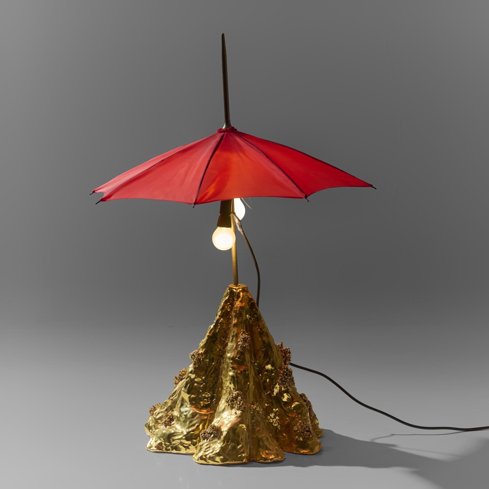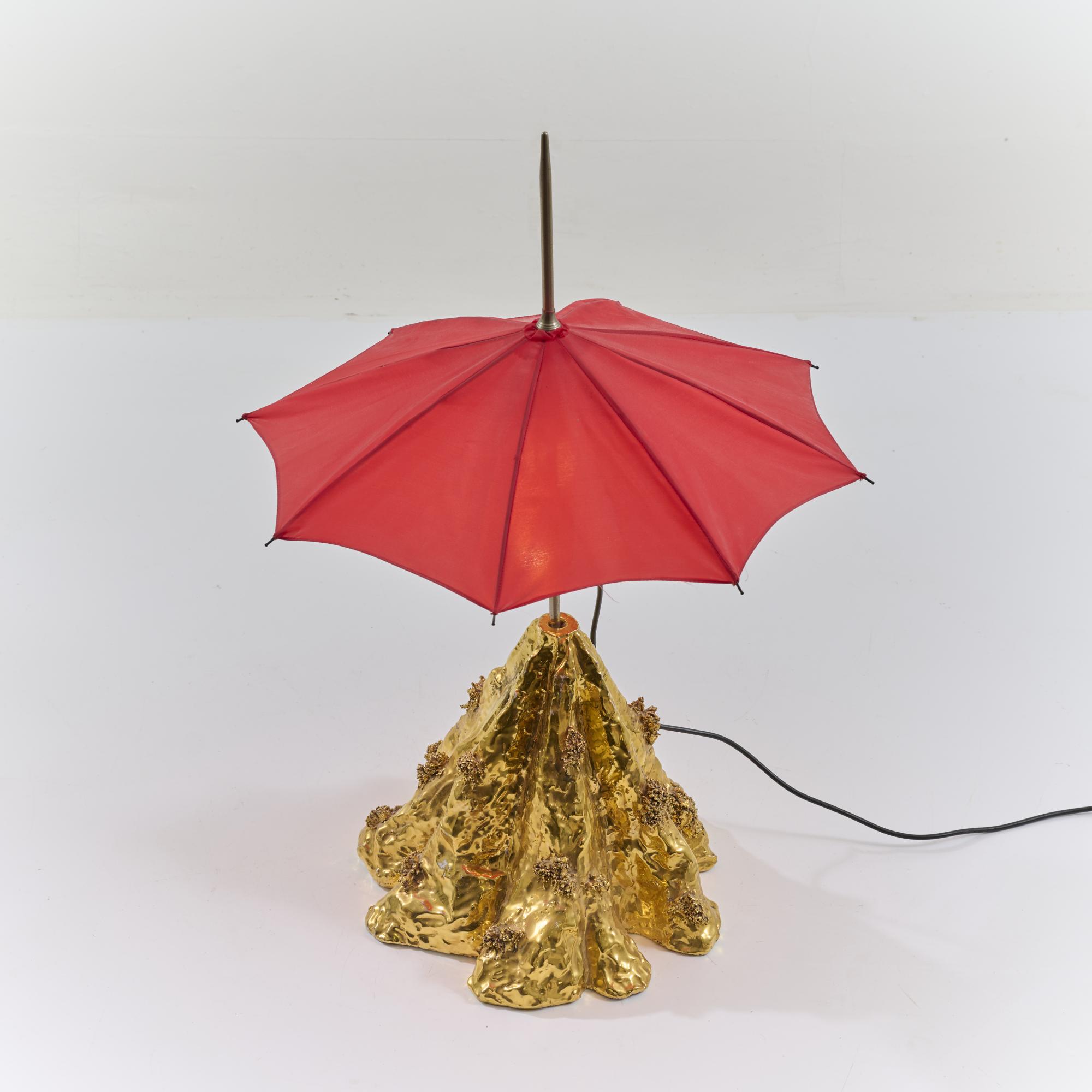 Faience, gold glazed, umbrella with red fabric cover.