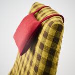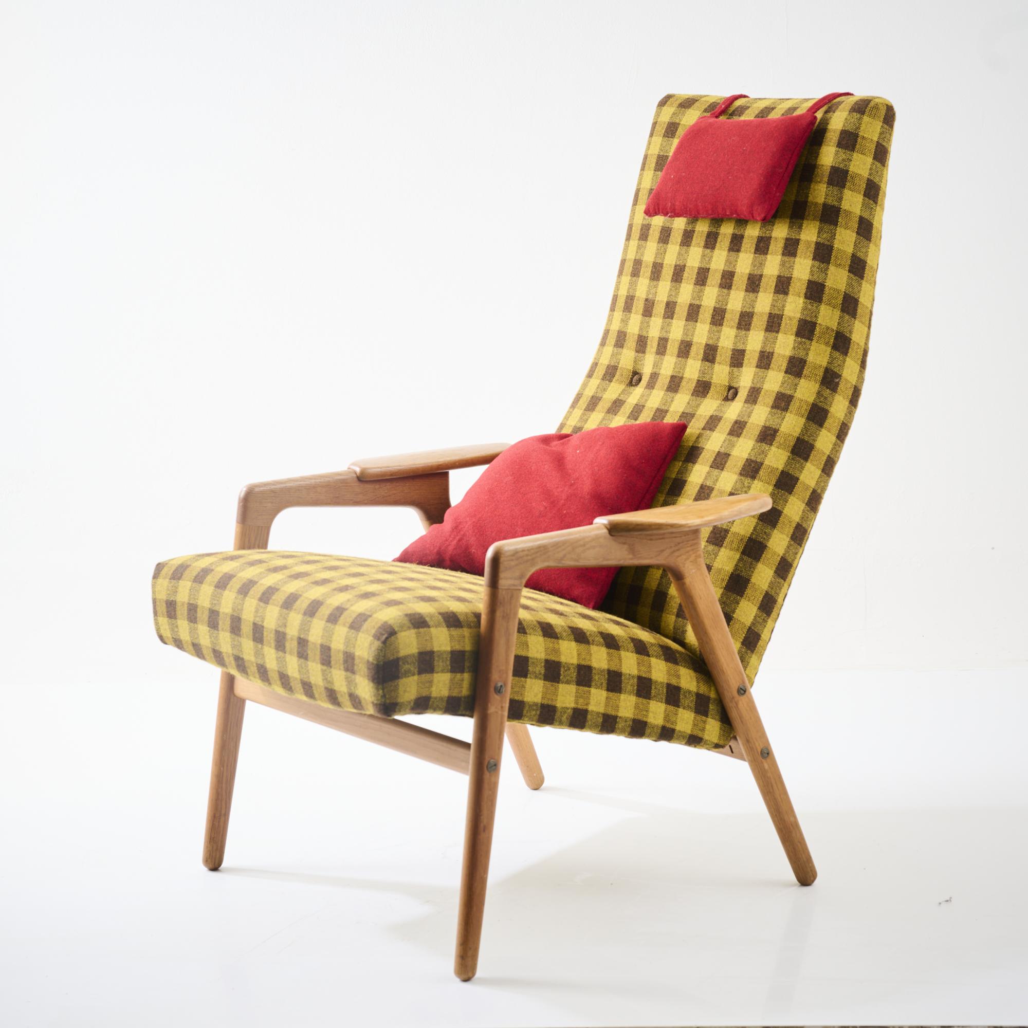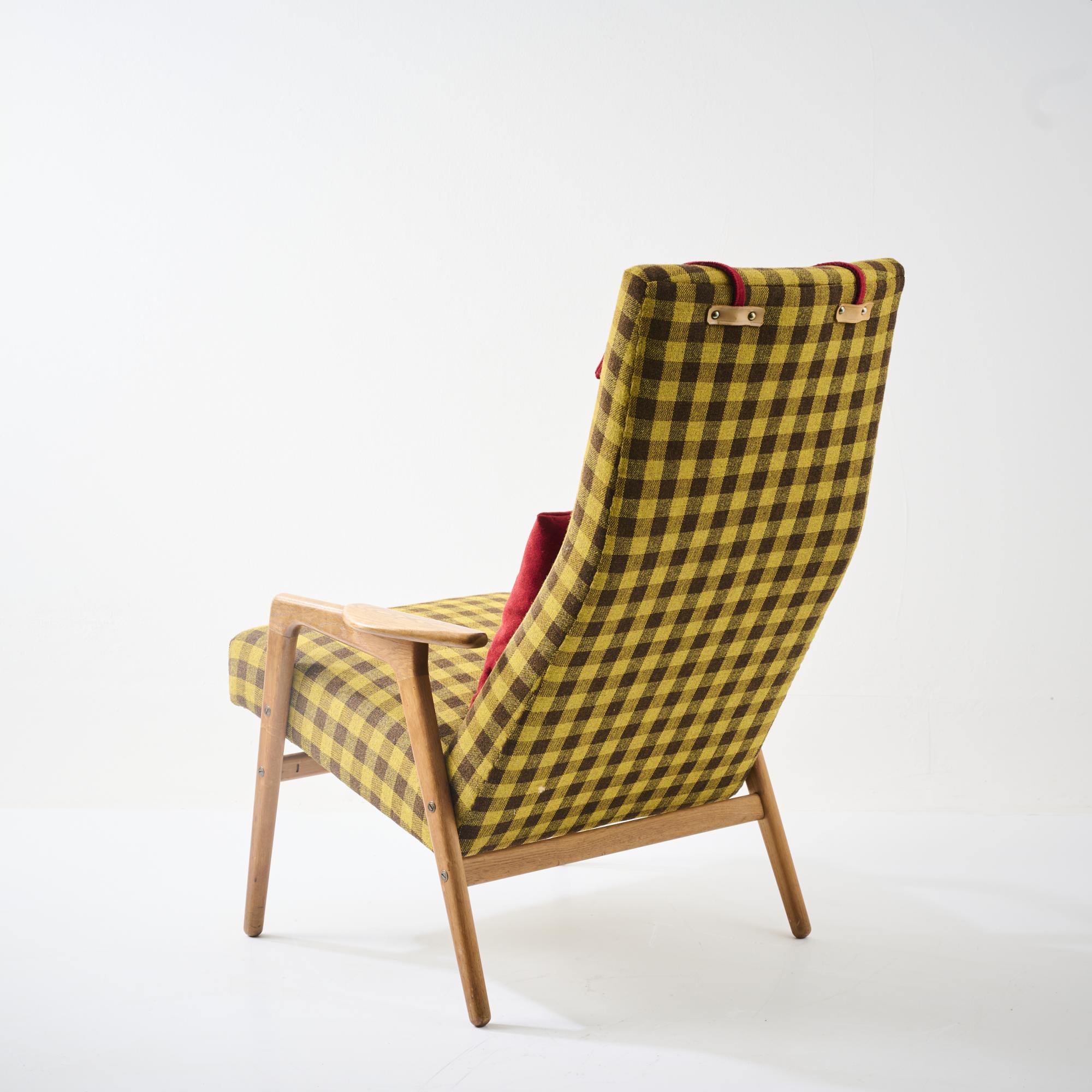 Oak wood, yellow-brown checkered and red textile fabric.