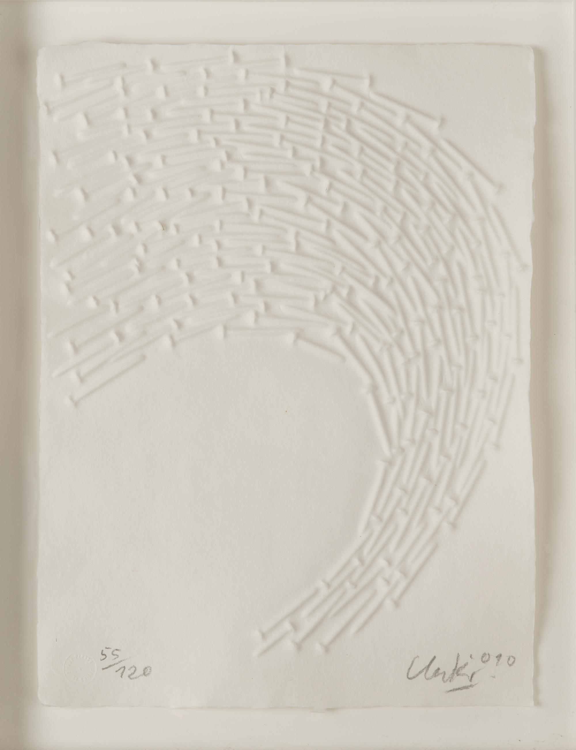 Günther Uecker. Untitled, 2010. Embossing on laid paper. 38.5 x 49.9 cm. Signed: Uecker, (2)010, numbered (pencil). No. 55 from an edition of 120. Published by Erker-Presse St. Gallen. Glass frame.