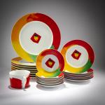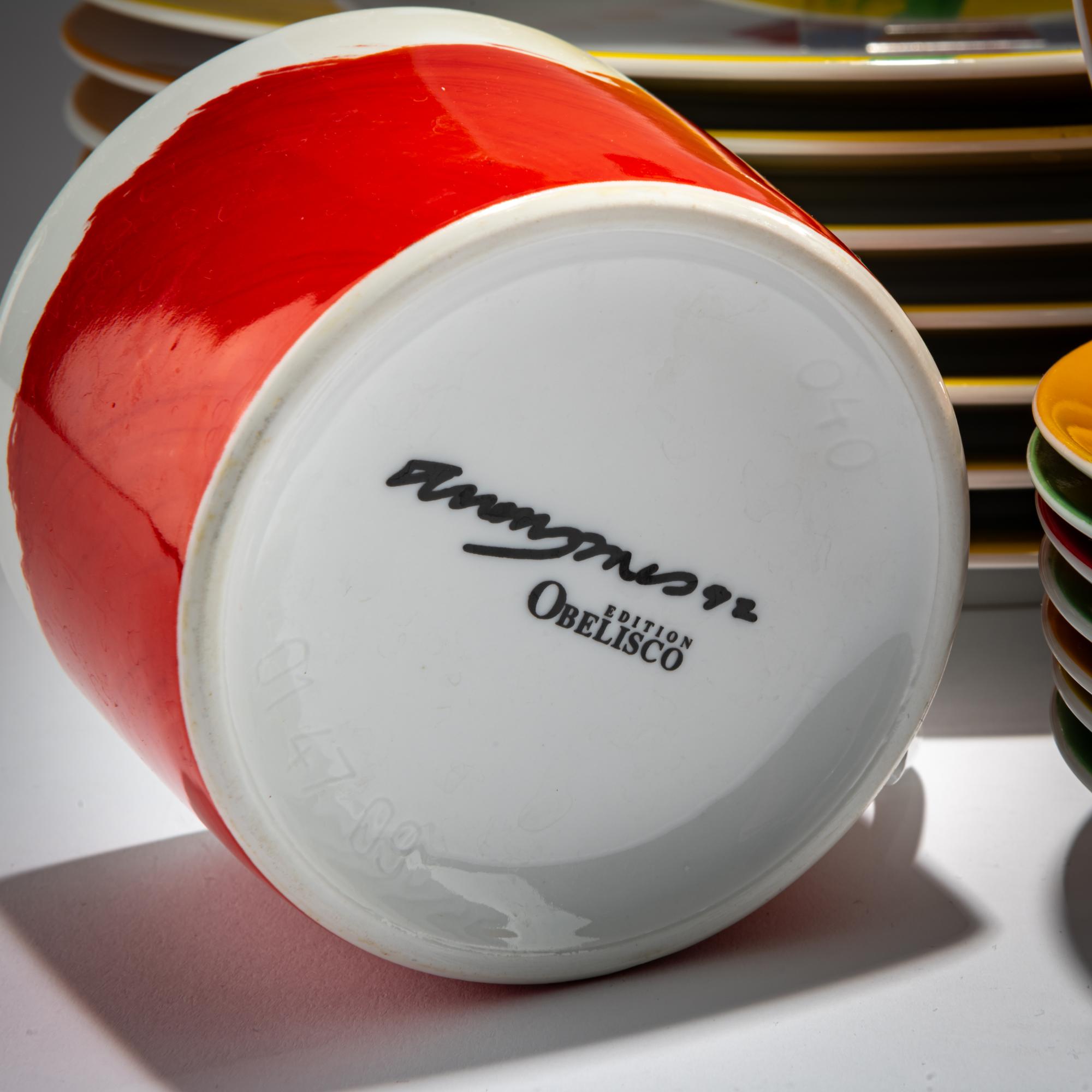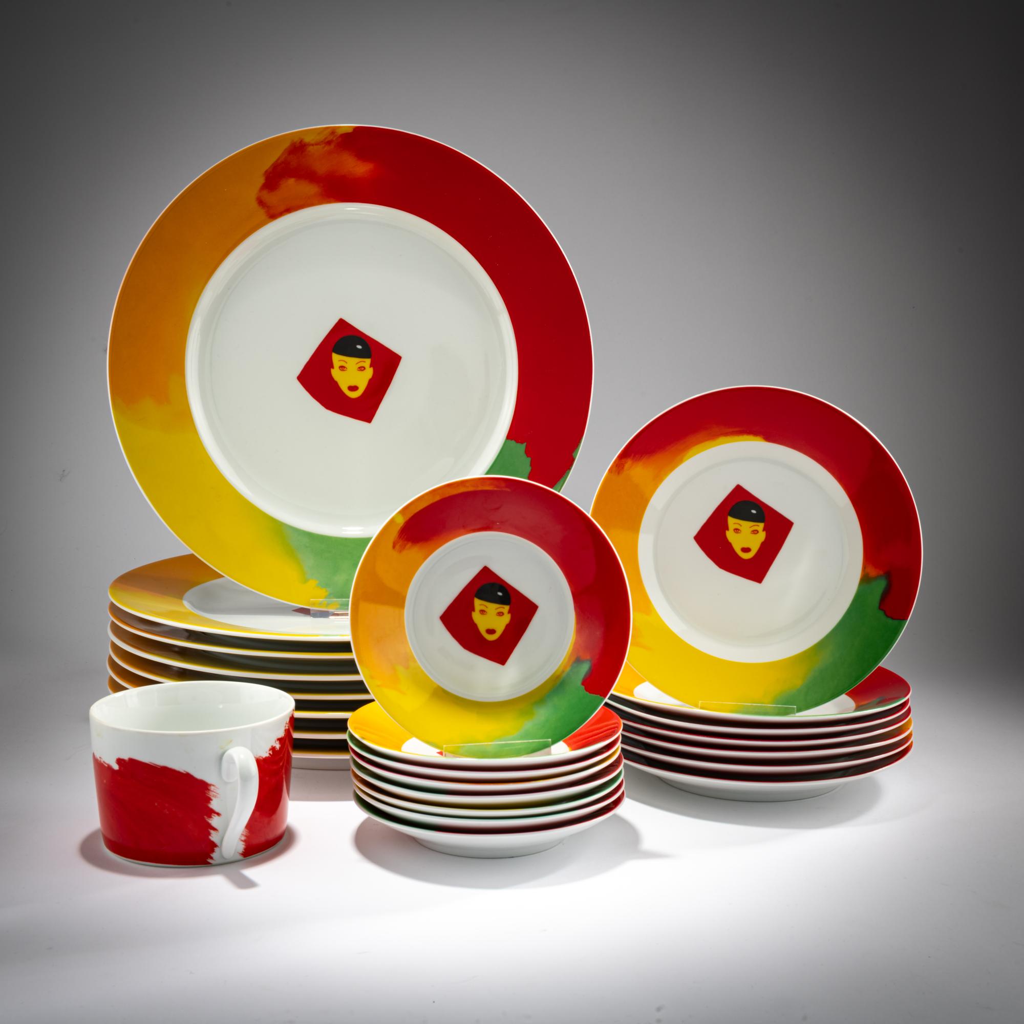 24 pieces of porcelain, white glazed, colored underglaze. 8 charger plates: Ø 31 cm, 7 dessert plates: Ø 19.5 cm, 8 saucers: Ø 14.5 cm, 1 cup: H. 7 cm, Ø 10.5 cm. Each piece bears a facsimile signature 92 Edition Obelisco (black underglaze); Kahla, Thuringia for Edition Obelisco.
