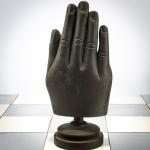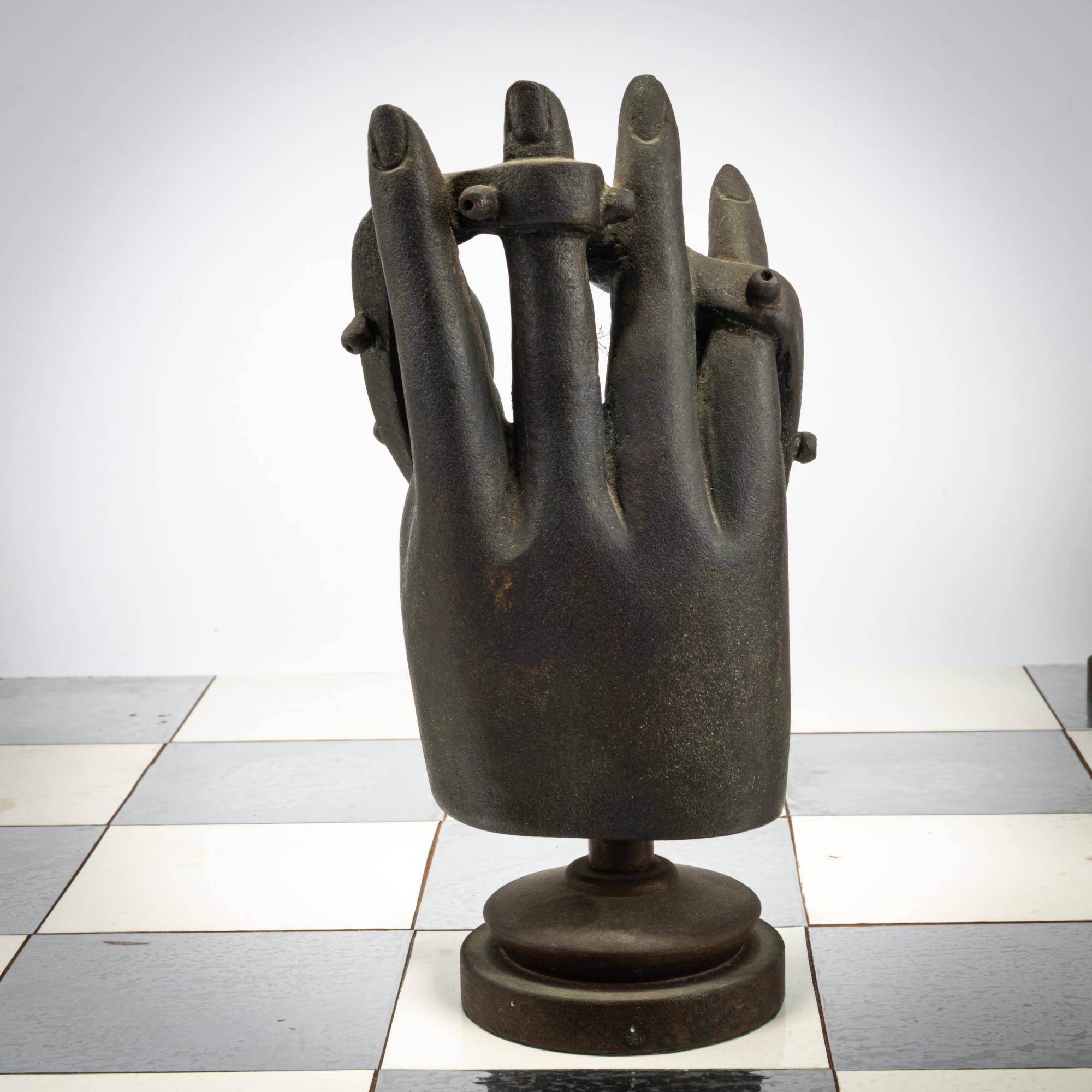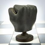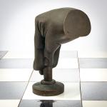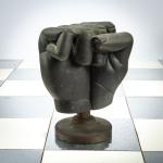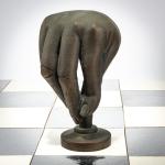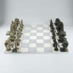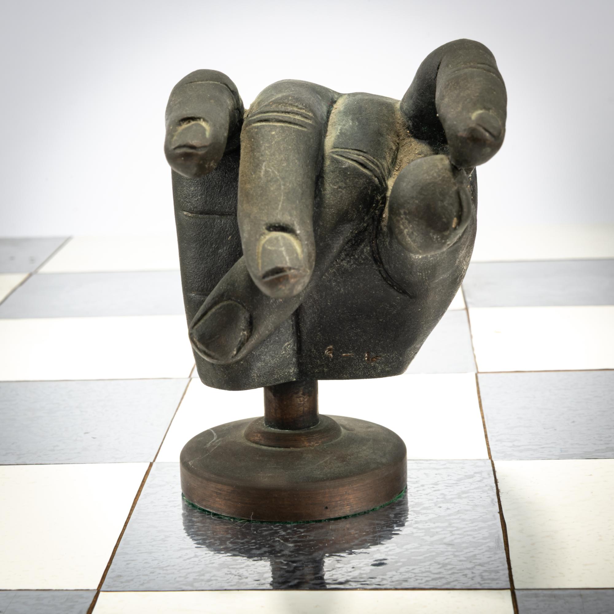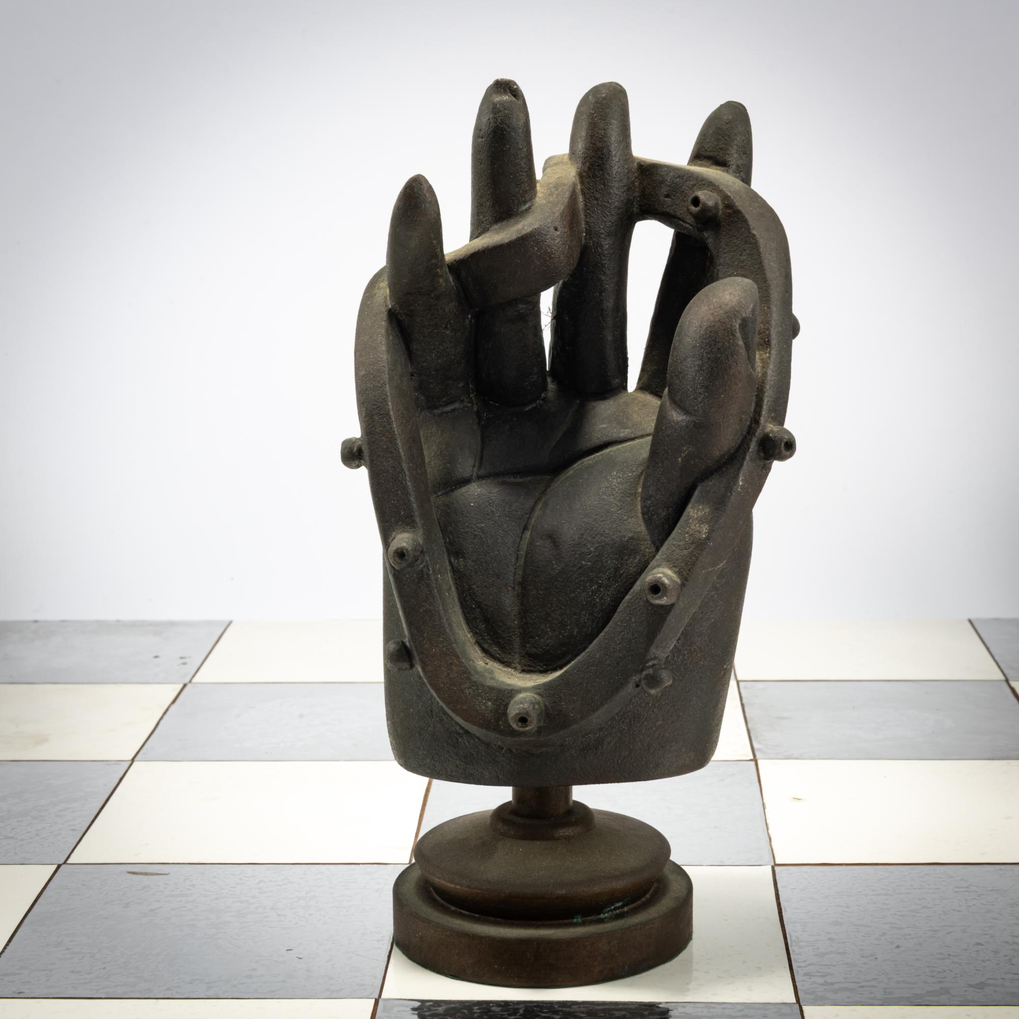 Bronze pieces, black and silver patina, chessboard made of foil-covered cardboard. H. 9.0 - 17.0 cm (pieces), 61.0 x 61.0 (chessboard). Some pieces are monogrammed: JS and numbered differently: X/15 (stamped). Probably from an edition of 15.