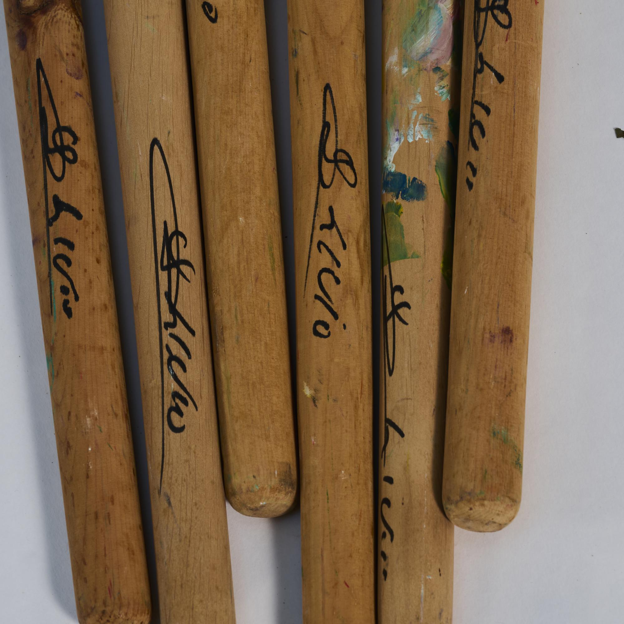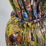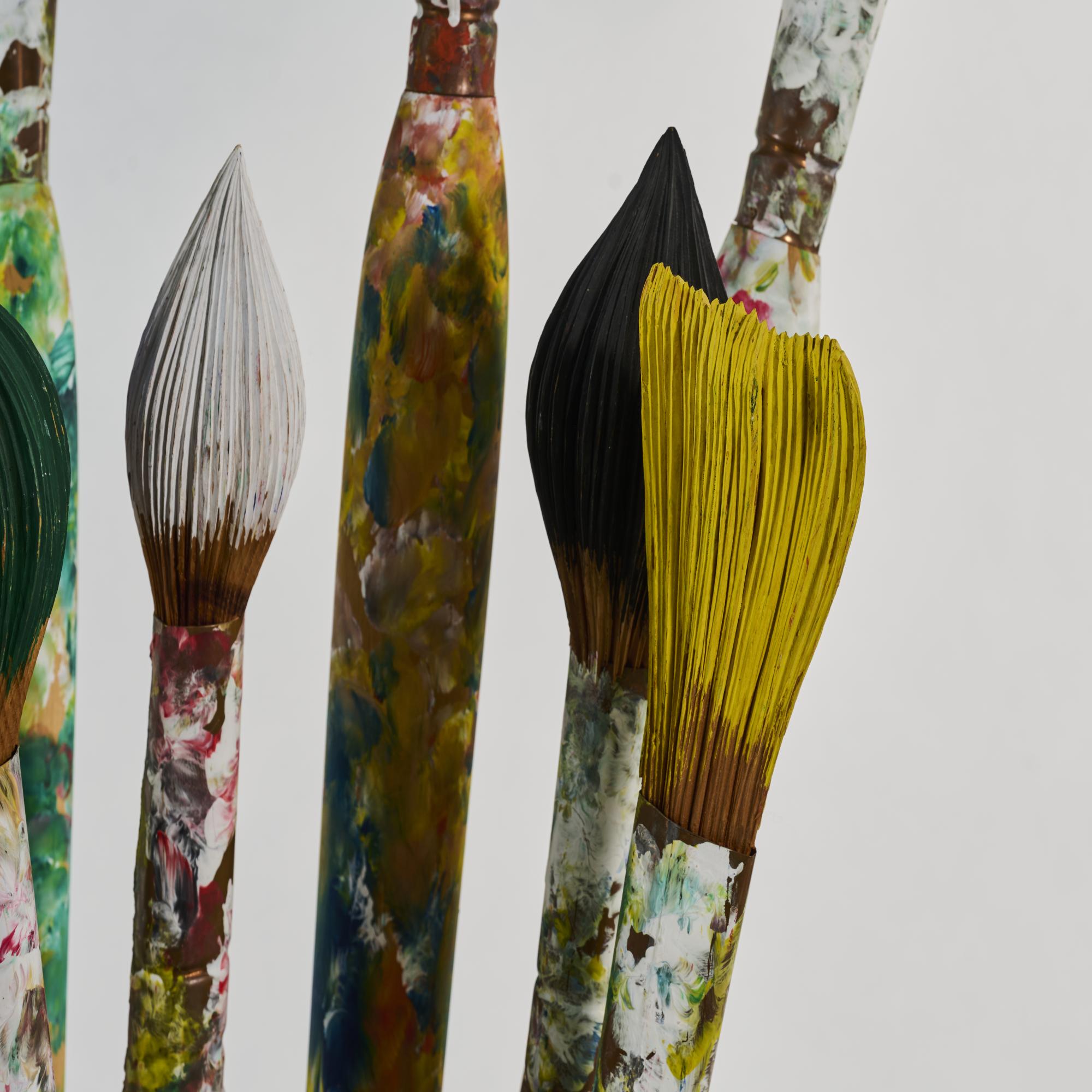 Acrylic on terracotta amphora and 14 carved wooden brushes, copper plates. Total height approx. 174.0 cm (depending on brush arrangement). Signed on each brush handle: Livio de Marchi (black felt-tip pen).