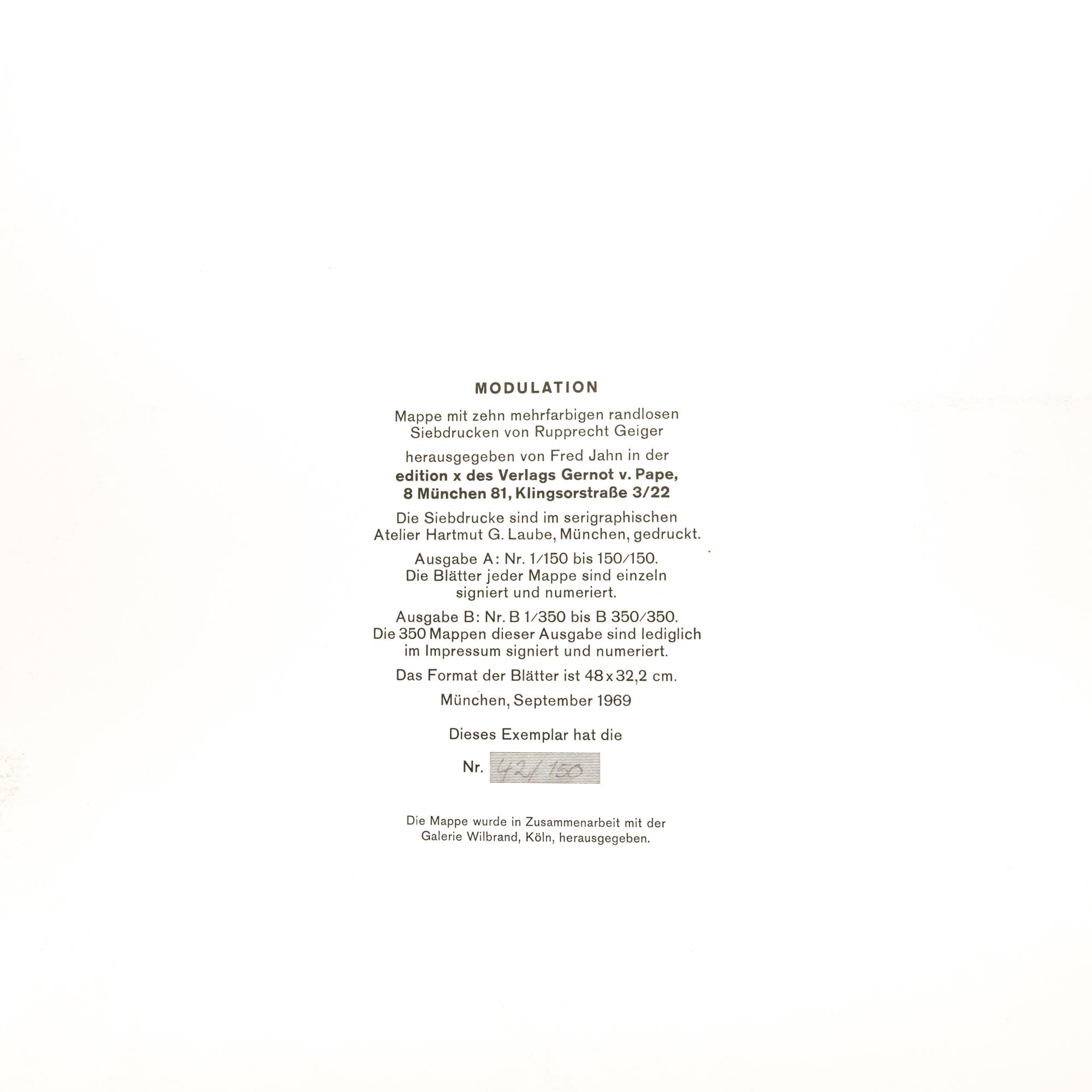 10 sheets of color serigraphs on light cardboard. Each 48 x 32.2 cm. Each verso numbered 42/150 lower left and signed Geiger (pencil) on the right, and also numbered 42/150 on the portfolio endpaper. Edition A, published by Fred Jahn in edition x of Gernot v. Pape Publishers, Munich.