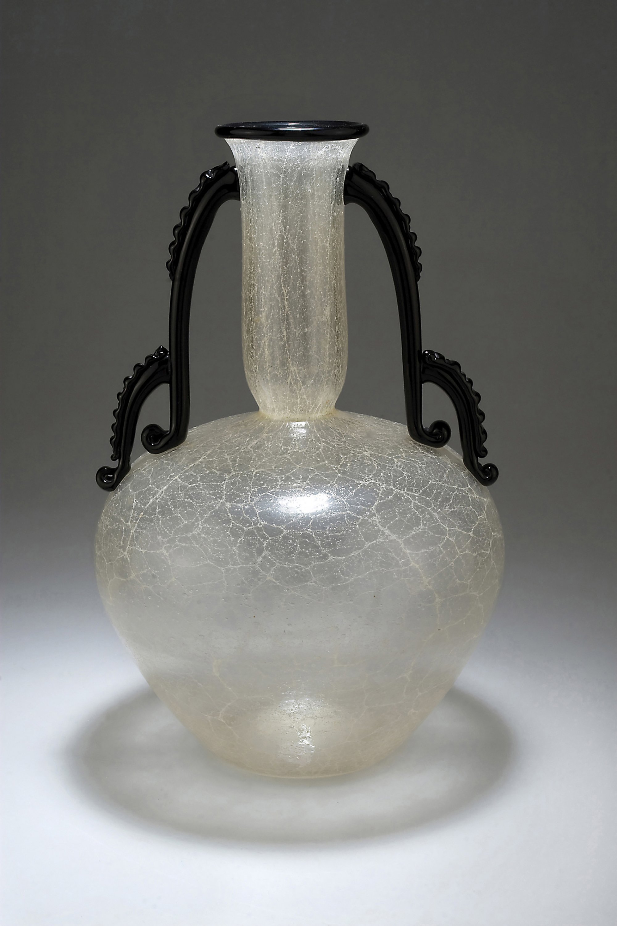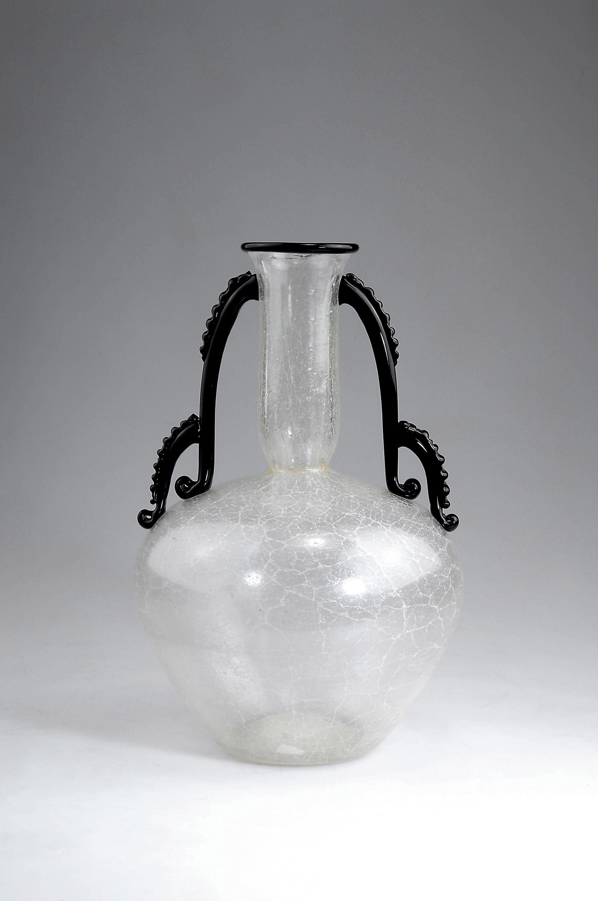 H. 33.7 cm. Made by Vetreria Artistica Barovier & C. Clear, slightly milky, bubbly and craquelled so-called 'primavera' glass, handles and rim of black gather.