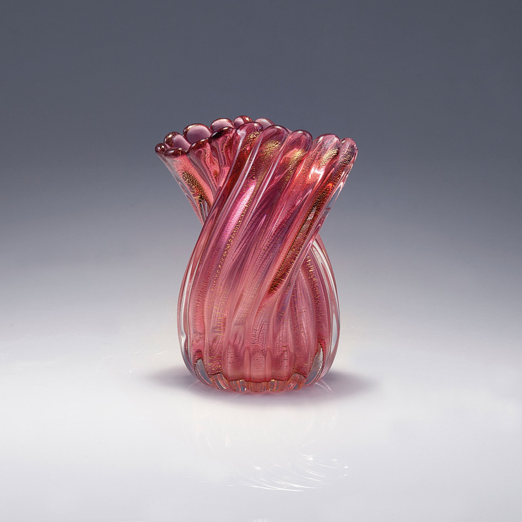 Archimede Seguso. 'Ritorto a coste' vase, 1950. H. 15.1 cm. Made by Vetreria Archimede Seguso. Glass, clear and pink, burst gold foil.