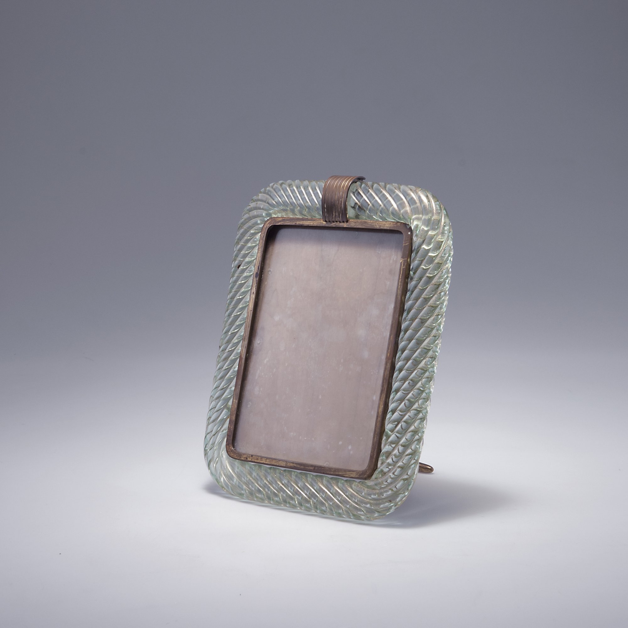 Barovier & Toso. Photo frame, c1950. 32 x 25.5 cm. Clear glass with green powder inclusions, fused burst gold foil, brass mounting. Marked: BAROVIER-TOSO MURANO.