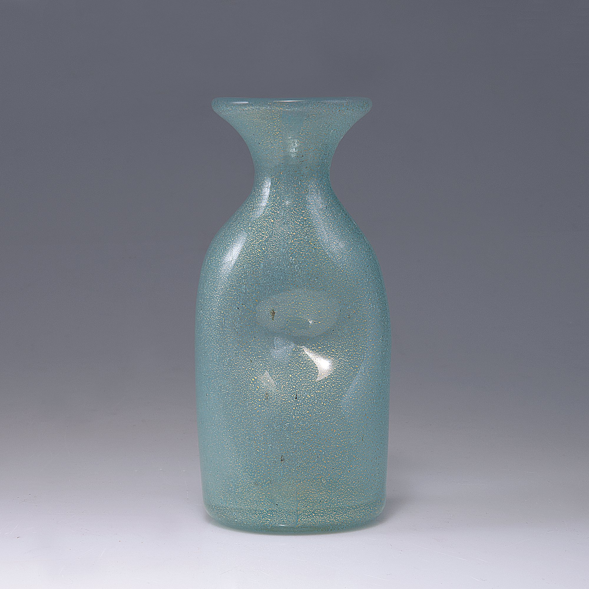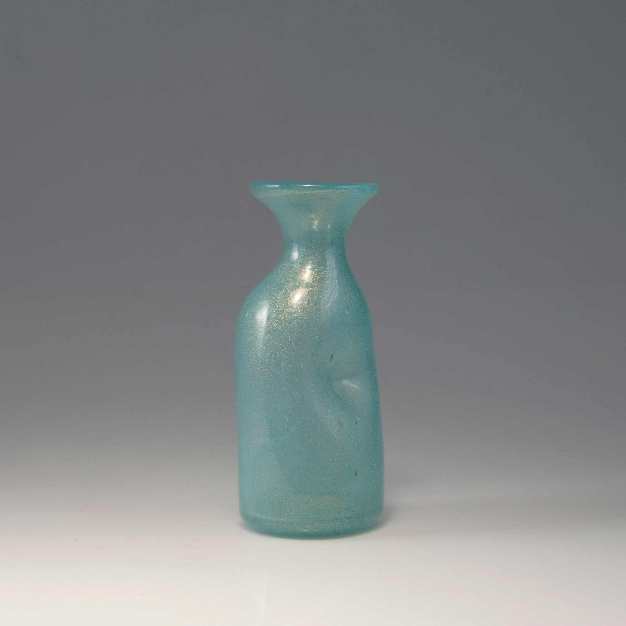 Dino Martens. 'Asimmetricho' vase, c1954. H. 19.8 cm. Cased glass, clear, blue powder inclusions, burst gold foil. Marked: Label, inscribed: Made in Italy, 6554.