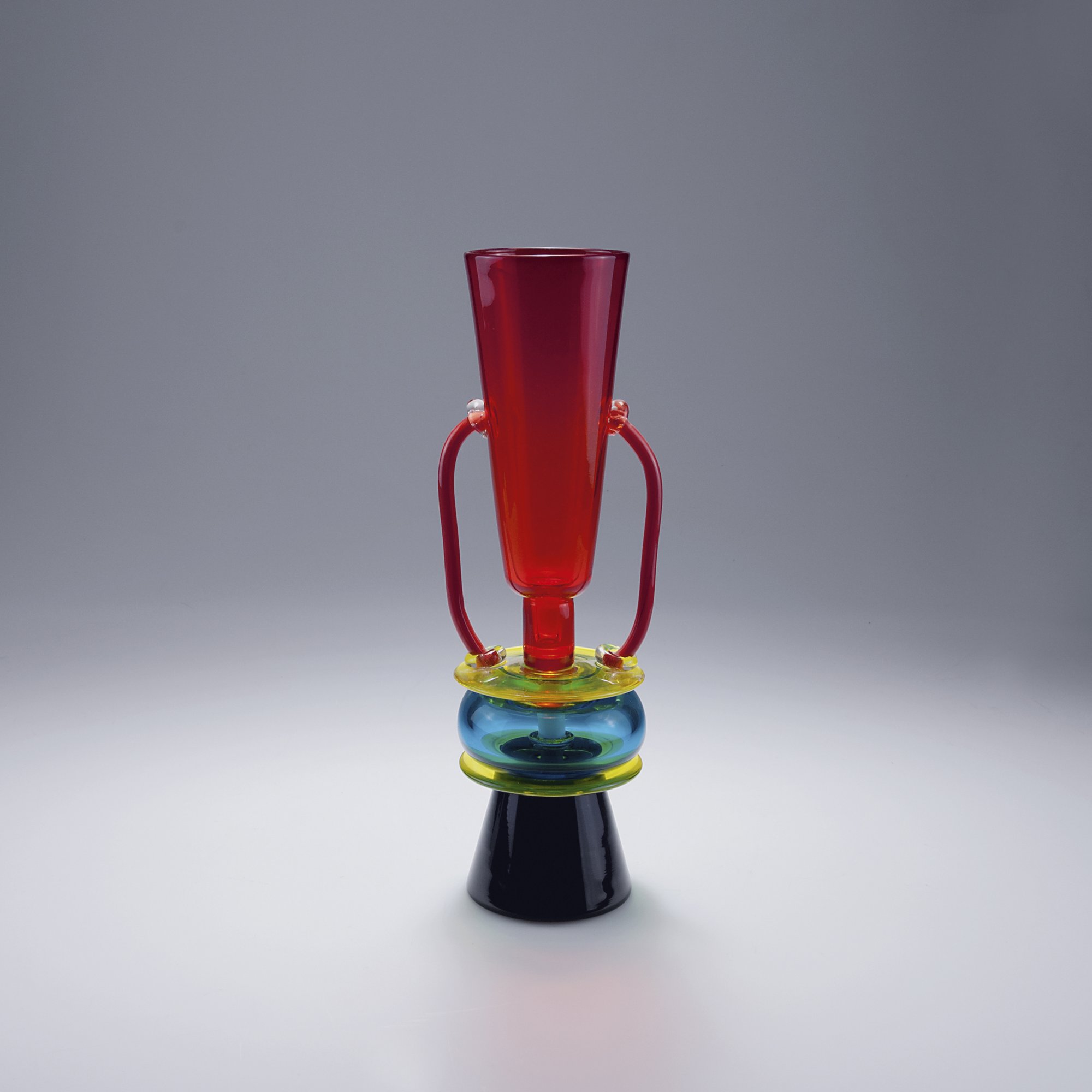 Ettore Sottsass. 'Sirio' vase, 1982. H. 36 cm. Made by Compagnia Vetraria Muranese for Memphis, Milan. Glass, black, yellow, blue and red. Marked: E. SOTTSASS PER MEMPHIS by COMPAGNIA VETRARIA MURANESE.