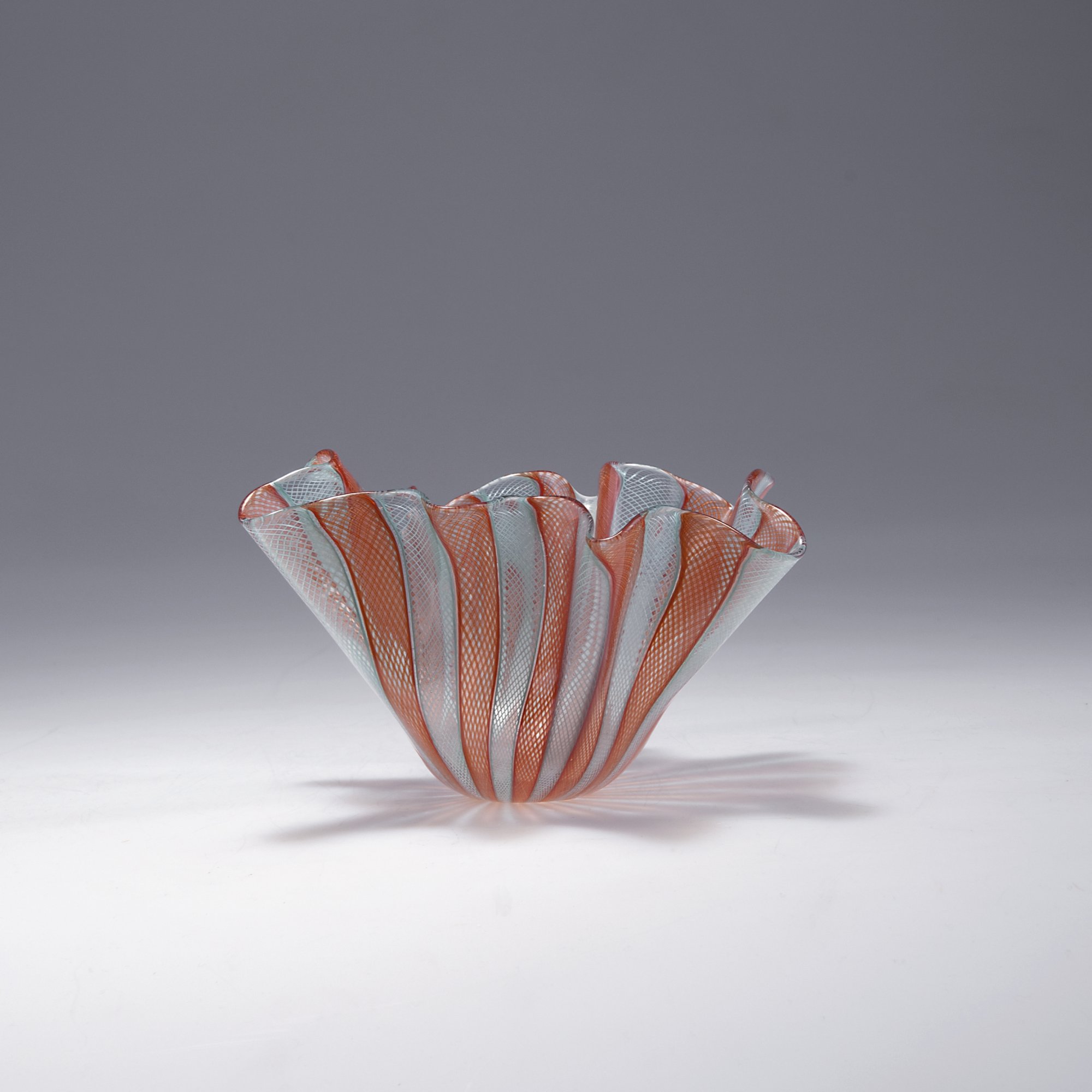Fulvio Bianconi. 'Fazzoletto' vase, c1950. H. 11 cm. Made by Venini & C. Bands of clear glass, orange red and milk green spirals. Marked: venini murano ITALIA (acid stamp).