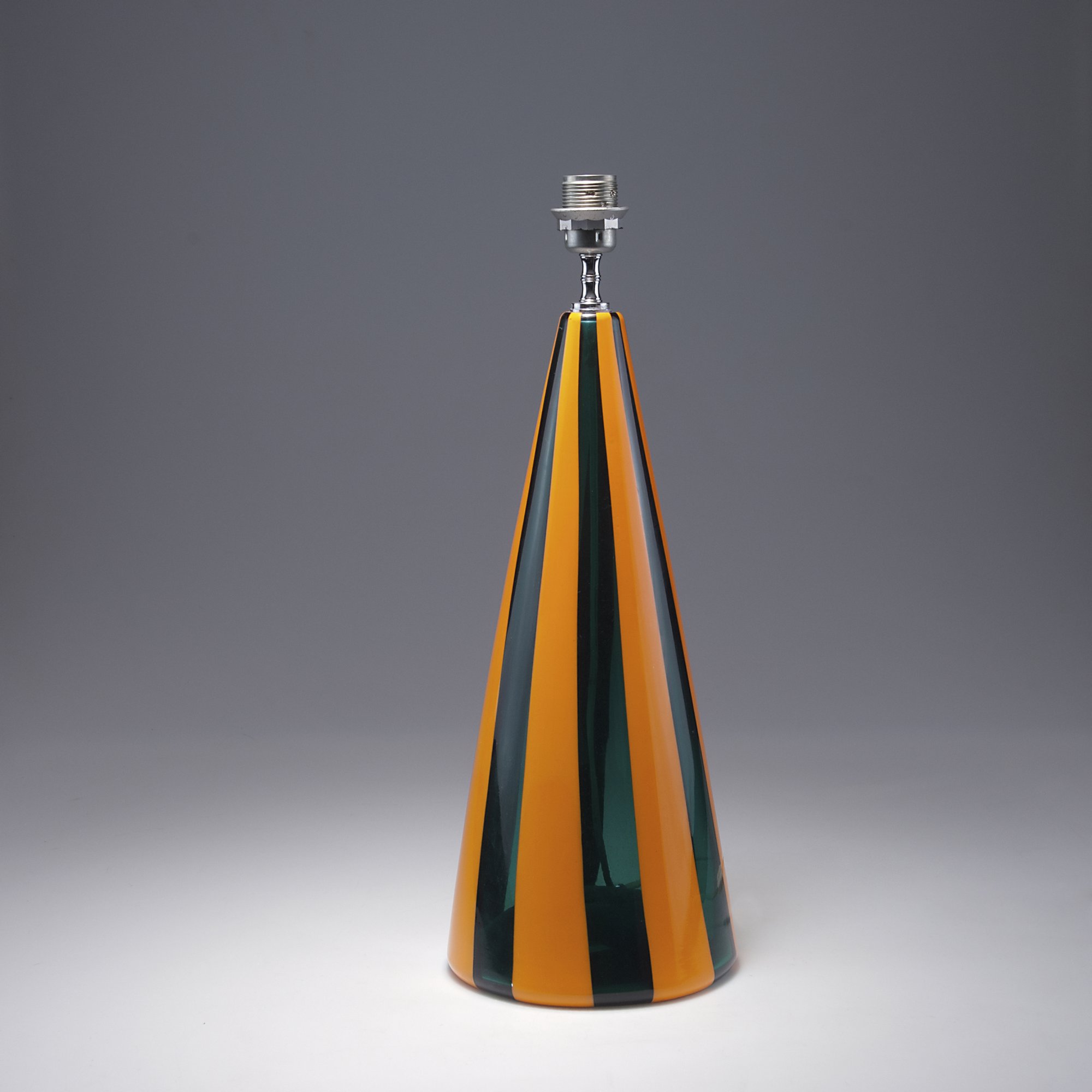 Fulvio Bianconi. 'A fasce' table light, c1952. H. 48.5 cm (body). Made by Venini & C. Cased glass, clear and dark green, fused bands, opaque orange. Marked: remains of a maker's paper label. Metal mounting.