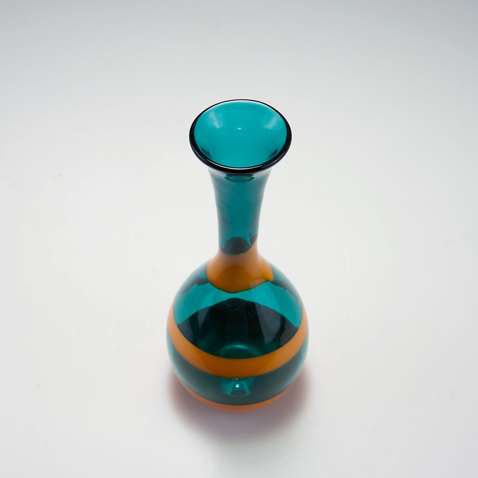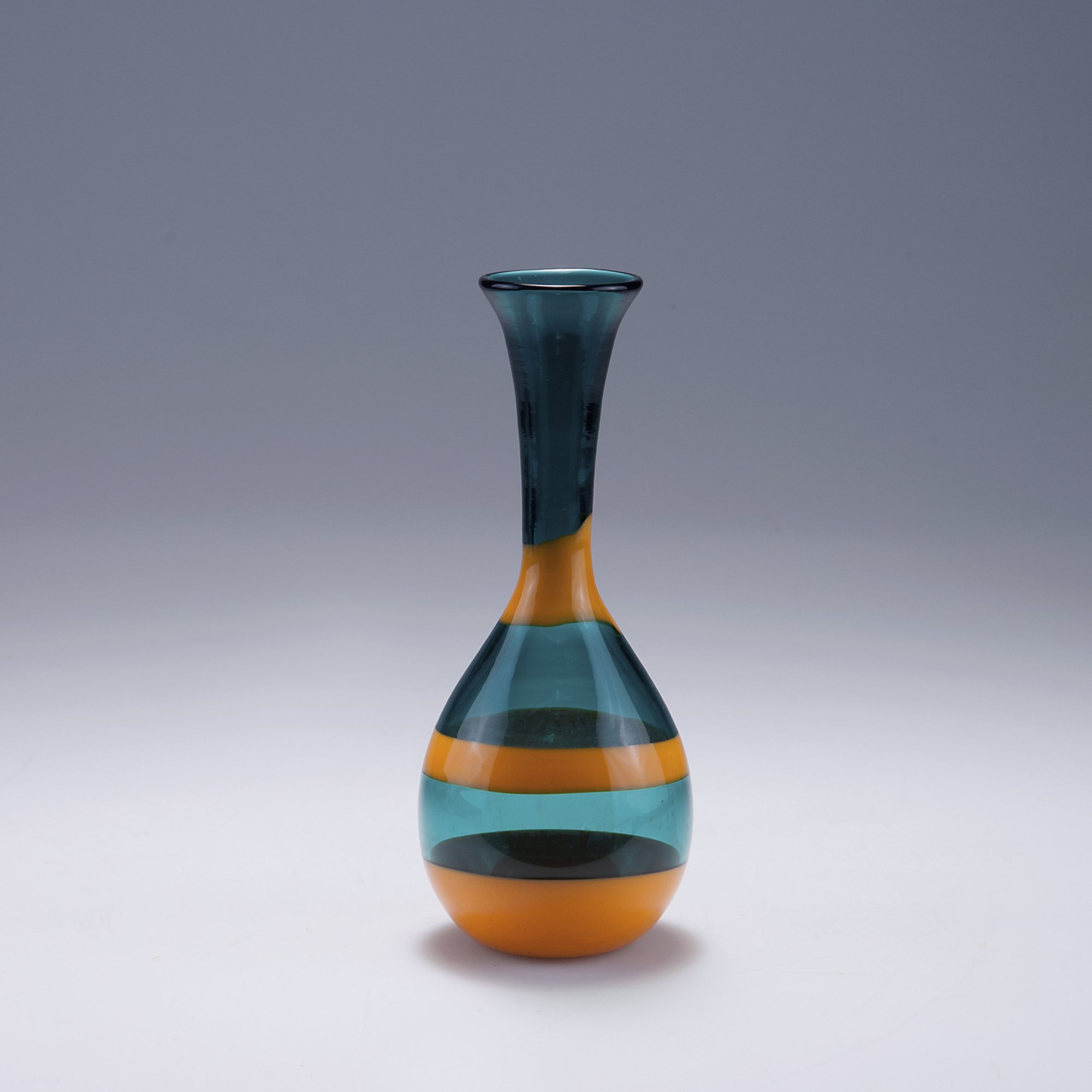 Fulvio Bianconi. 'A fasce orizzontale' vase, c1953. H. 19.2 cm. Made by Venini & C. Cased glass, clear and green, orange bands. Marked: venini murano ITALIA (acid stamp).