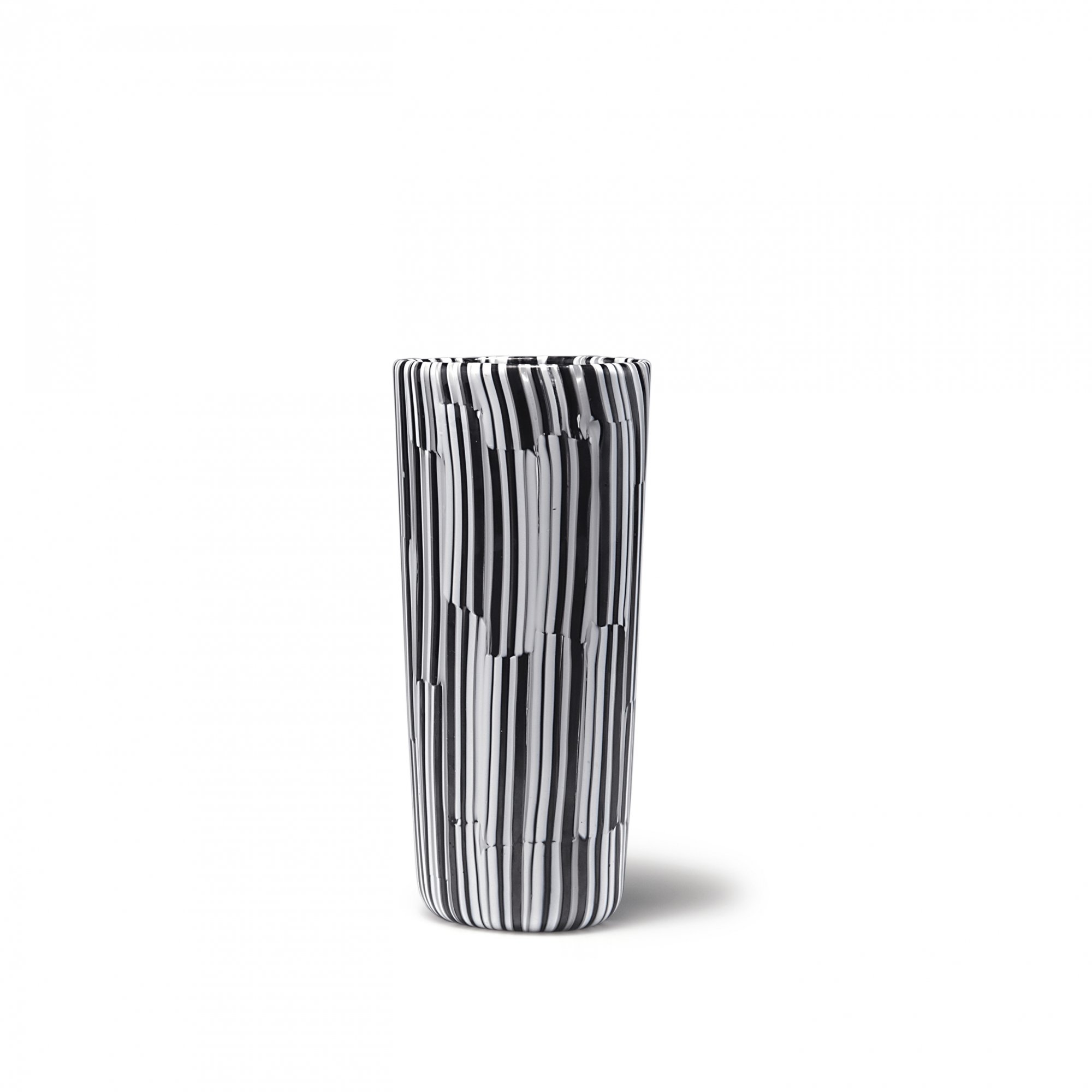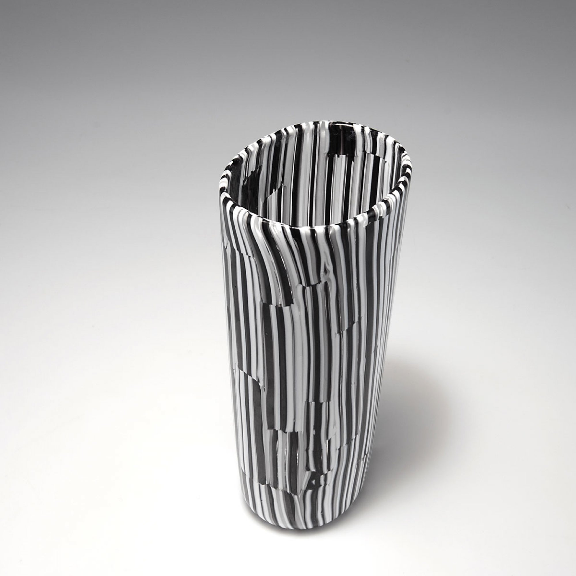 Ginette Gignous. 'Pioggia' vase, c1960. H. 23.6 cm. Made by Venini & C. Fused segments of clear glass with included and fused bands, black and white, part iridescent. Marked: venini murano ITALIA (acid stamp), round maker's paper label.
