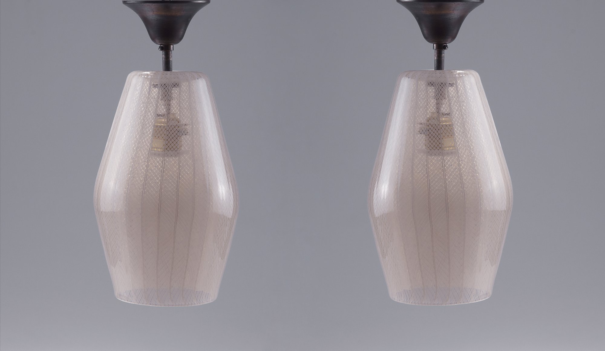 Paolo Venini. Pair of pendant lights, c1950. H. 24 cm (body). Made by Venini & C. Clear glass, fused bands, slightly amber with white spiral. Brass mounting.