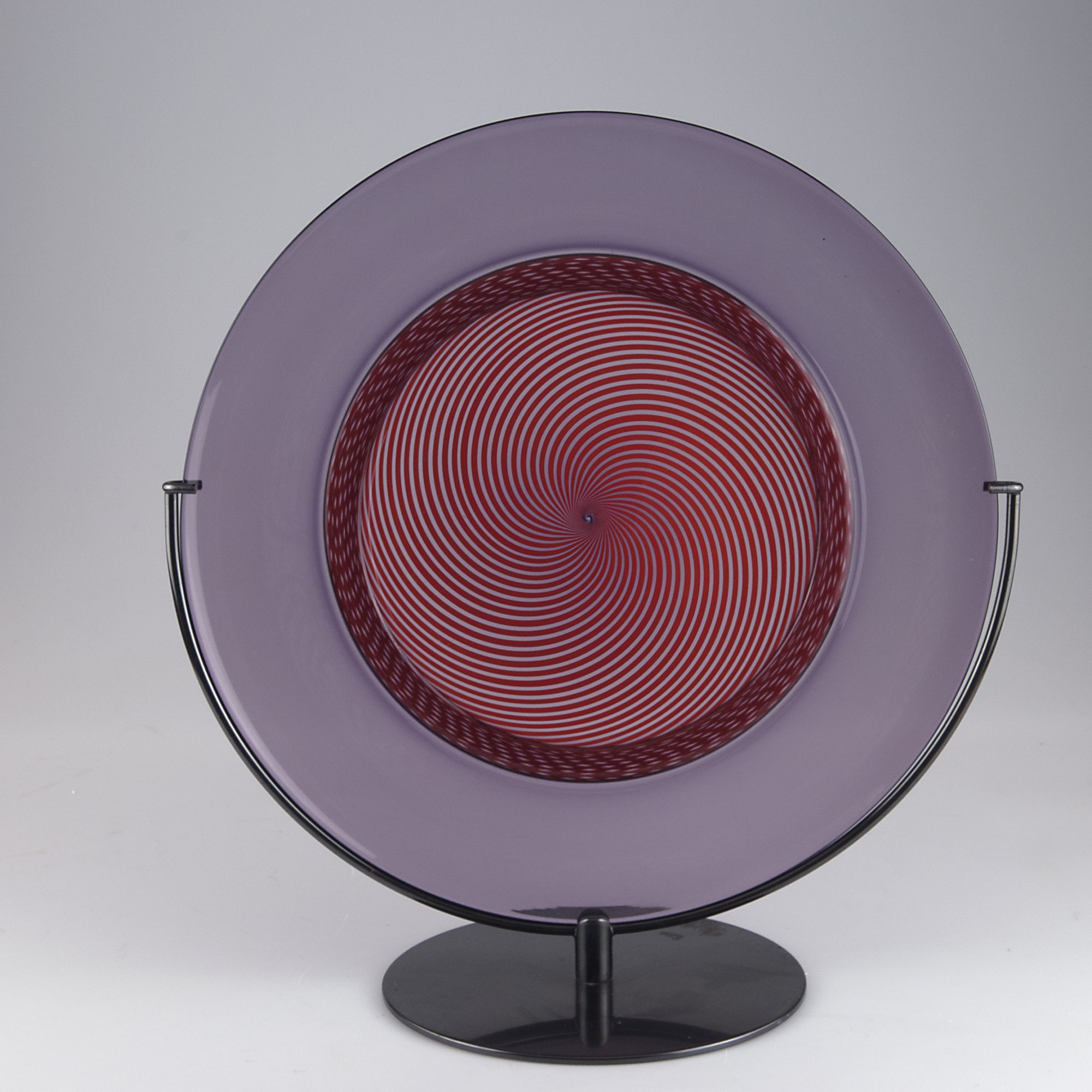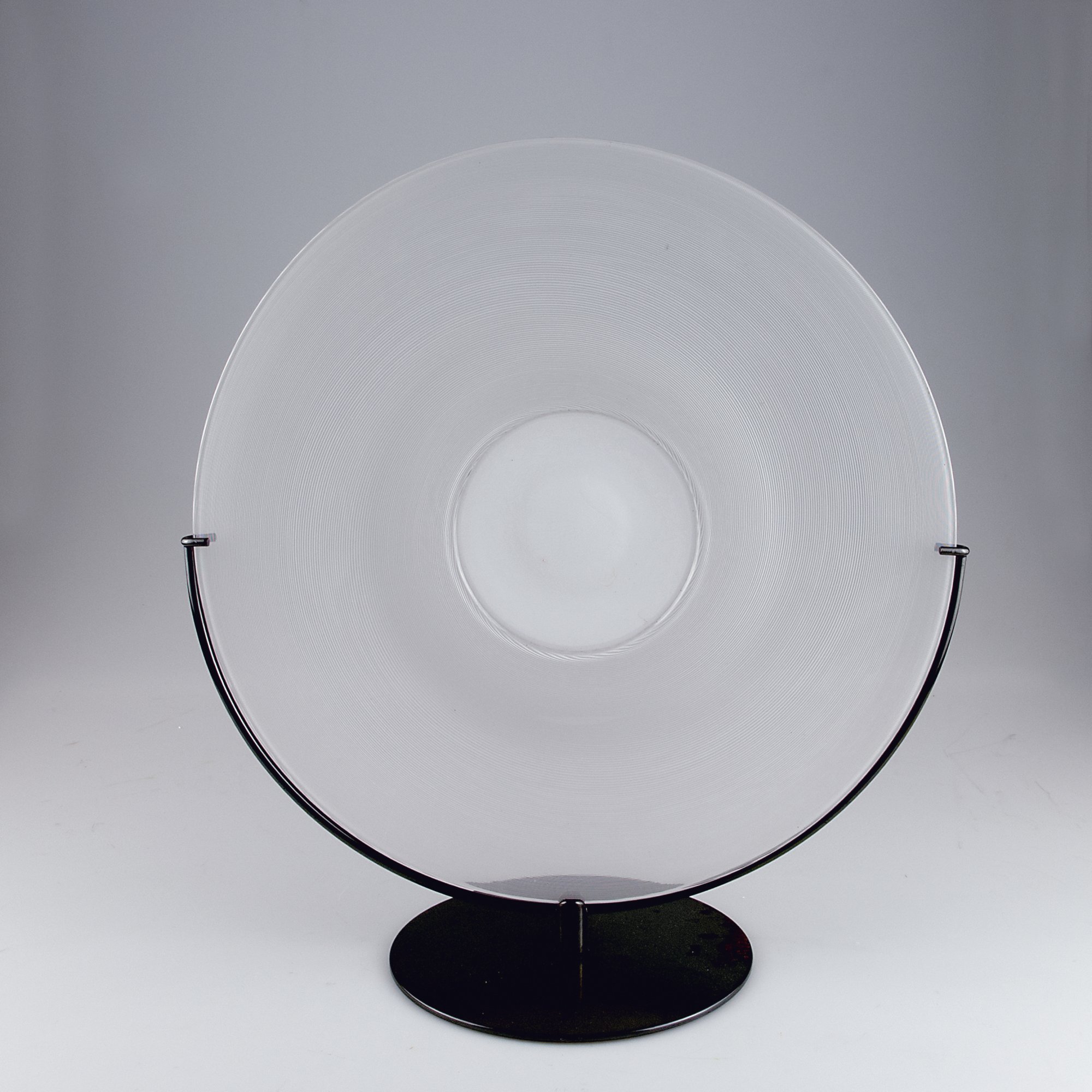 Tapio Wirkkala. Large 'Filigrana di Tapio' plate, 1970. D. 53 cm. Made by Venini & C. Clear glass, opaque white layer, included spiral. Marked: venini italia tw (engraved).