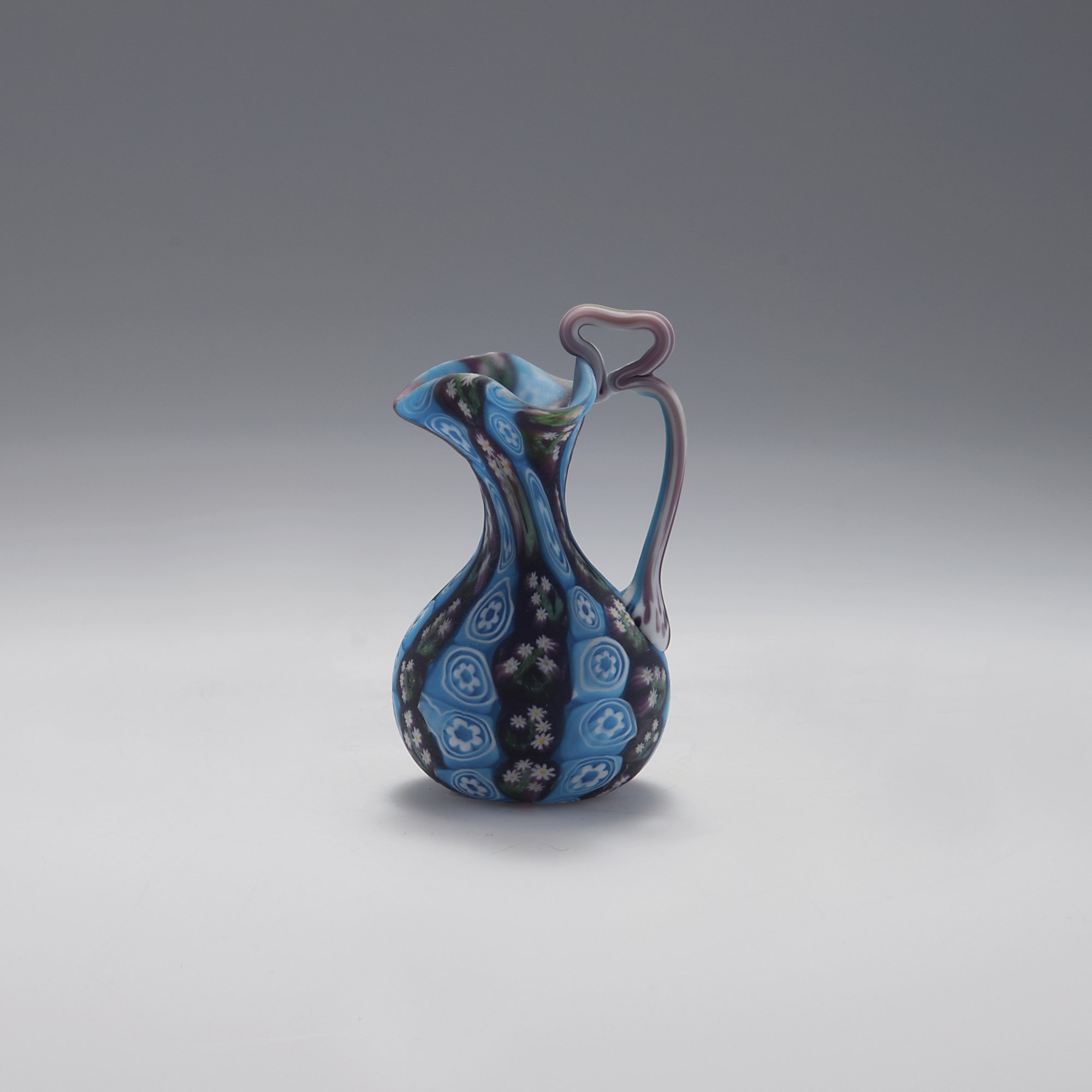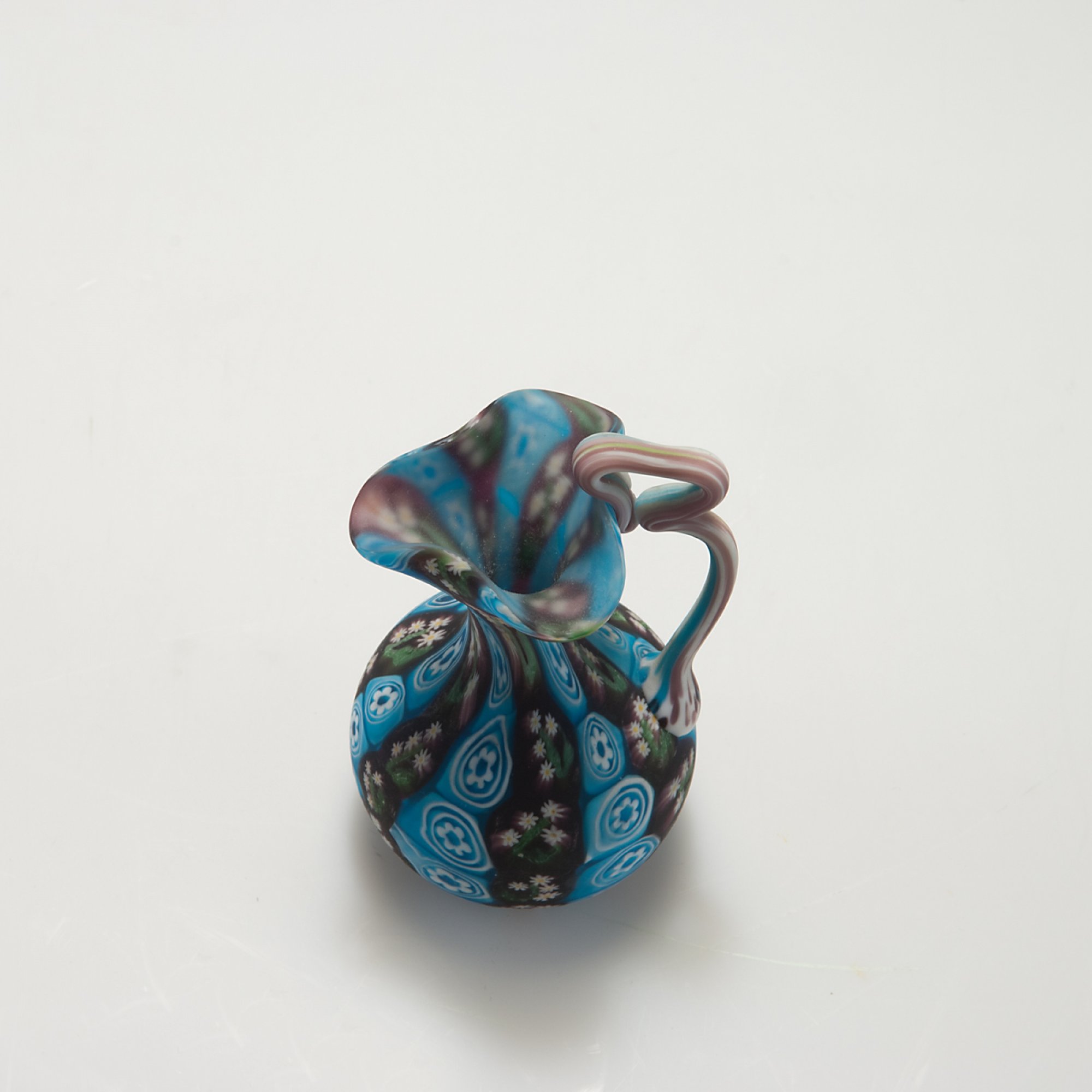 Fratelli Toso. 'Murrine' jar, c1910. H. 9.6 cm. Clear glass, fused flower-shaped murrhines.