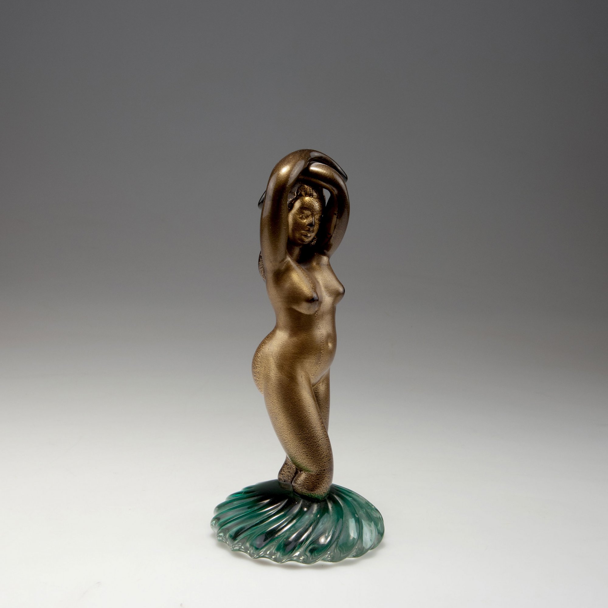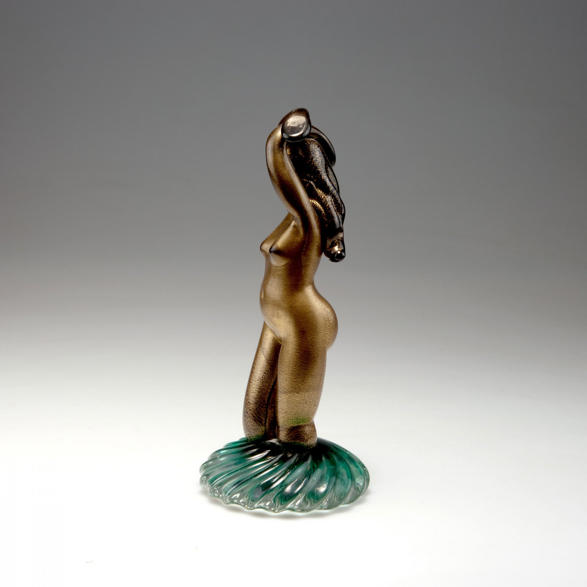 Alfredo Barbini. 'Nudo a massello', c1950. H. 24.5 cm. Made by Vetreria Alfredo Barbini. Black frit, fused burst gold foil, base clear with dark green layer. Marked: Alfredo Barbini (engraved).