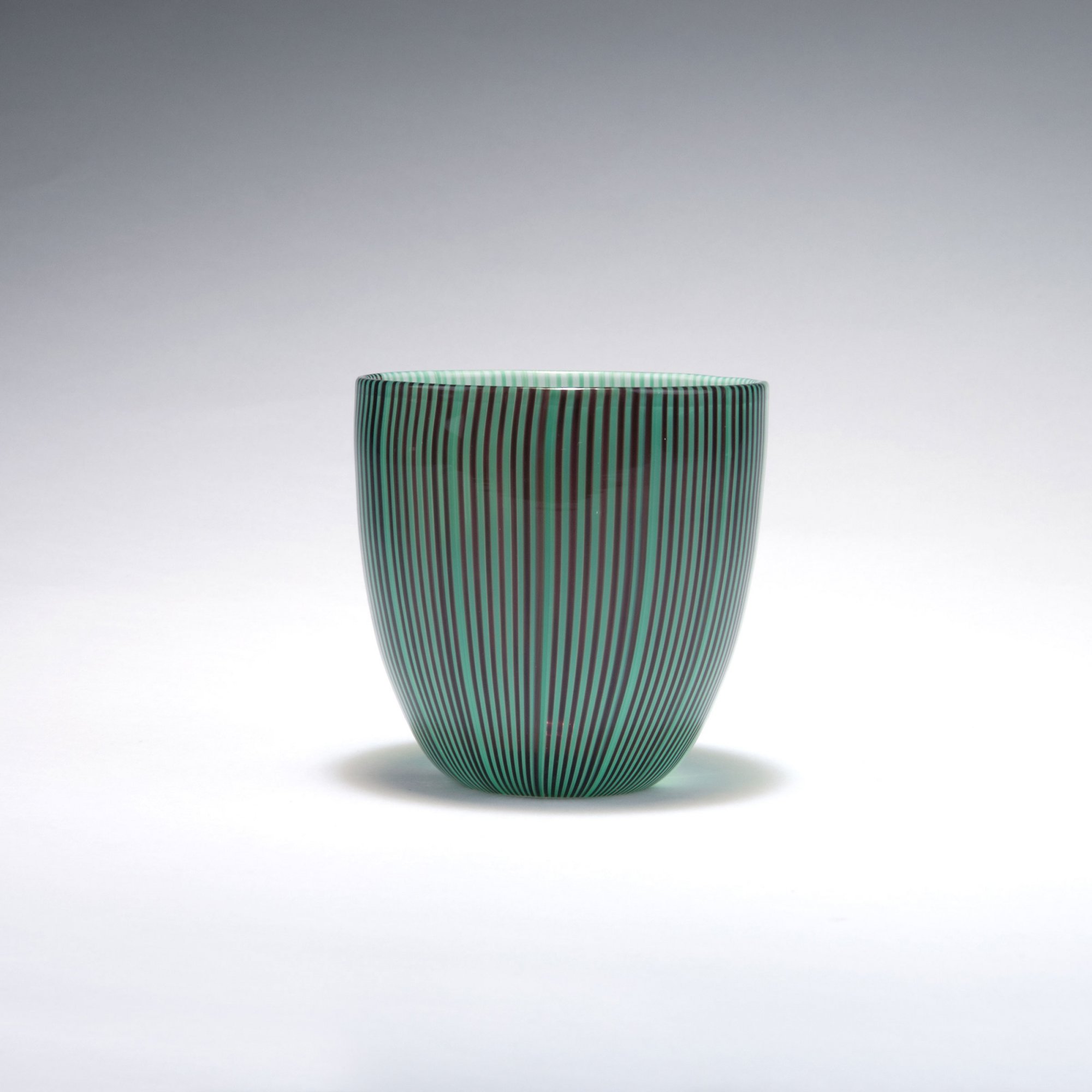 Carlo Scarpa. 'Tessuto' vase, c1940. H. 11.2 cm. Made by Venini & C., in 1998. Cased glass, clear, green, dark purple and white threads. Marked: venini Paolo Venini (sic!) 1998 (engraved).