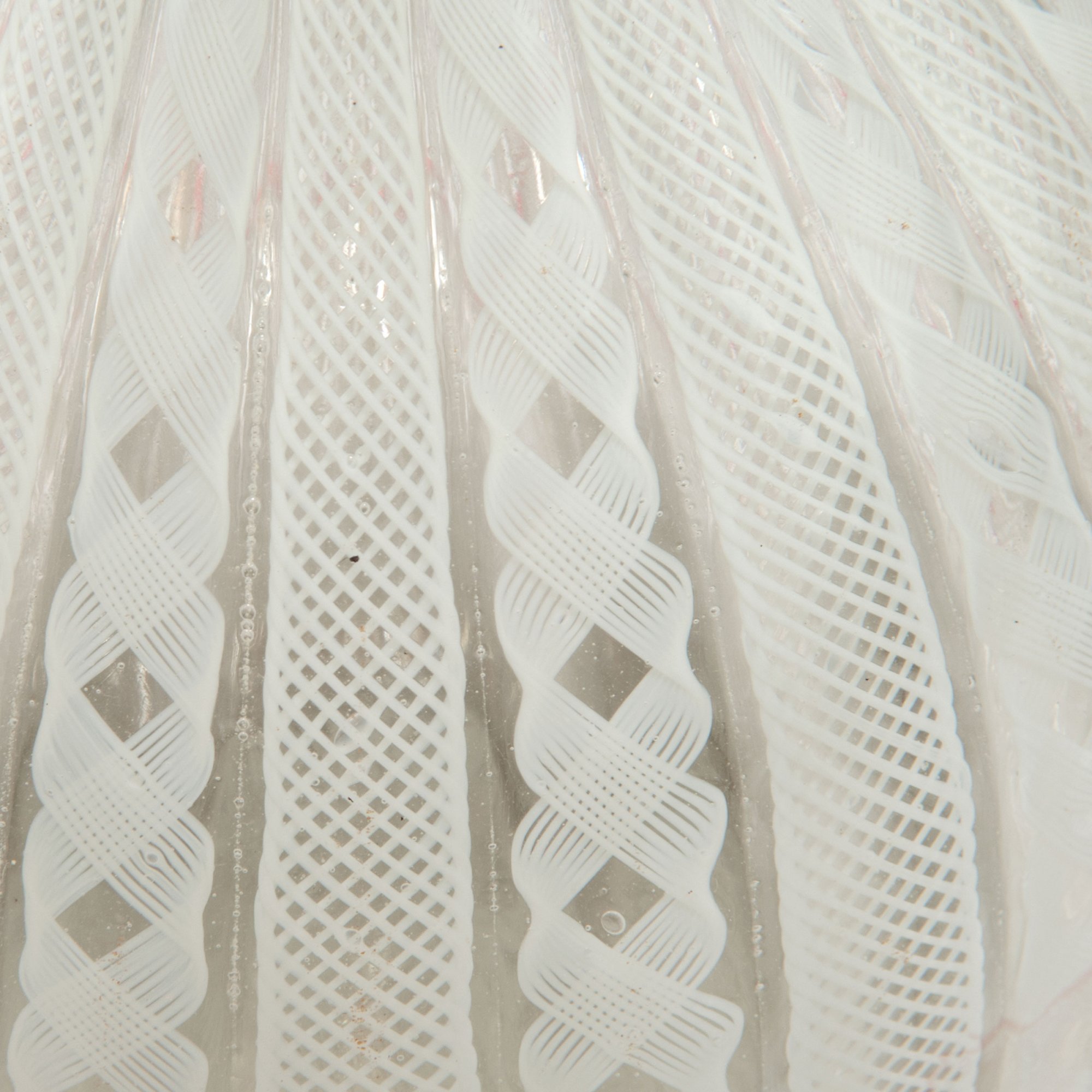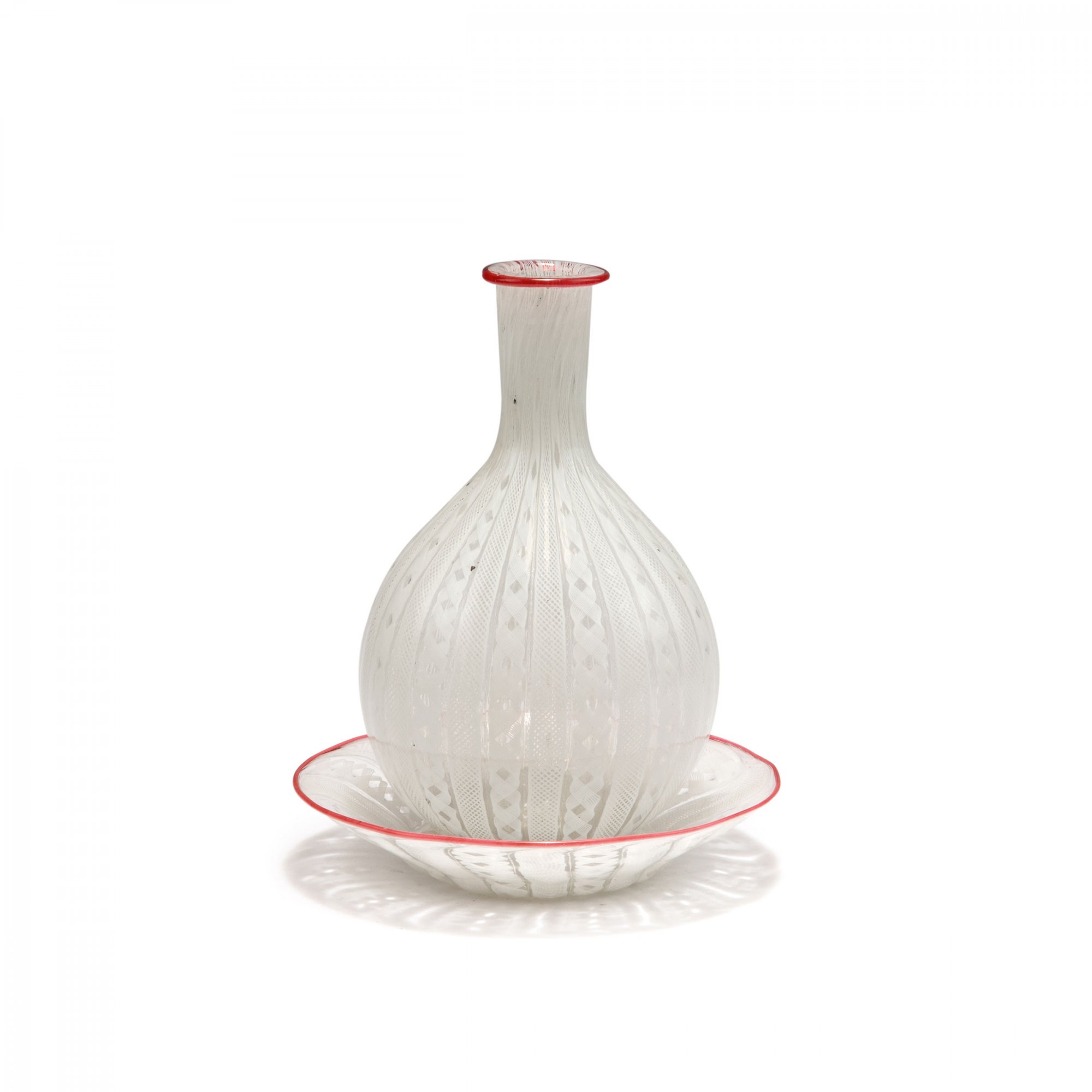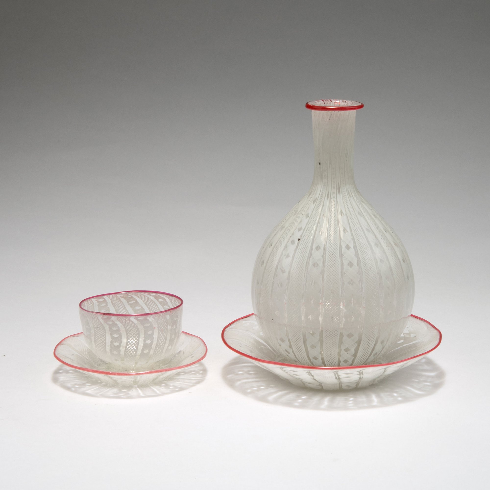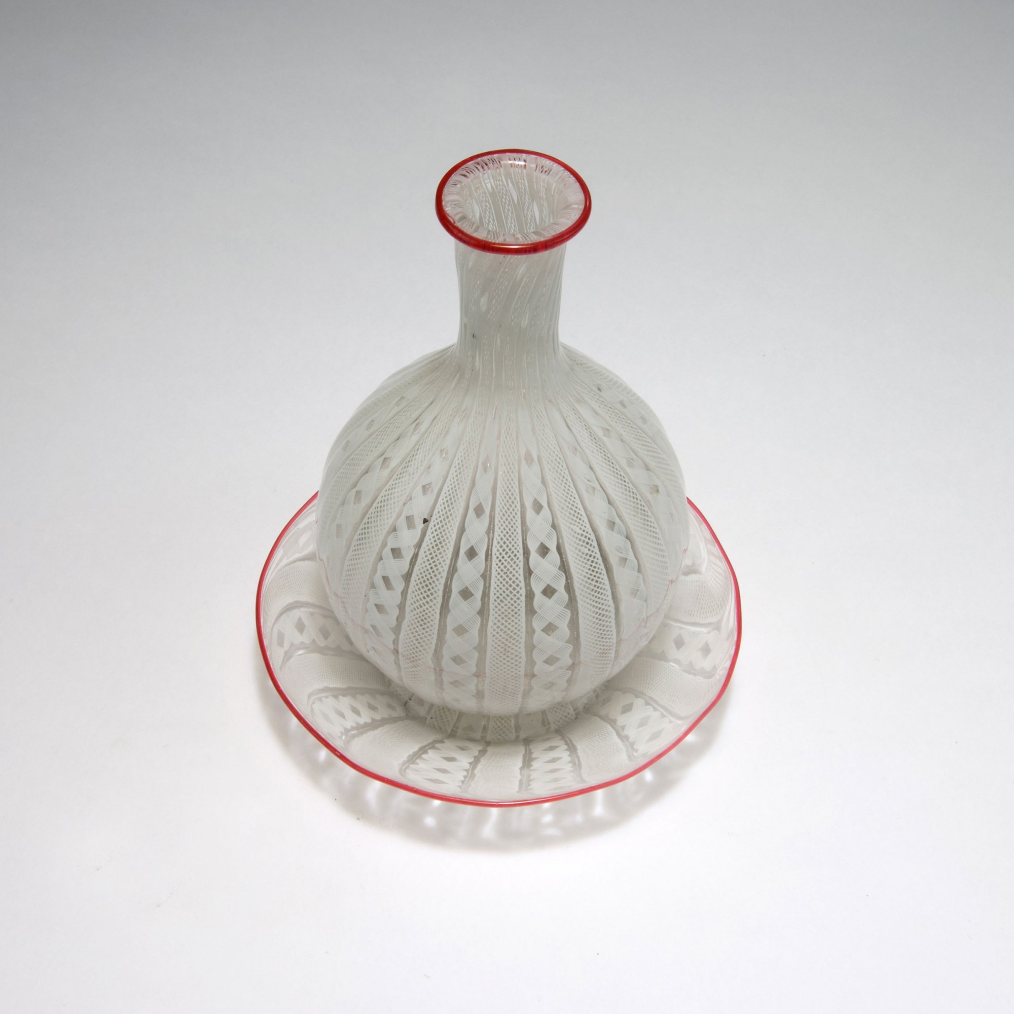 Compagnia Venezia-Murano. 'A filigrane' bottle and saucer, c1877. Bottle: H. 18.2 cm; saucer: D. 15 cm. Clear glass, fused staffs, so-called 'vetro filigranato' clear glass with white 'a retorte' spirals, white 'a reticello' web. Red threads to the rim and edge of the saucer.