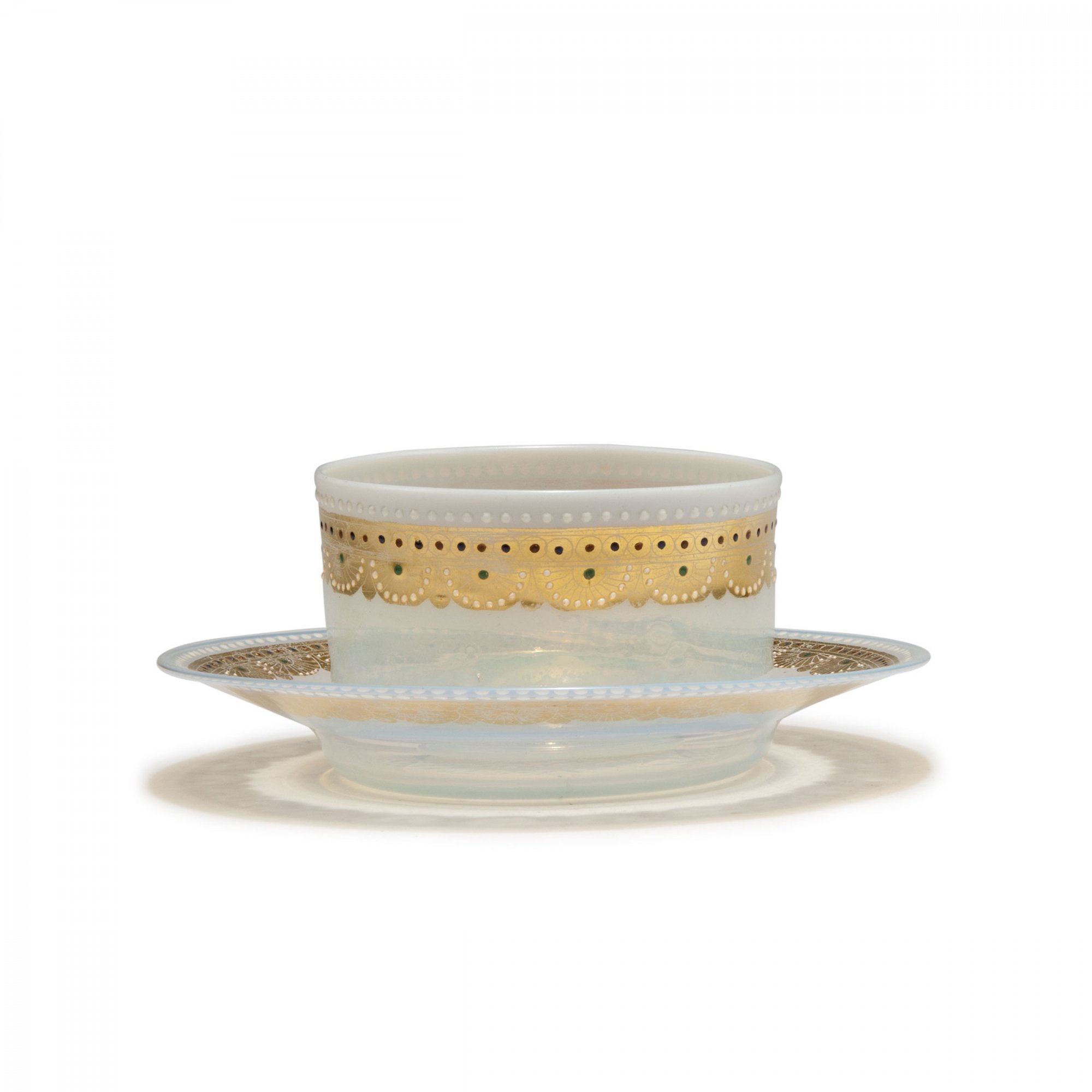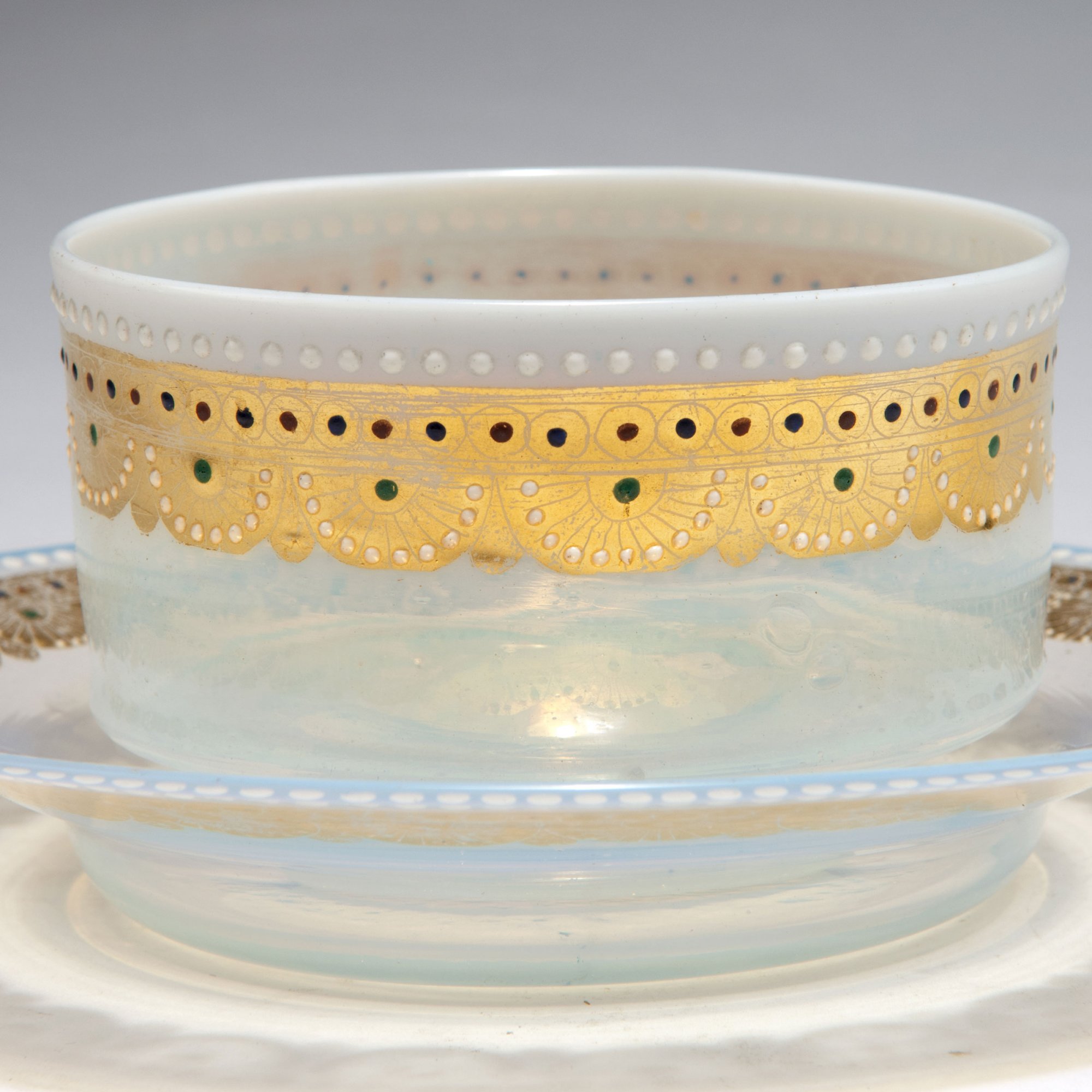 Compagnia Venezia-Murano. Bowl and saucer, c1877. Bowl: H. 6.2 cm, D. 9.8 cm; saucer: D. 16 cm. Opal glass, palmette pattern, gold, white, red, green and blue enamel. Signed: applied clear murrhine inscribed: crown CVM (red).