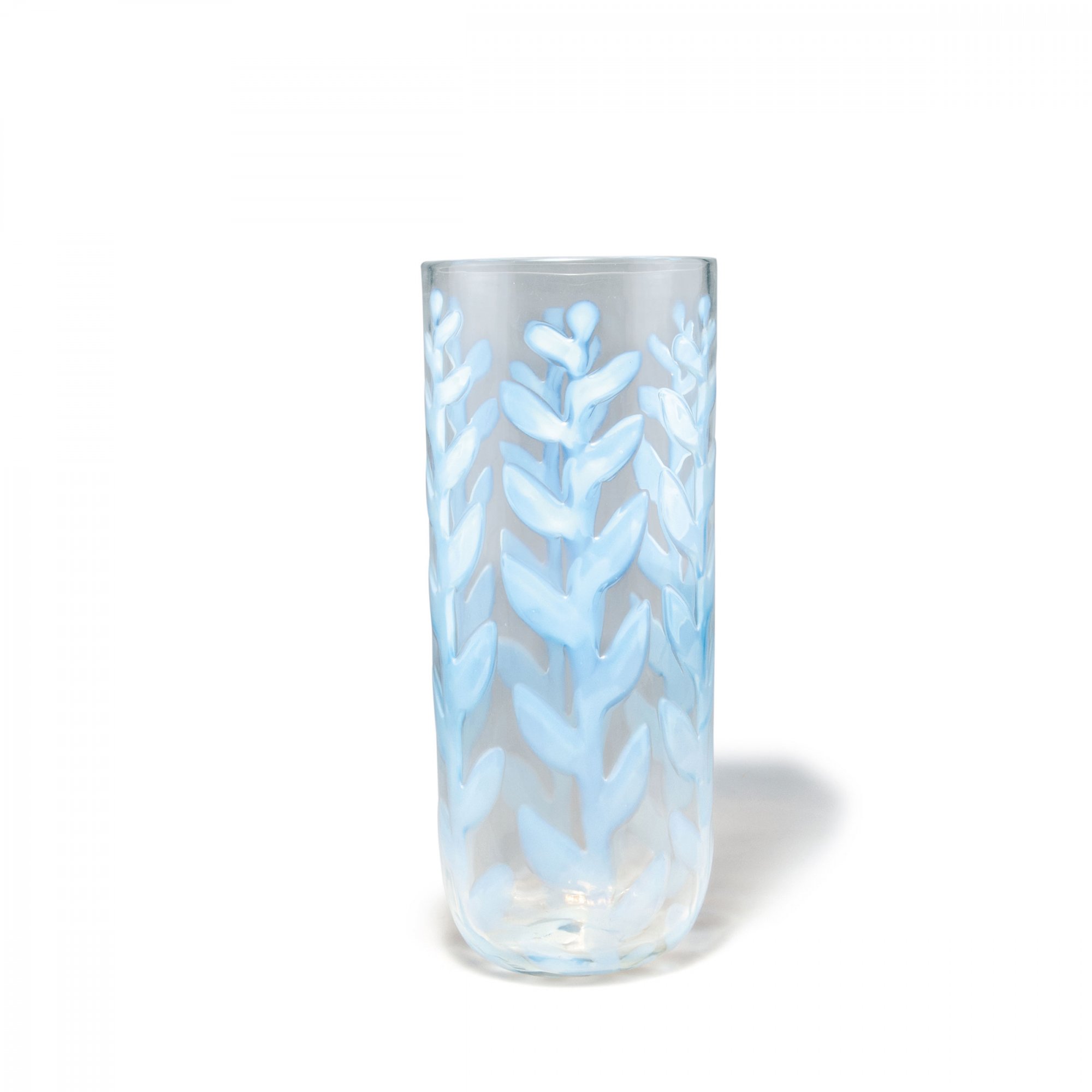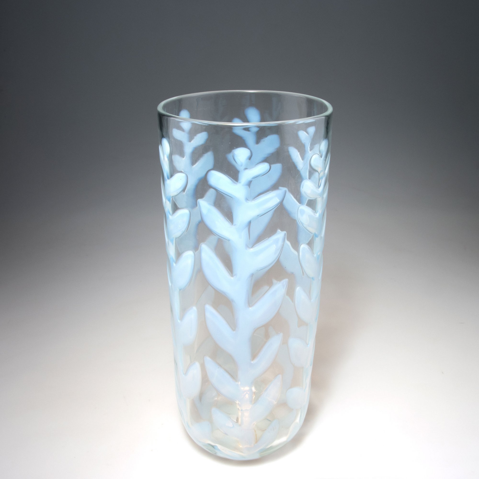 Ercole Barovier. 'Opalino a fiamma' vase, c1957. H. 40.2 cm. Made by Barovier & Toso. Clear glass, six applied flame-like ribbons, opalescent white.