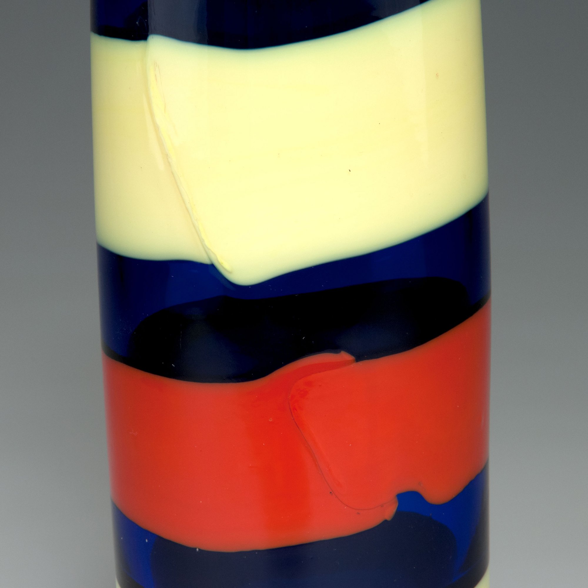 Fulvio Bianconi; Paolo Venini. 'As fasce' bottle and stopper, c1953. H. 42.3 cm. Made by Venini & C. Cased glass, clear and cobalt. Applied ribbons, red and yellow. Marked: venini murano ITALY (round acid stamp).