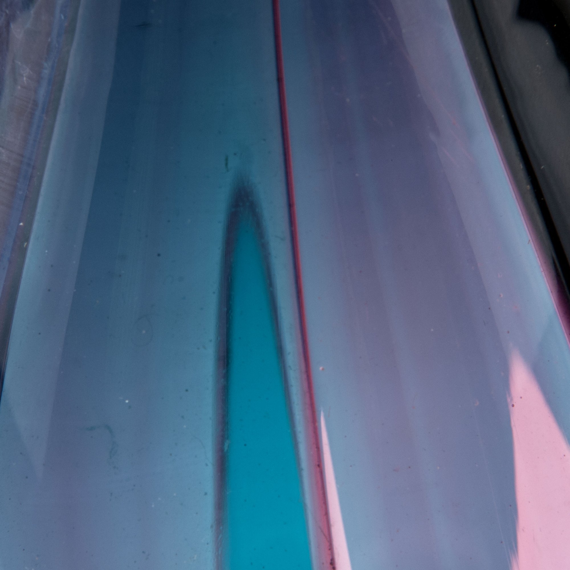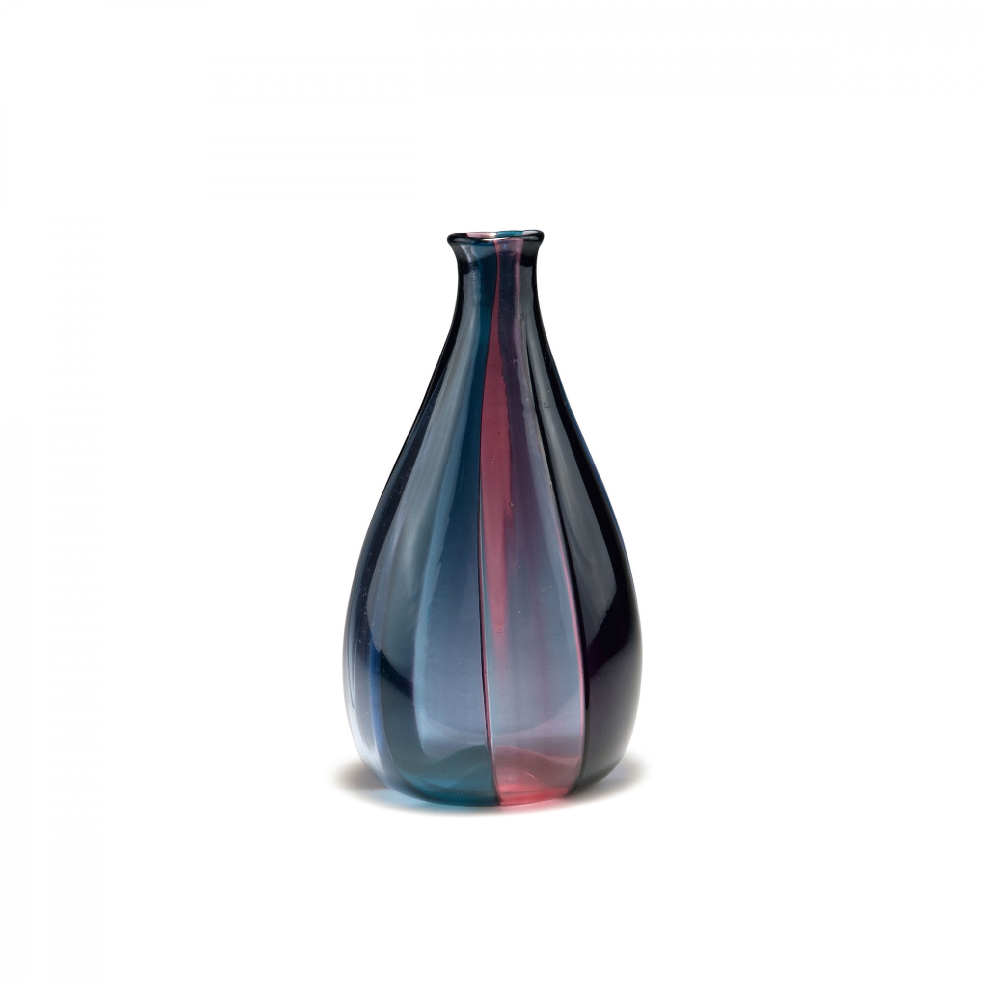 Fulvio Biaconi. 'A spicchi' vase, 1953. H. 18.8 cm. Made by Venini & C. Glass, clear with fused ribbons, purple, pink and pale blue. Marked: venini murano ITALIA (acid stamp).