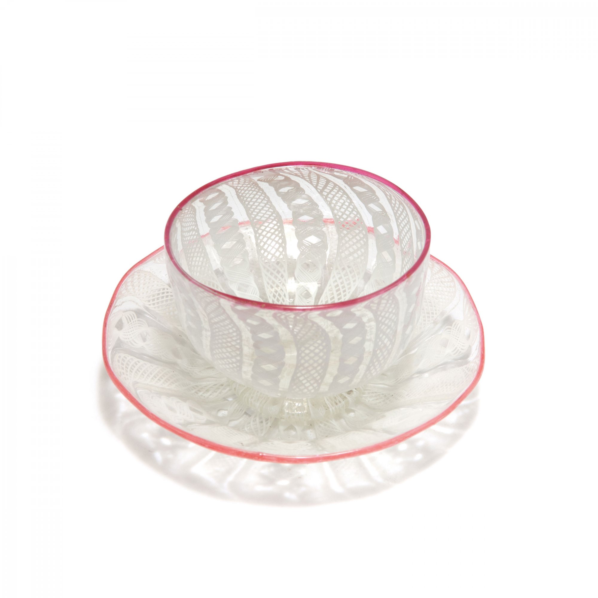 Murano. 'A filigrane' cup and saucer, 18th century. Cup: H. 50 cm, saucer: D. 10.6 cm. Fused glass rods, so-called 'vetro filigranato' of clear glass and white 'a retorte' spirals, white 'a reticello' web, red lip and rim.