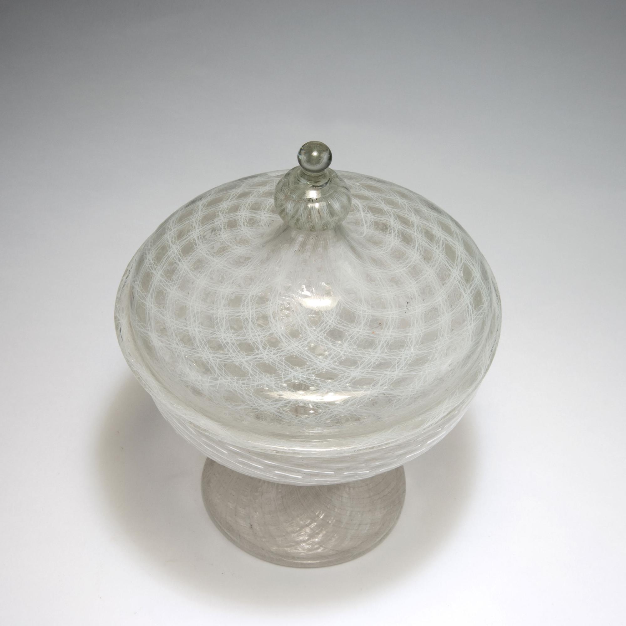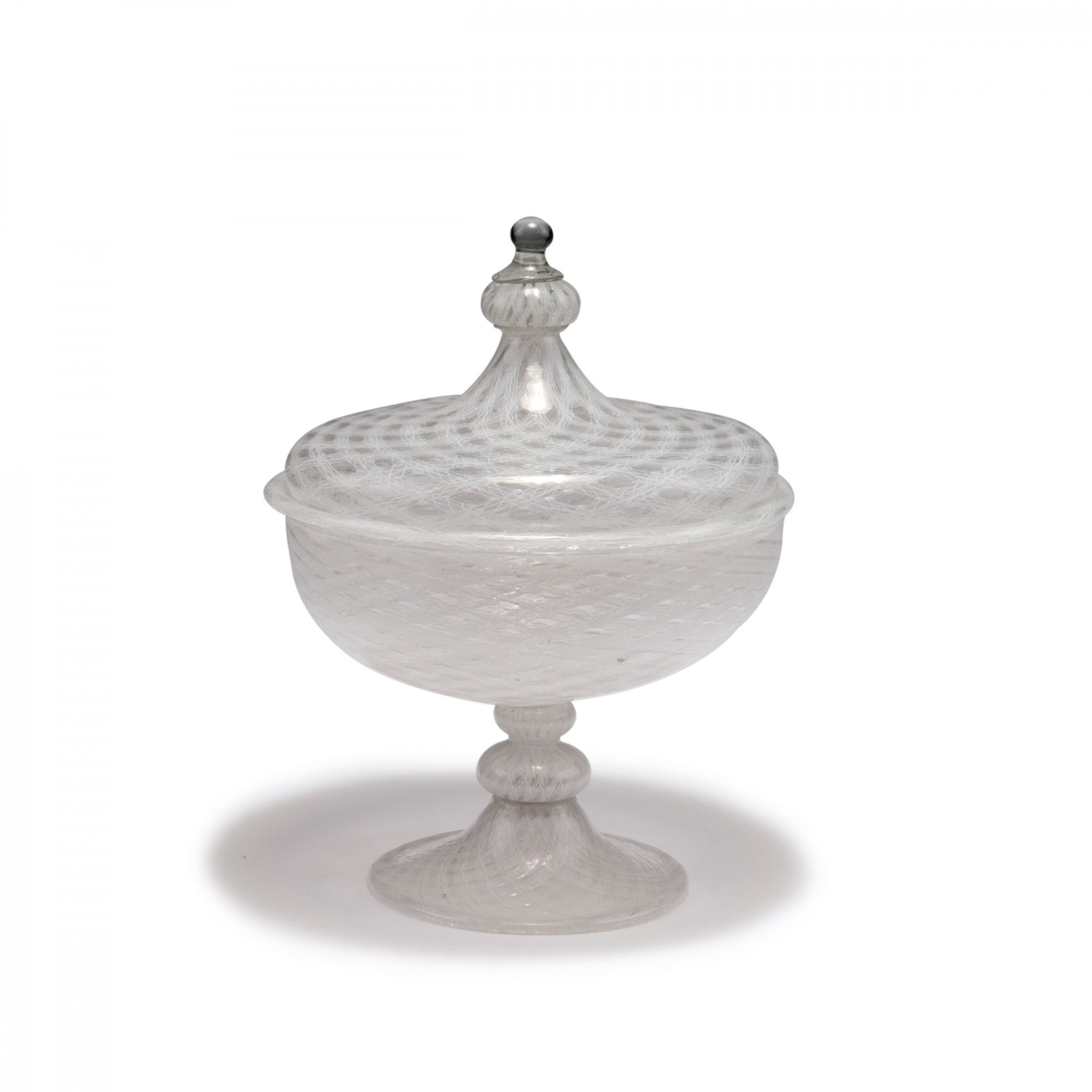 Murano. 'Filigrana a reticello' goblet with lid, 1st half of the 17th century. H. 30 cm. Clear glass, clear glass rods with included opaque white spirals and pricked air bubbles.