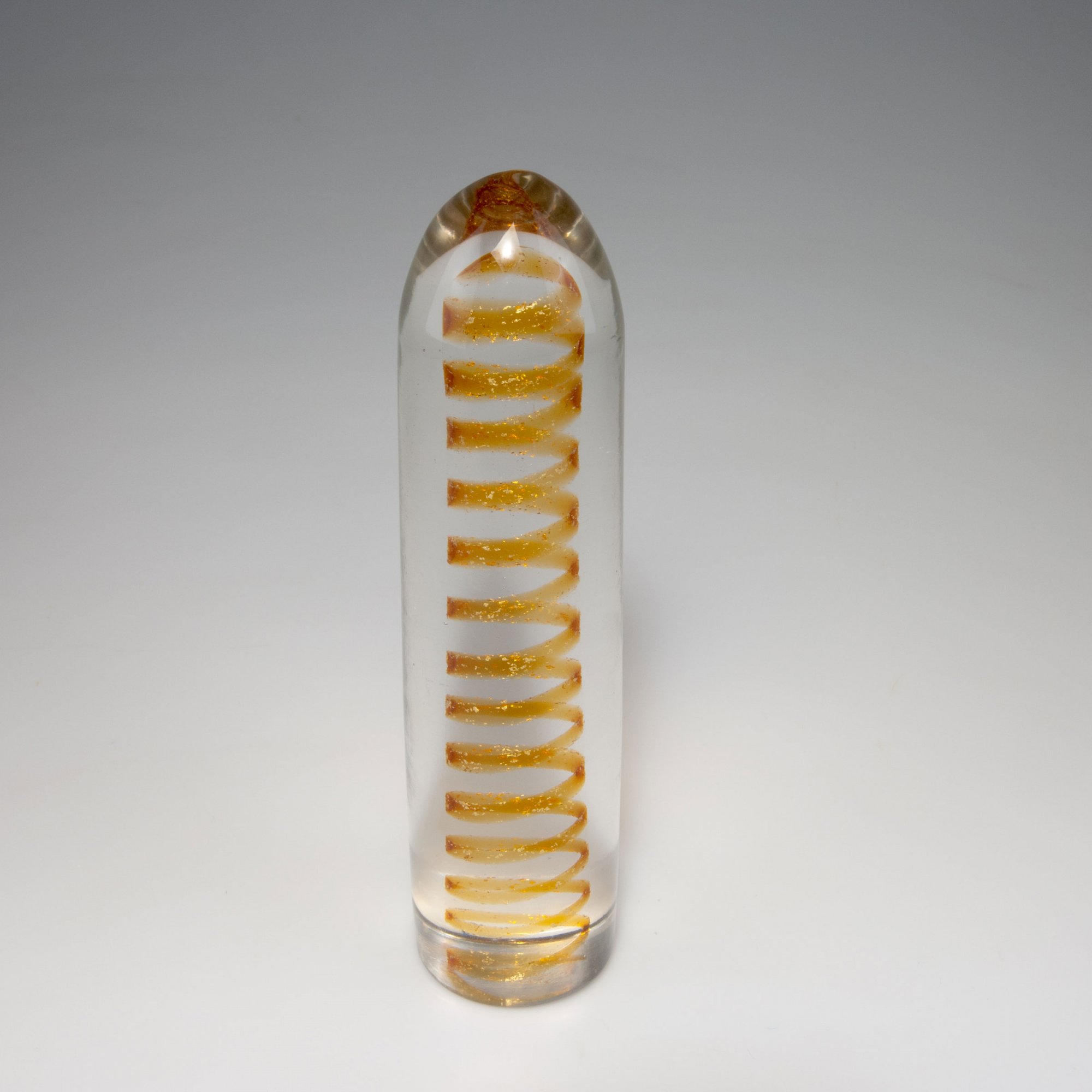 Paolo Venini. Obelisk, c1950. H. 24.5 cm. Clear glass, fused yellow spiral, burst gold foil. Marked: venini italia (engraved).