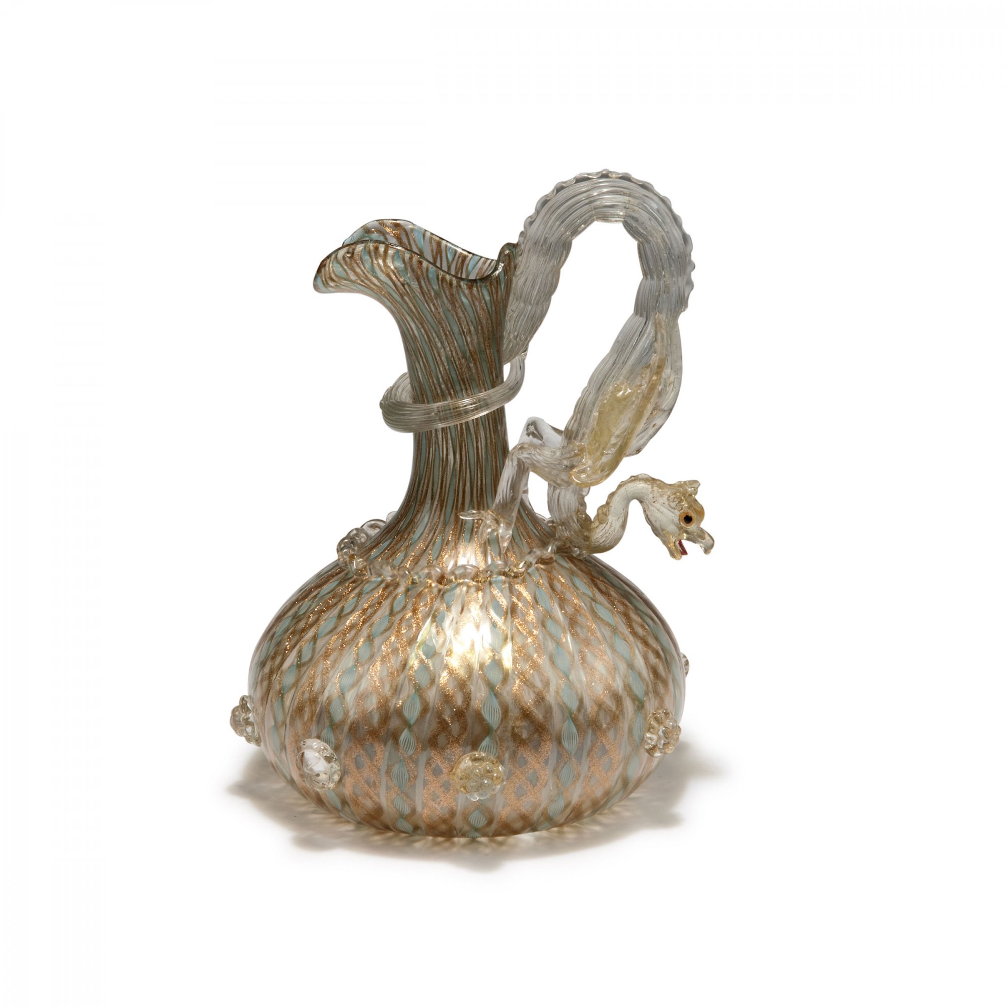 Dott. Antonio Salviati. 'A canne filigrane' jug with dragon, c1880. H. 24 cm. Clear glass, fused rods of clear glass with included aventurine spirals, blue/opaque white threads with aventurine ribbons. Applied clear berries, clear ruff, dragon clear with burst gold foil. Eyes and tongue painted.