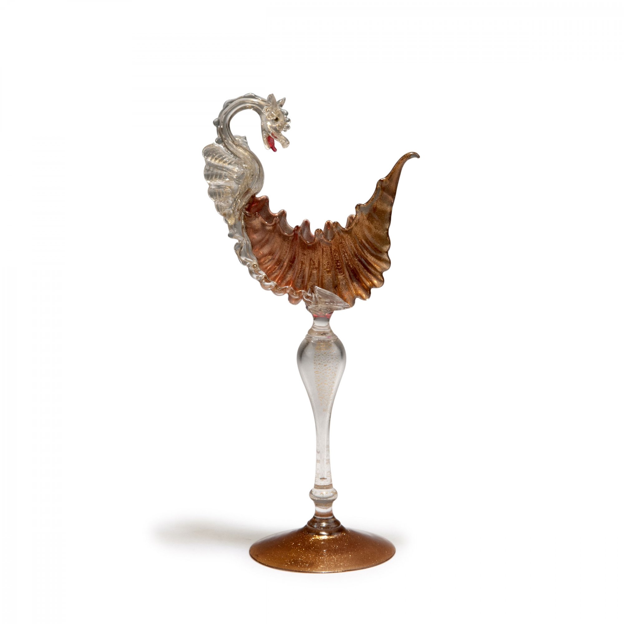 Dott. Antonio Salviati & C. 'Avventurino' goblet with dragon, 1890. H. 29 cm. Clear glass, burst gold foil, foot and cup with included aventurine, black/yellow murrhines, tongue opaque white and pink.