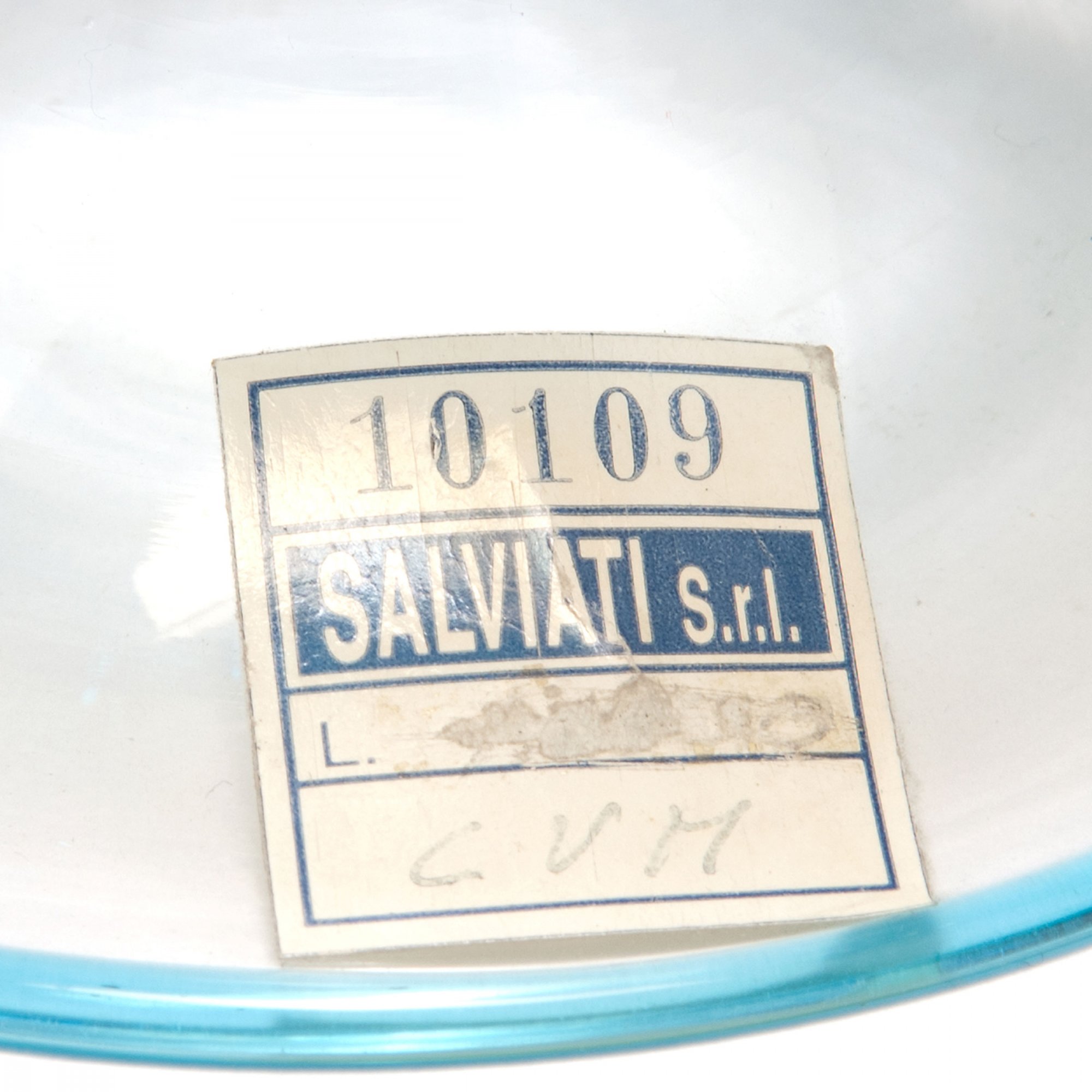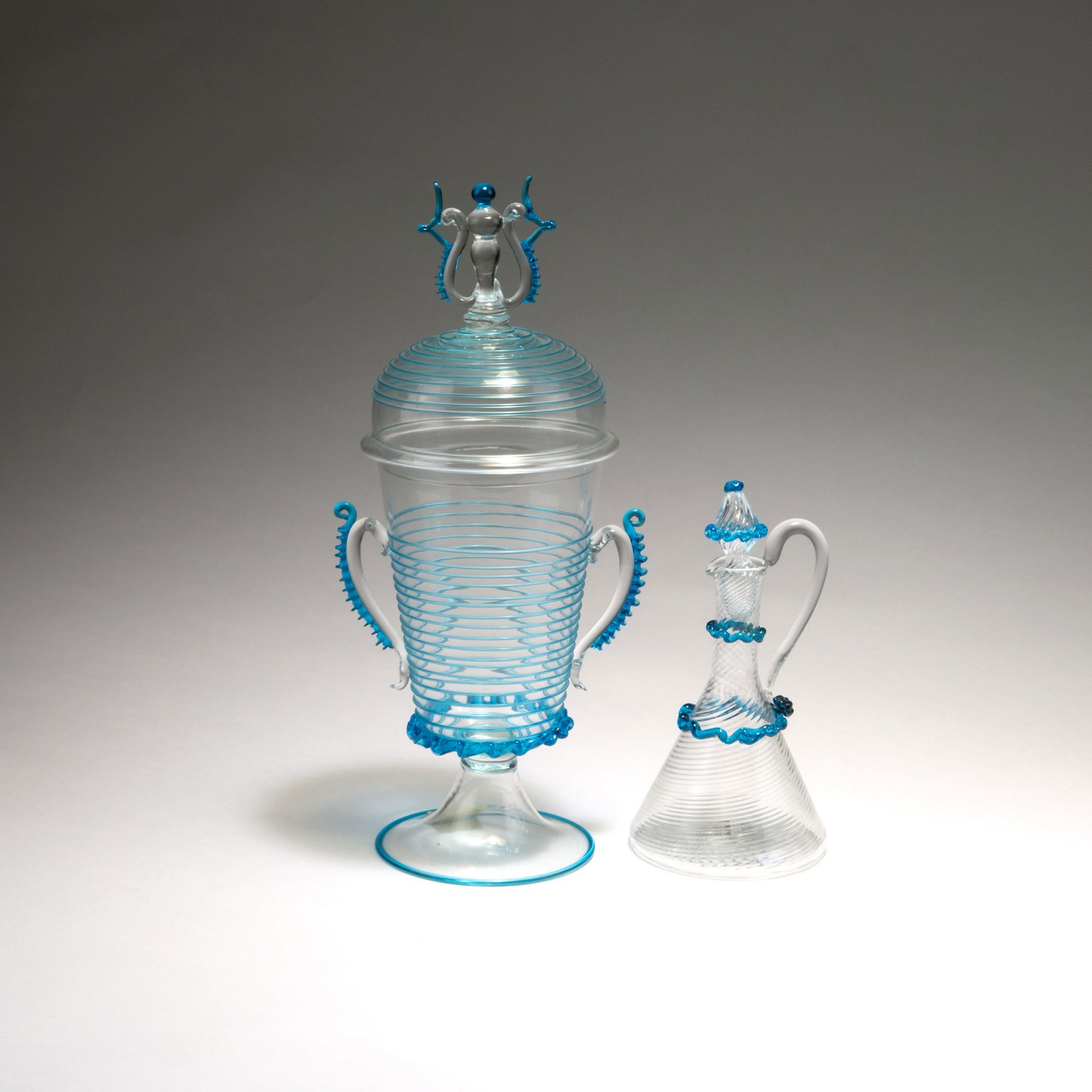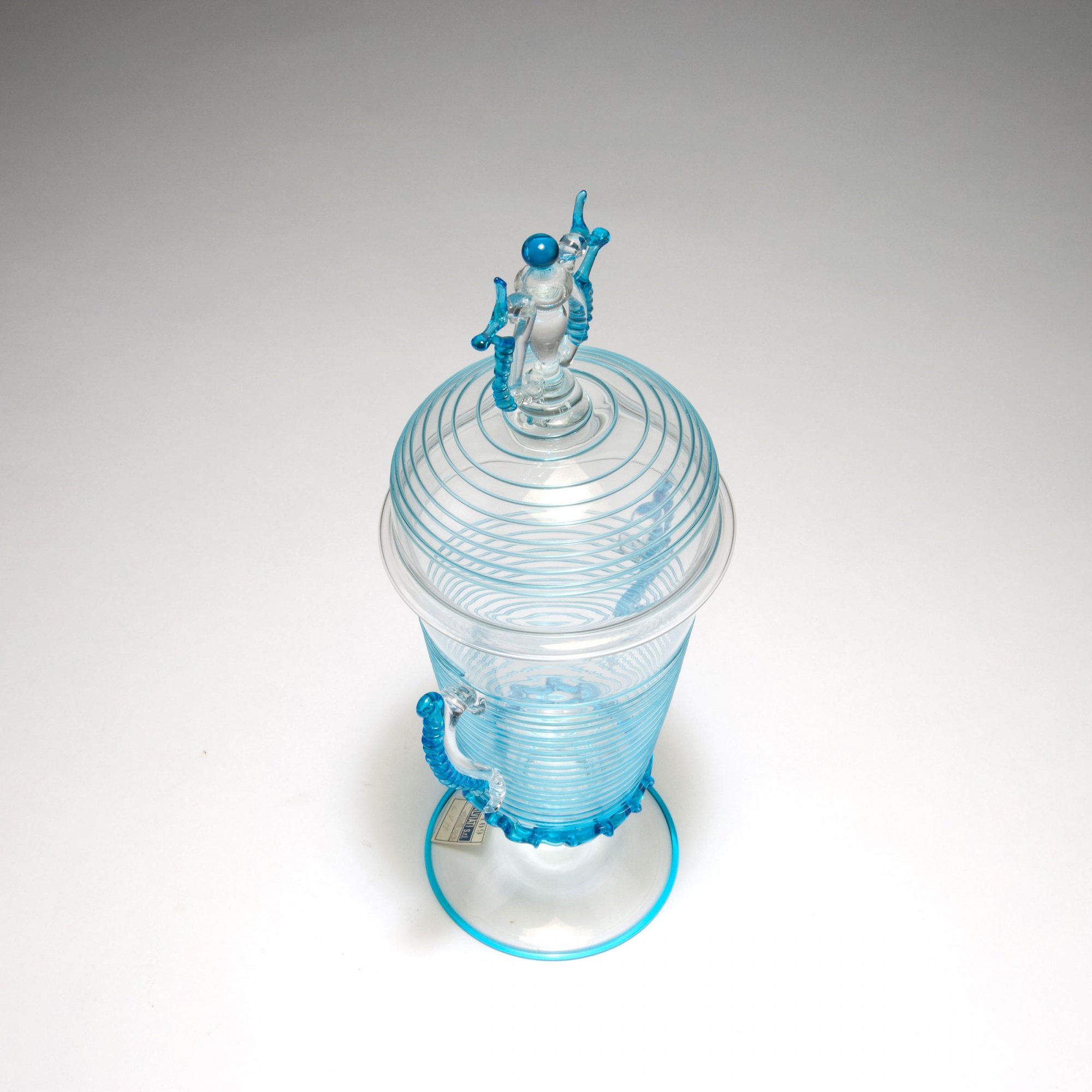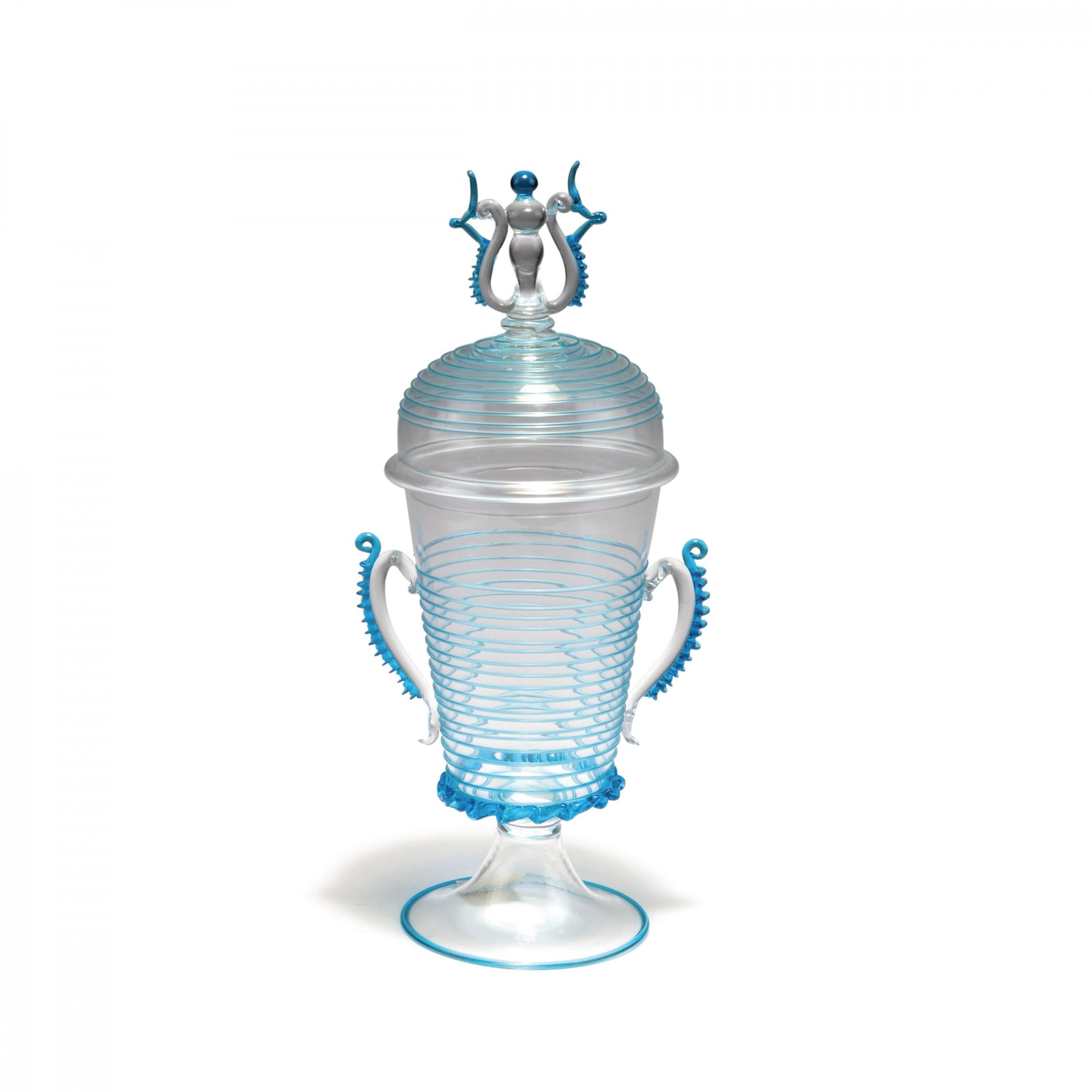 Salviati s.r.l. Covered goblet, beginning of the 20th century. H. 32.2 cm. Clear glass, blue spirals, wave applications. Marked: Maker's decal.