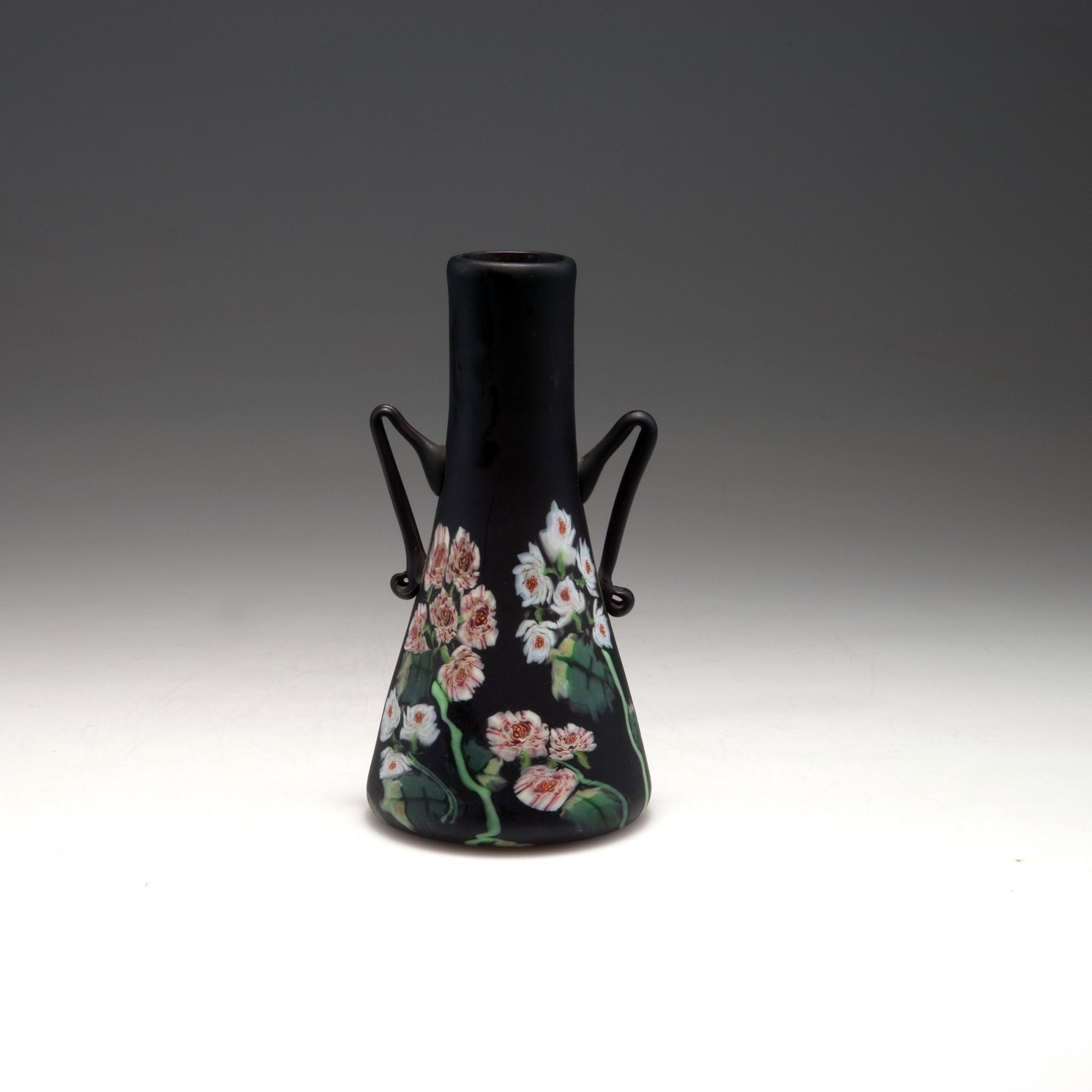 Fratelli Toso. 'Murrine' vase with handles, c1920. H. 15.1 cm. Purple glass, fused murrhines, flower threads.