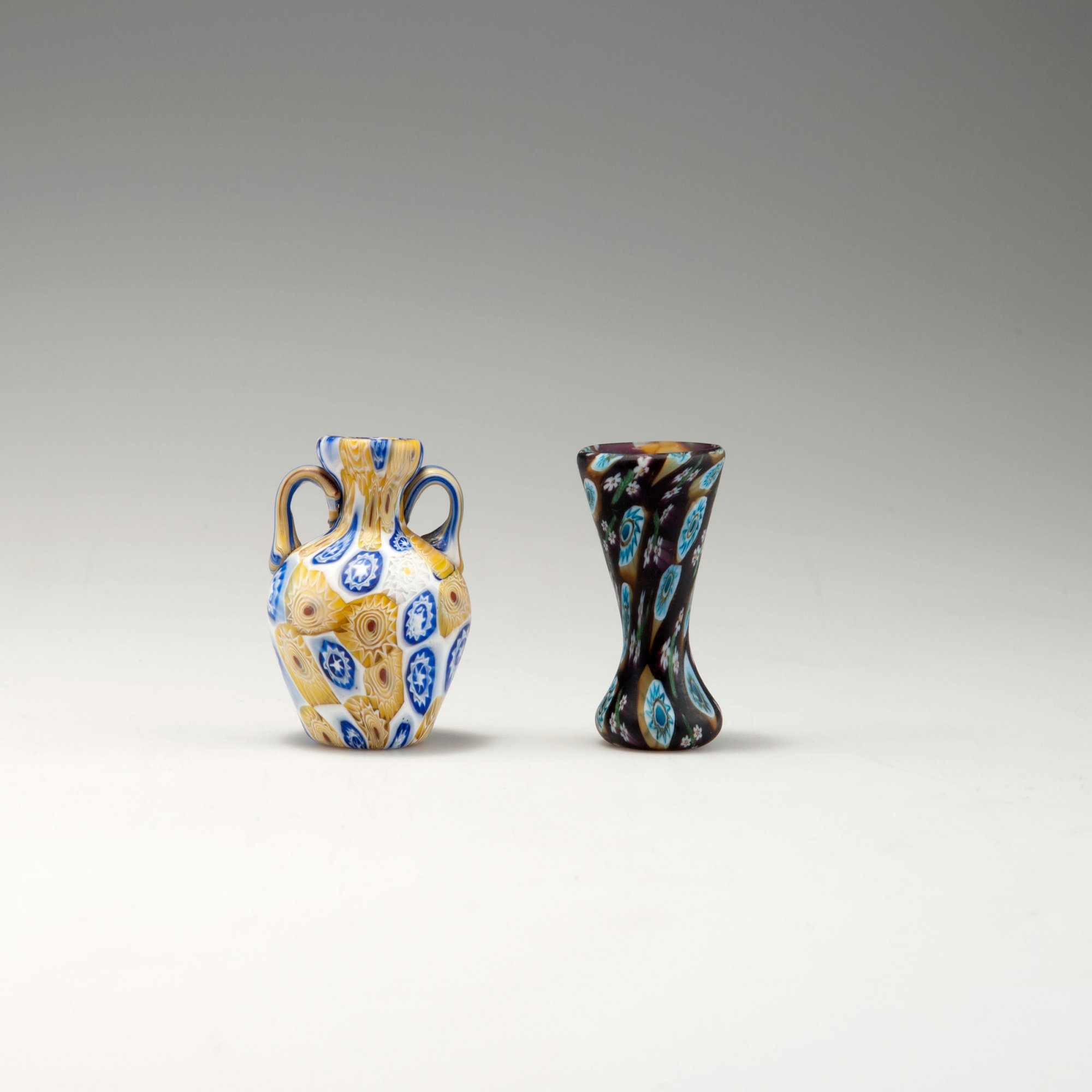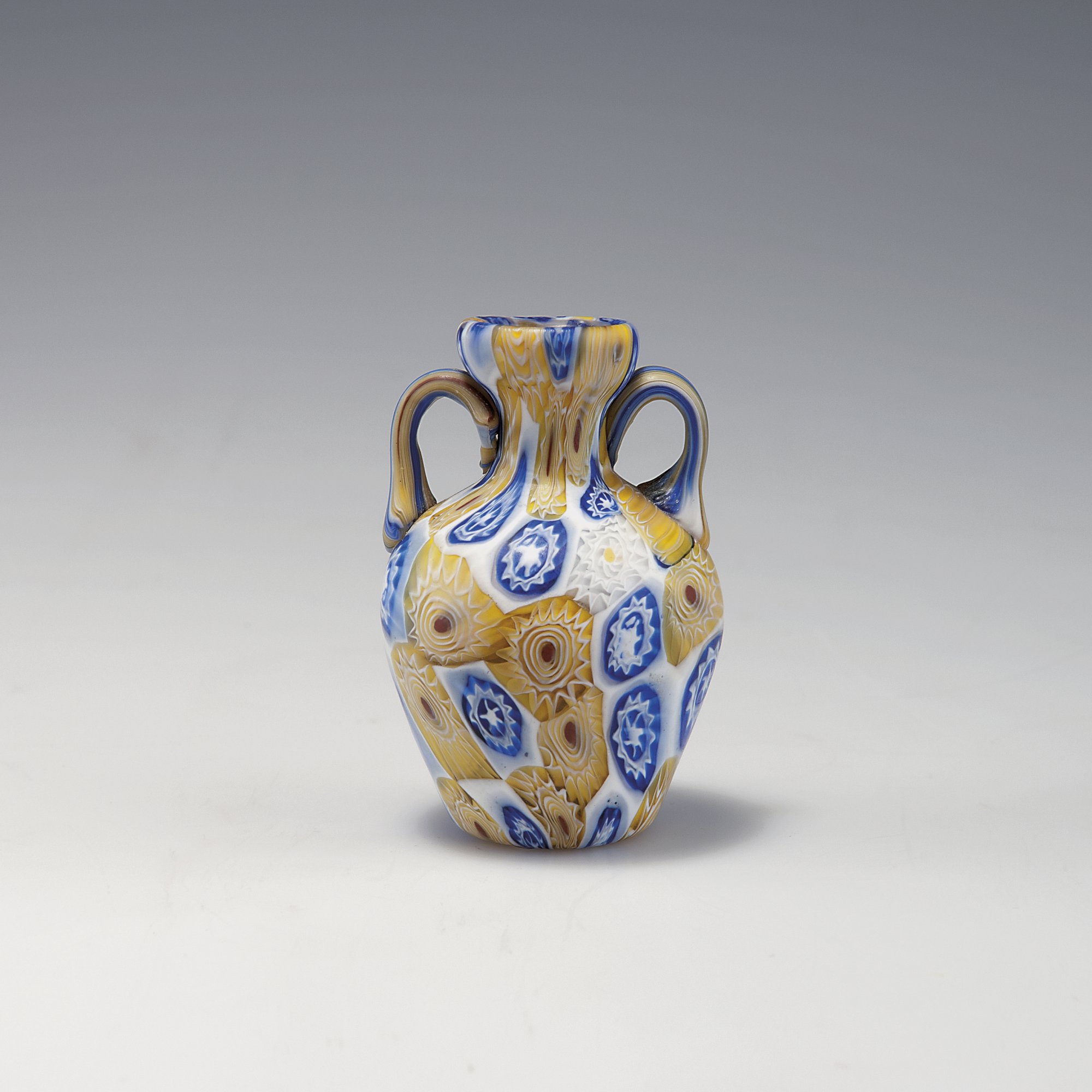 Fratelli Toso. Small 'Murrine' vase with handles, c1910. H. 7.4 cm. Clear glass, fused flower murrhines, yellow, blue, white and pink.