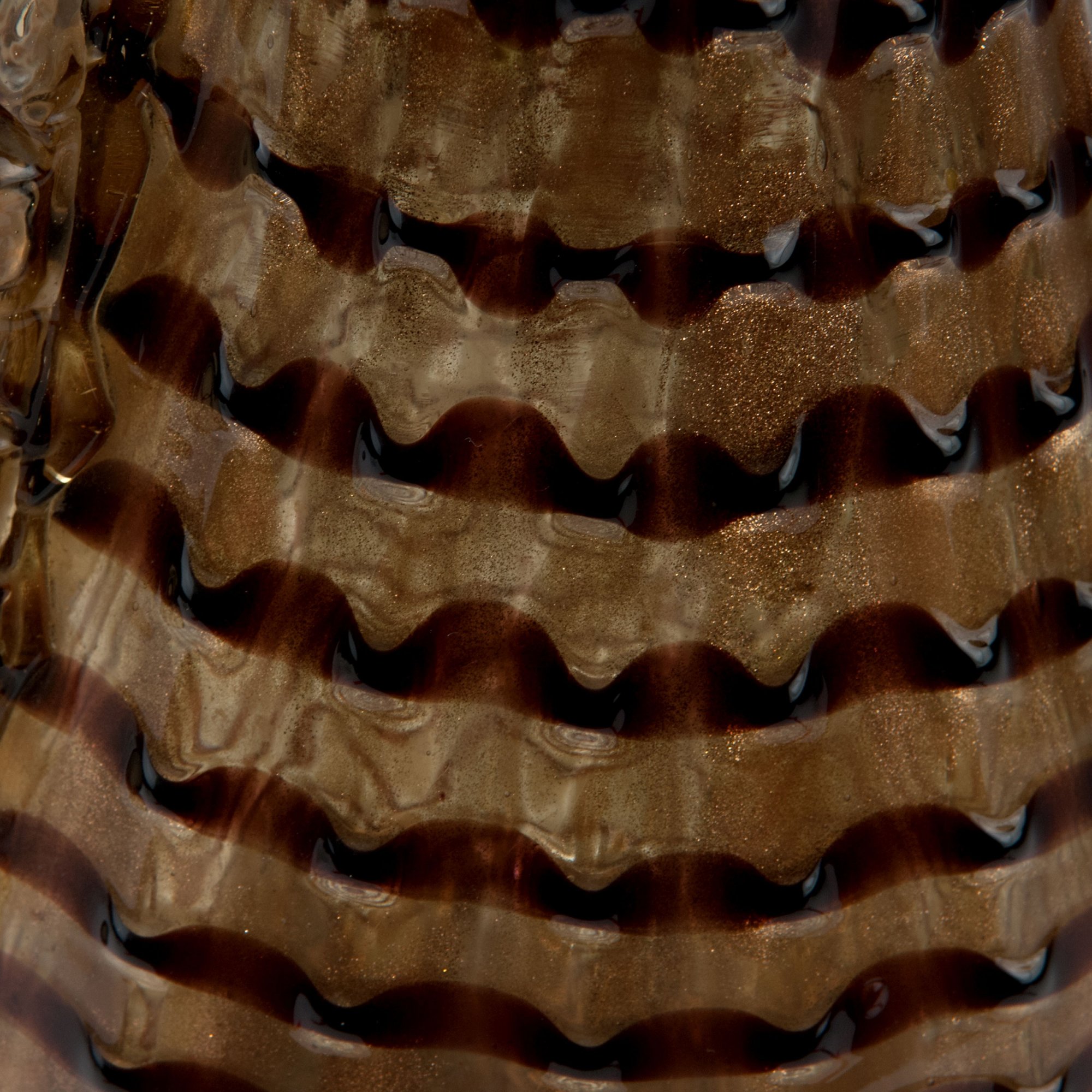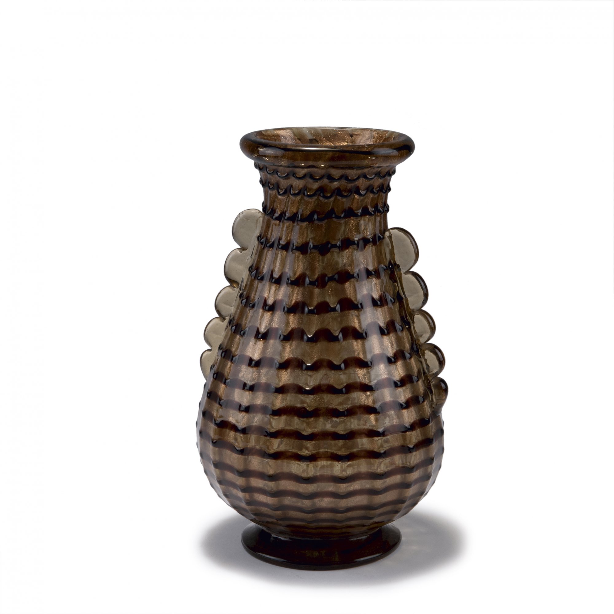 Ercole Barovier. 'Avventurina' vase, c1936. H. 29 cm. Made by Ferro Toso Barovier. Clear optically blown cased glass, included aventurine powders, combed dark purple threads. Handles and rim amber.